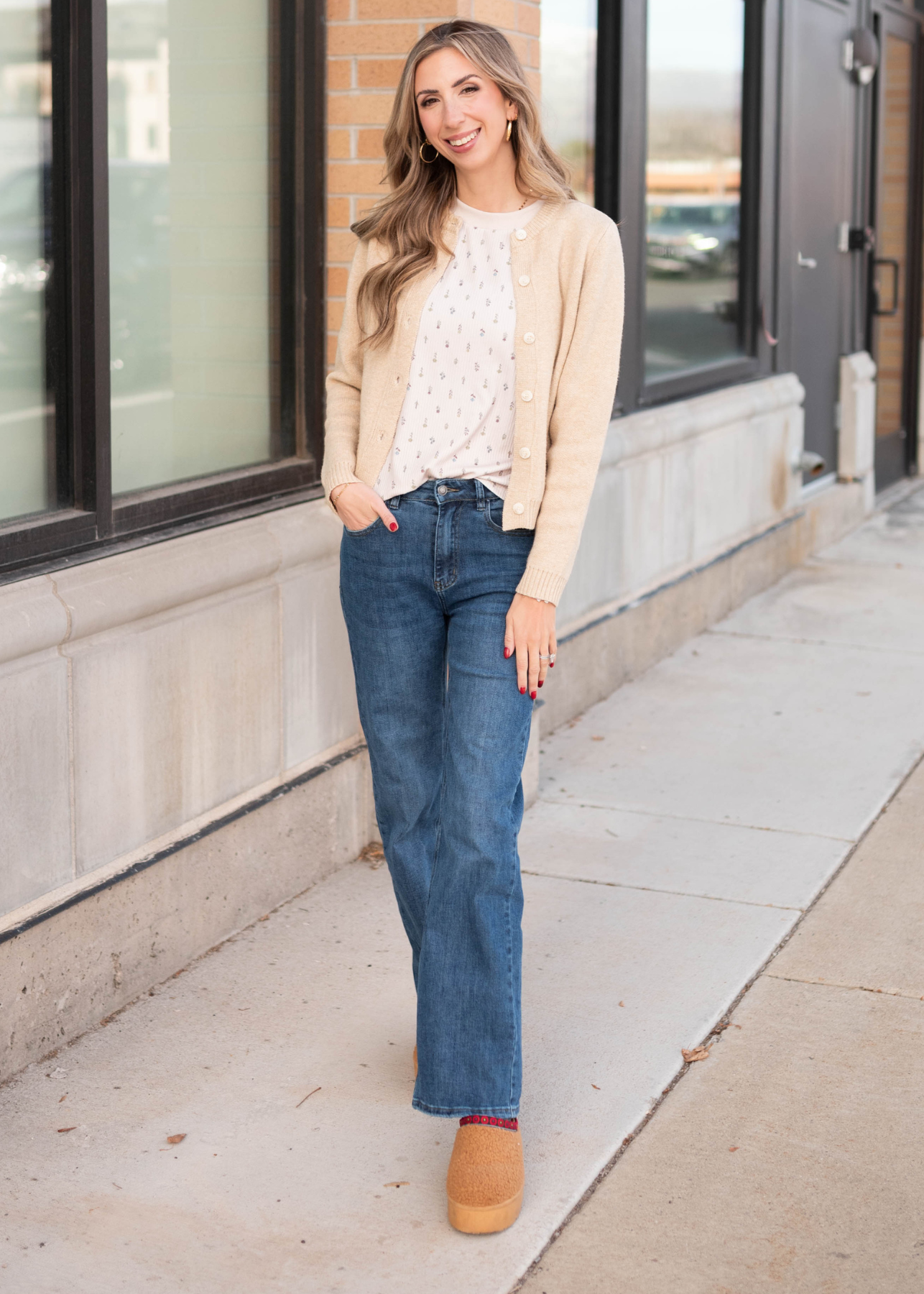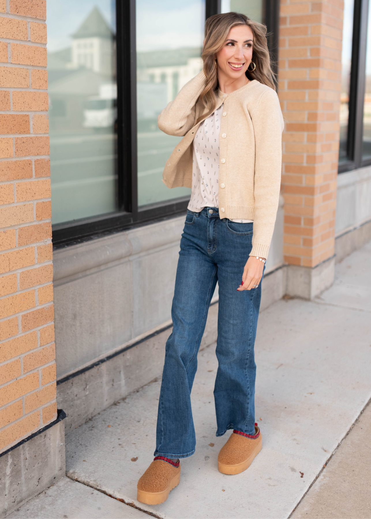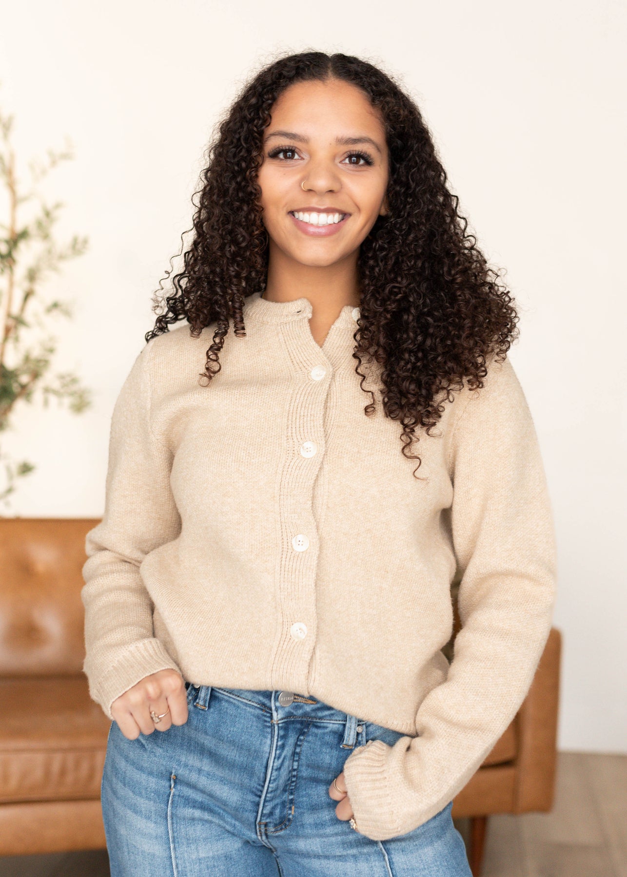 White buttons on the taupe cardigan