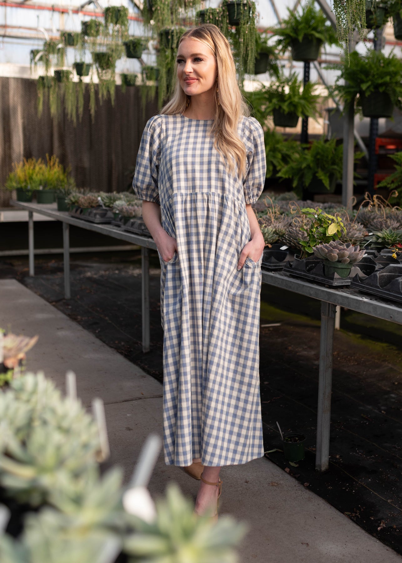 Puff short sleeves on the modest blue gingham dress with pockets sold and Lena Layne