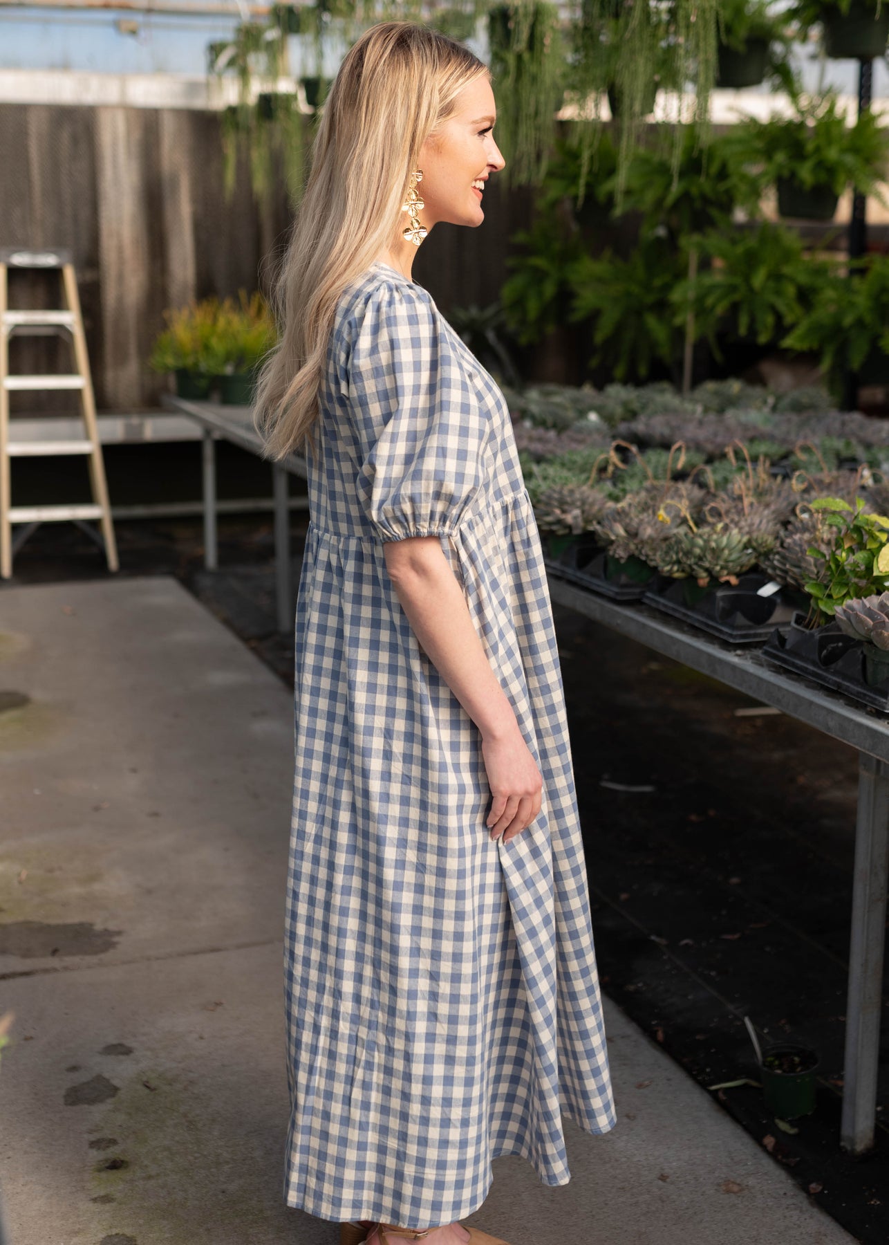 Side view of the blue gingham dress