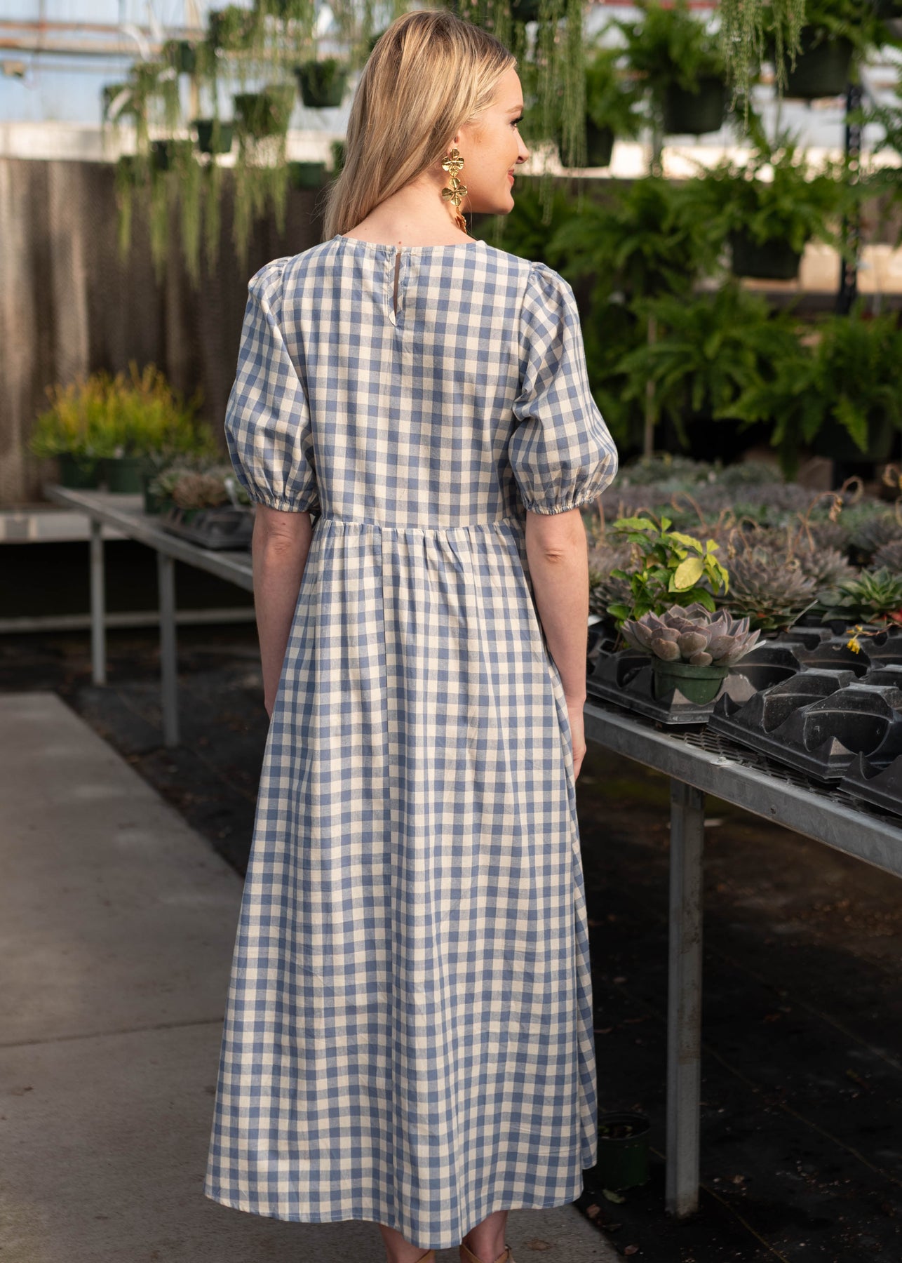 Back view of the blue gingham dress