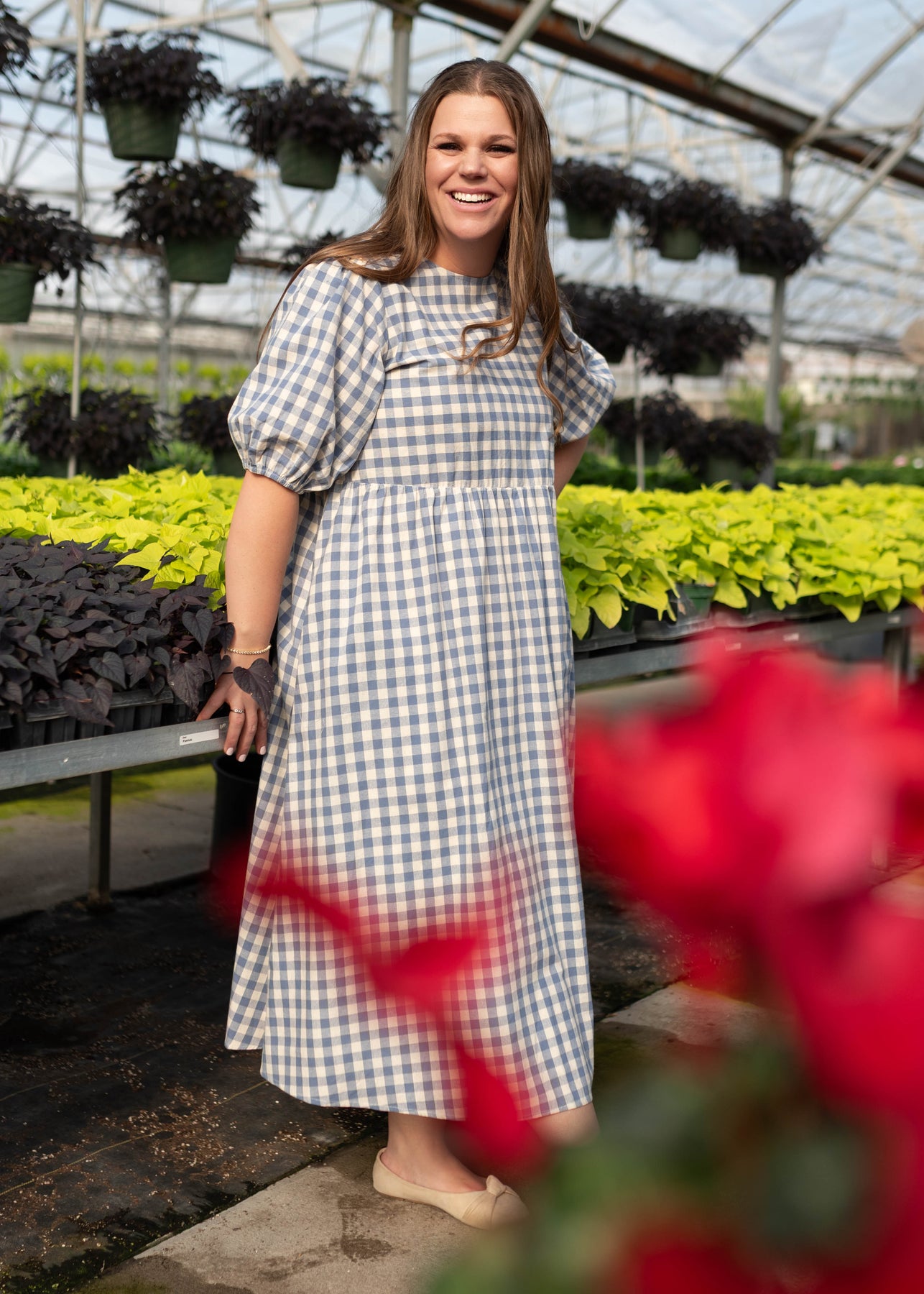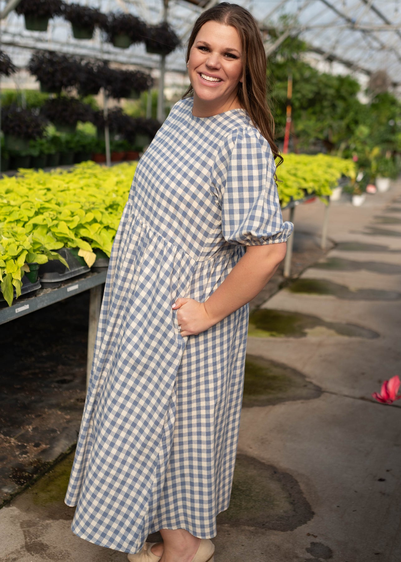 Side view of the modest  blue gingham dress