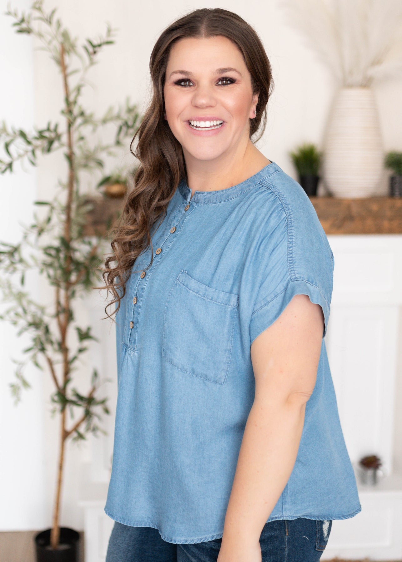 The Brynlee Blue Chambray Top is an easy, everyday essential with a timeless feel. Crafted from soft chambray, it’s lightweight and breathable with a relaxed look that works year-round. The partial button-up front and short sleeves keep it casual and effortless, making it a piece you’ll reach for again and again.