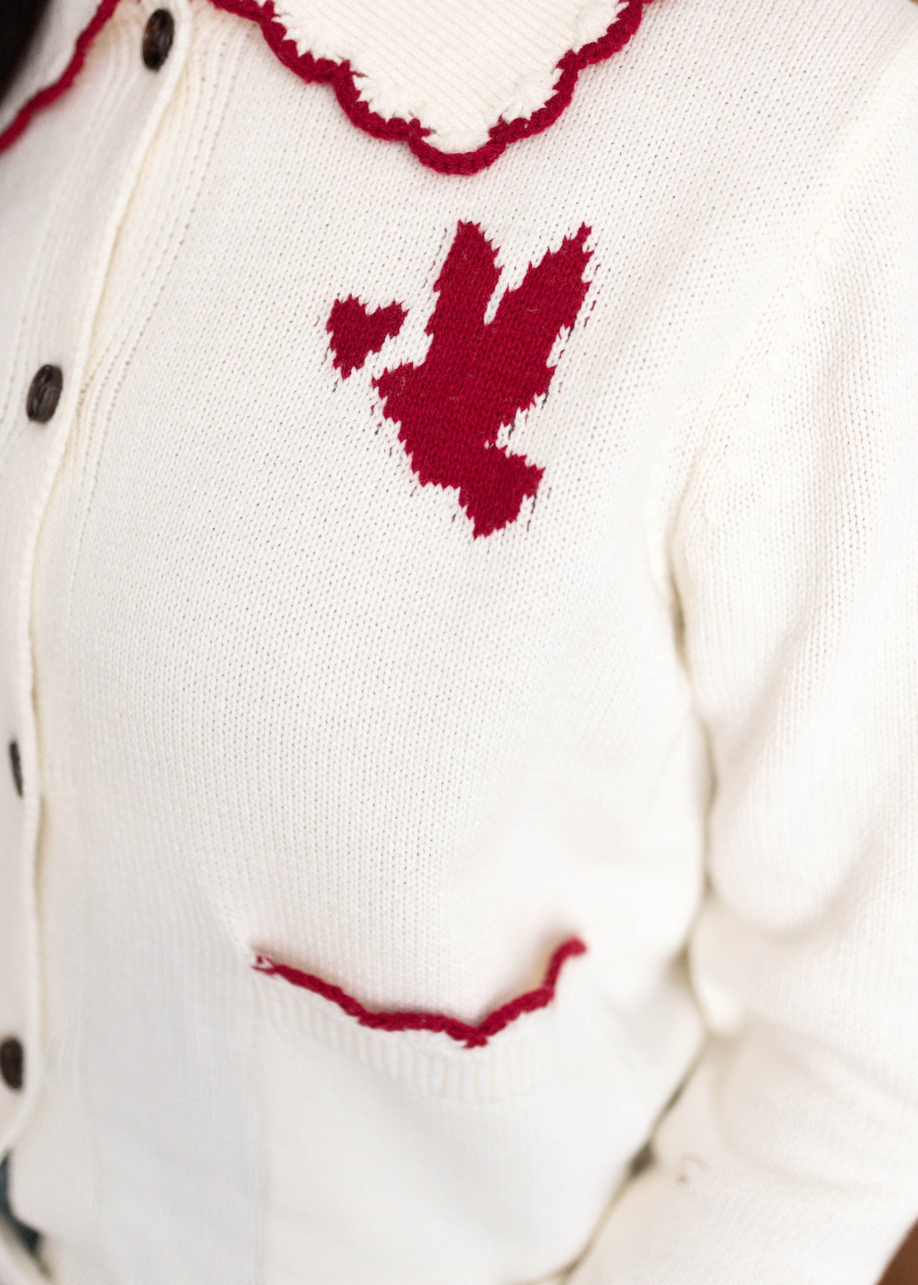 The Jane Ivory Heart Cardigan is a cozy-meets-cute layer that adds the sweetest pop of personality to any outfit. Featuring a soft ivory base with bold red trim and a charming dove-and-heart graphic, this cardigan feels playful yet polished. With a buttery soft feel, lots of stretch, and functional details, it’s the kind of piece that makes even simple outfits feel special.