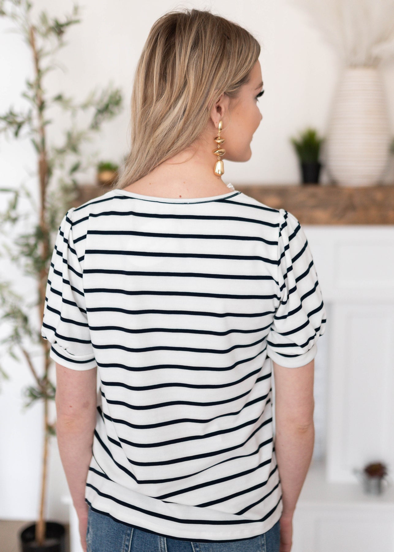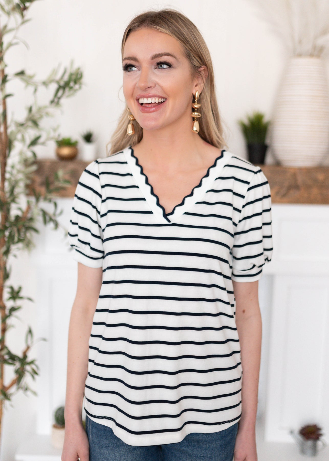 The Sydney Navy Stripe Top is a playful yet polished piece you’ll love for everyday wear. Featuring a white base with navy stripes, a V-neckline with scalloped trim, and sweet puff sleeves, this top combines comfort and style effortlessly. With just the right amount of stretch, it’s an easy choice for layering or wearing on its own.