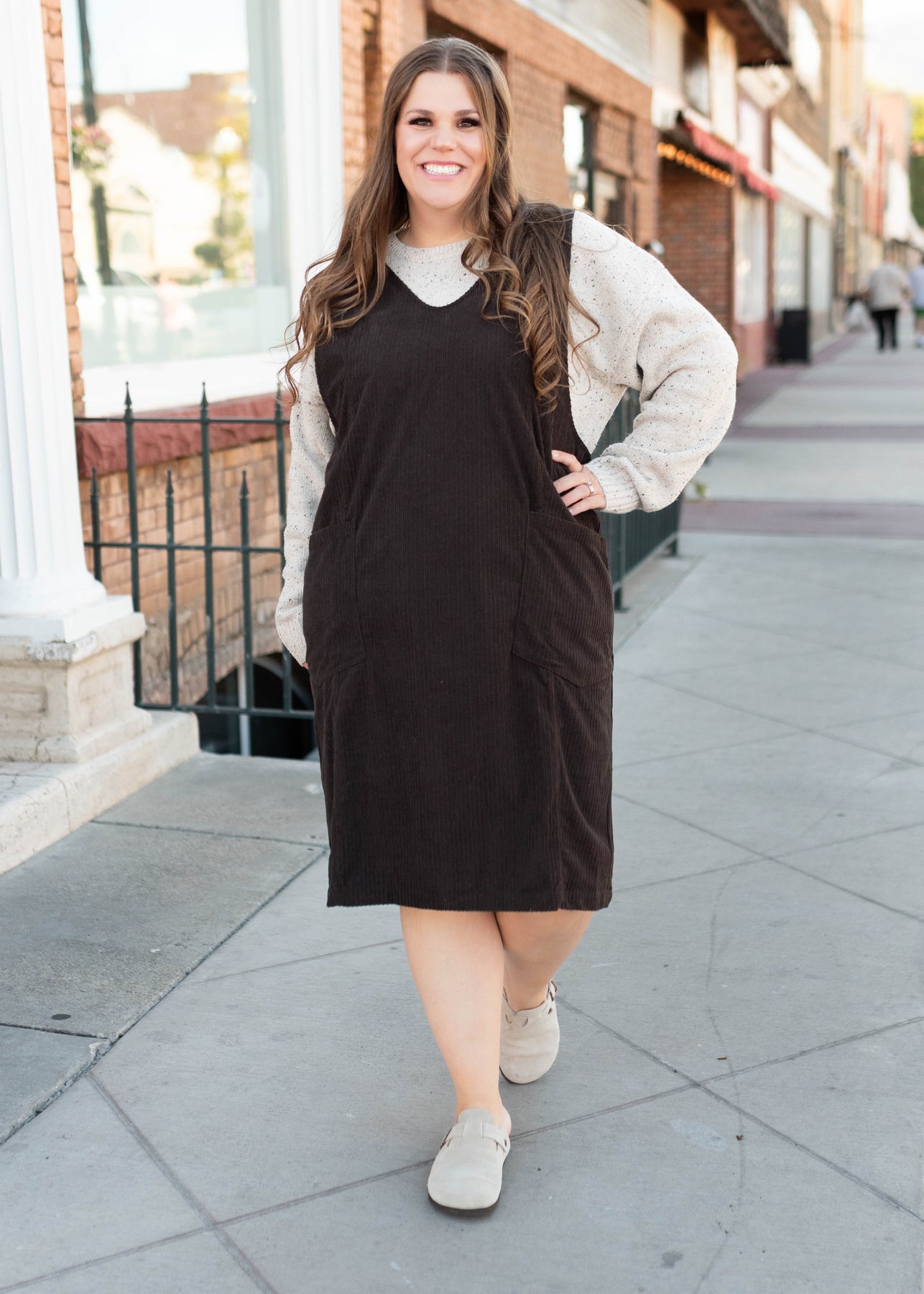 Meet your new layering bestie! The Katy Overall Dress is made from soft deep brown corduroy and designed in a relaxed overall style with a flattering v-neckline. Adjustable straps make it easy to get the perfect fit, while the roomy front pockets are as functional as they are fun. It runs slightly large, so size down if you’re in-between. Pair it with your favorite tee, sweater, or long sleeve for an effortless outfit that’s cute, comfy, and totally versatile.