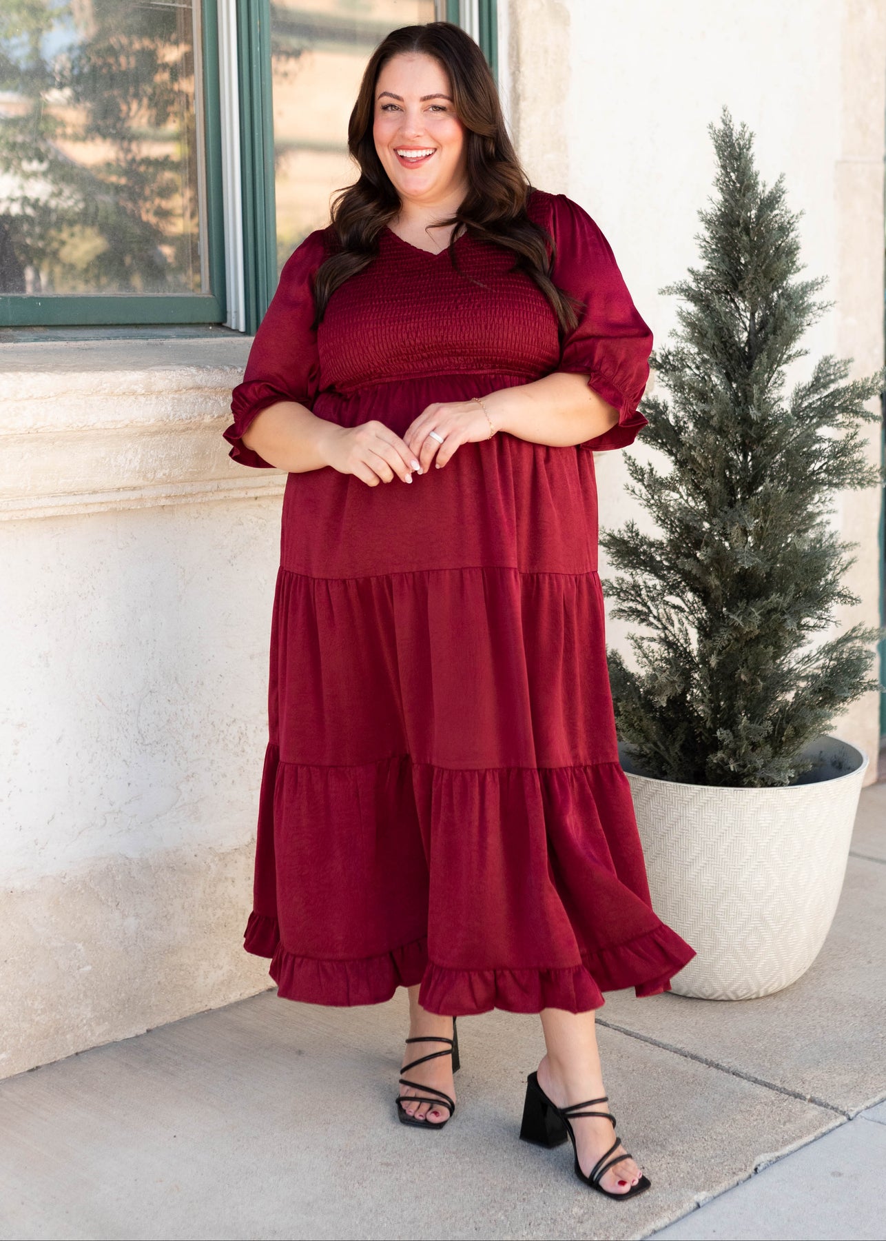 The Charlotte Dress is elegant, feminine, and exclusively ours. With a flattering smocked bodice and an easy elastic waist, it’s designed for both comfort and style. The deep wine hue gives it a rich, romantic look, while ruffle details on the sleeves and hem add the prettiest finishing touch. A tiered, partially lined skirt gives it flow and movement, and—of course—it has pockets!