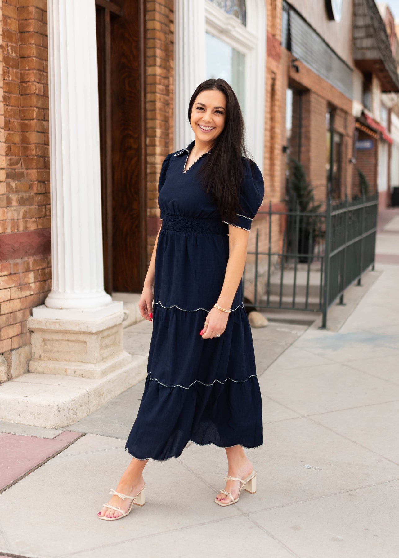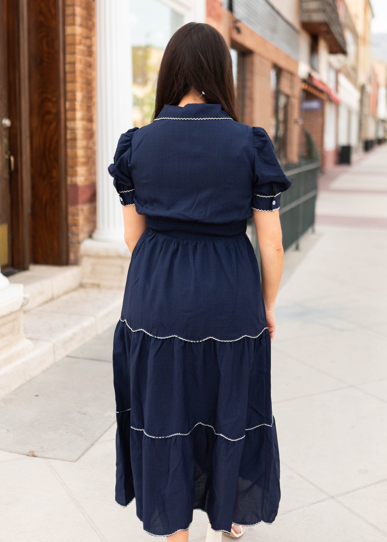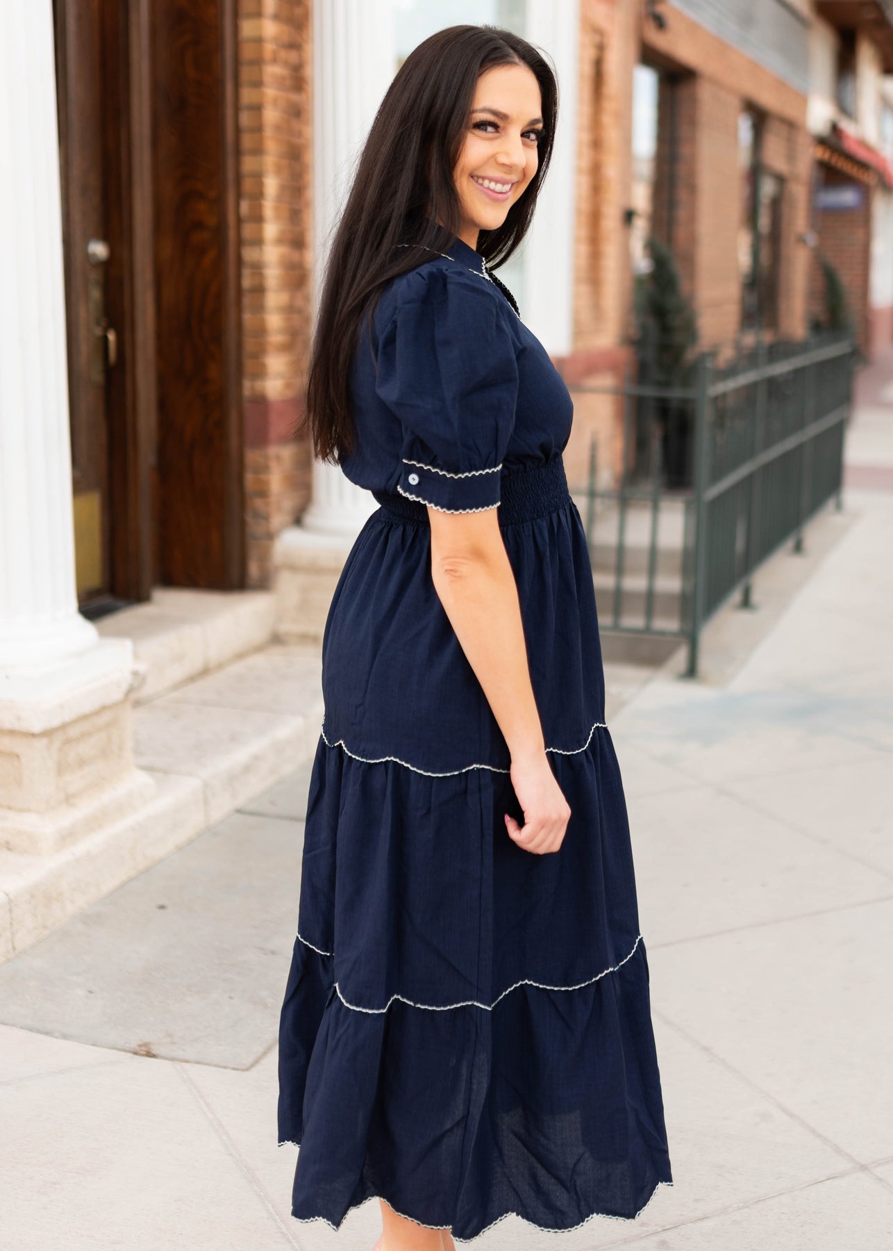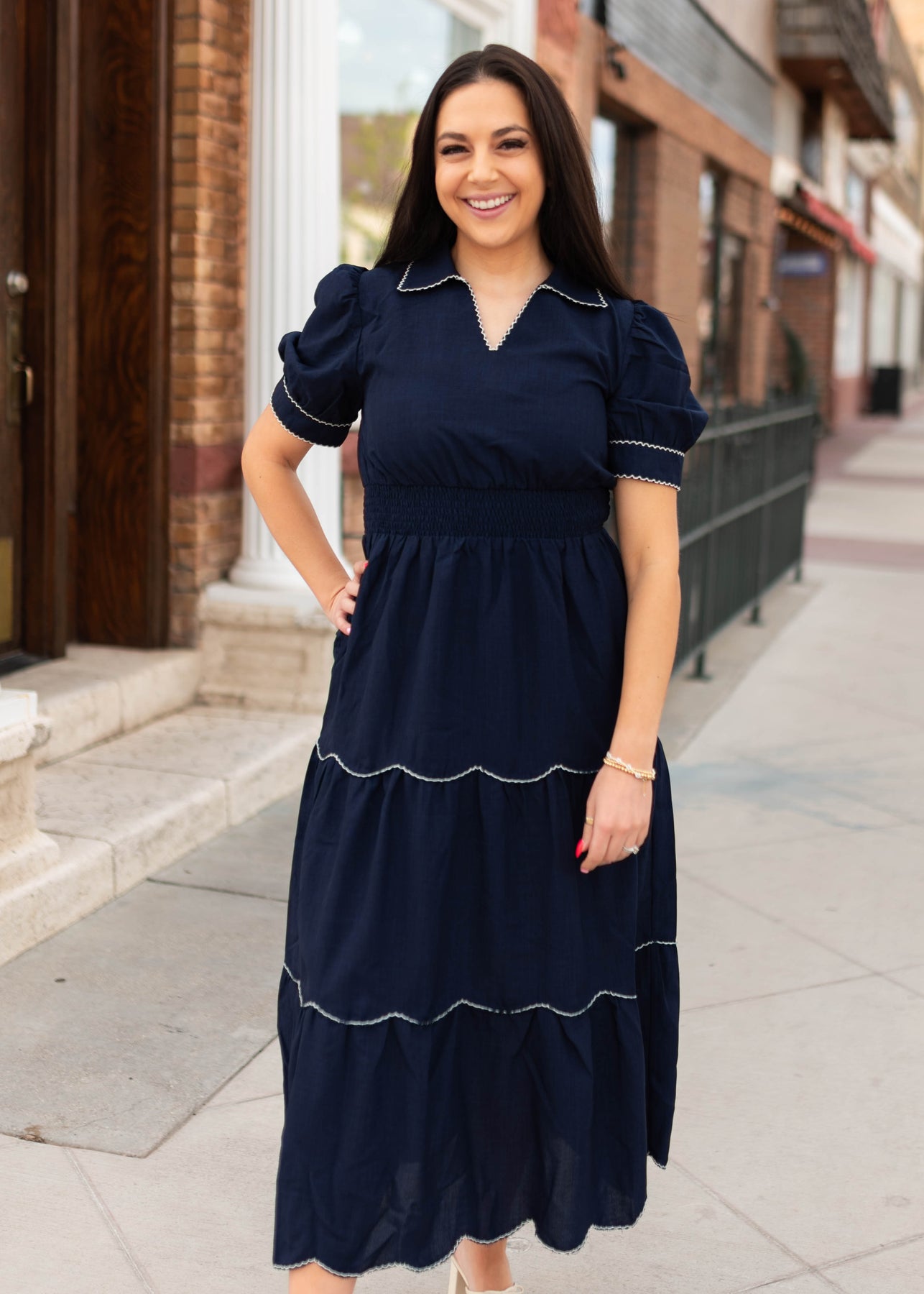 Classic, flattering, and full of charming detail — the Kylee Navy Tiered Dress is one of those pieces that feels instantly polished the moment you put it on. Designed in a rich navy fabric, this dress features a tiered skirt accented with beautiful white scalloped trim that adds a playful, feminine touch. The collared neckline and subtle v neckline create a clean, tailored look, while the thick elastic waistband gives it a comfortable and flattering fit. Finished with sleeve cuffs and delicate button details, it’s a dress that feels both timeless and special.