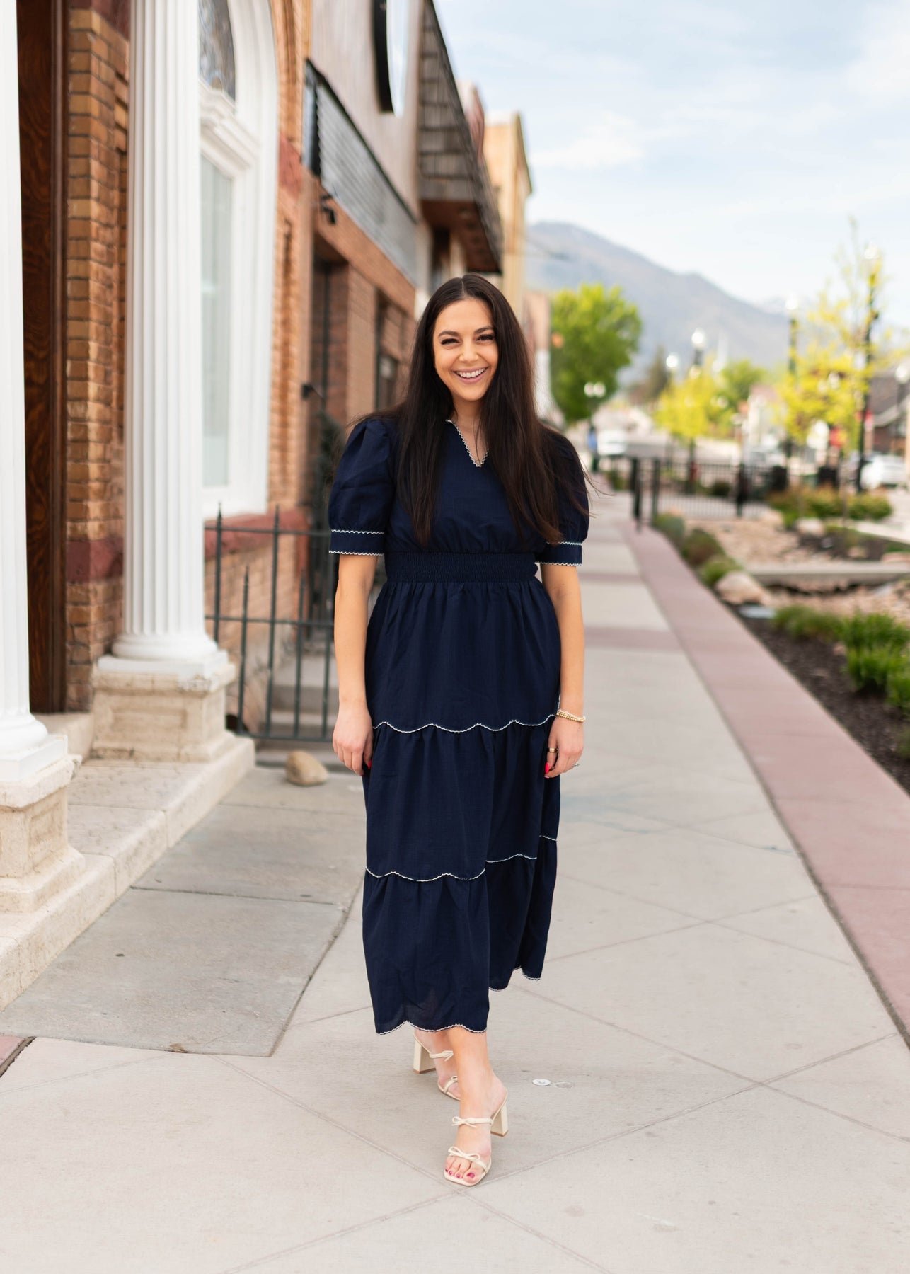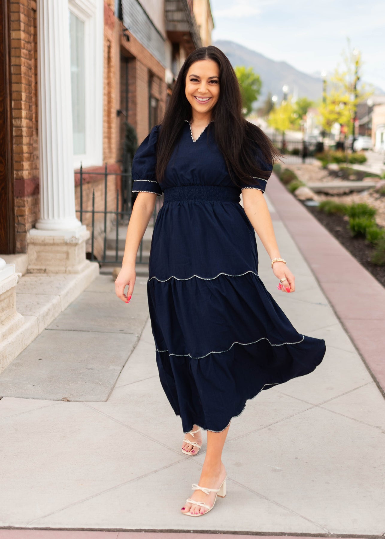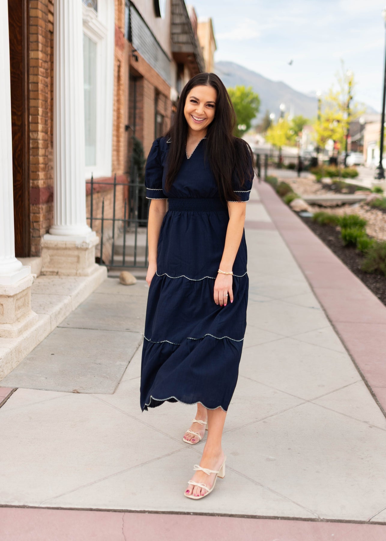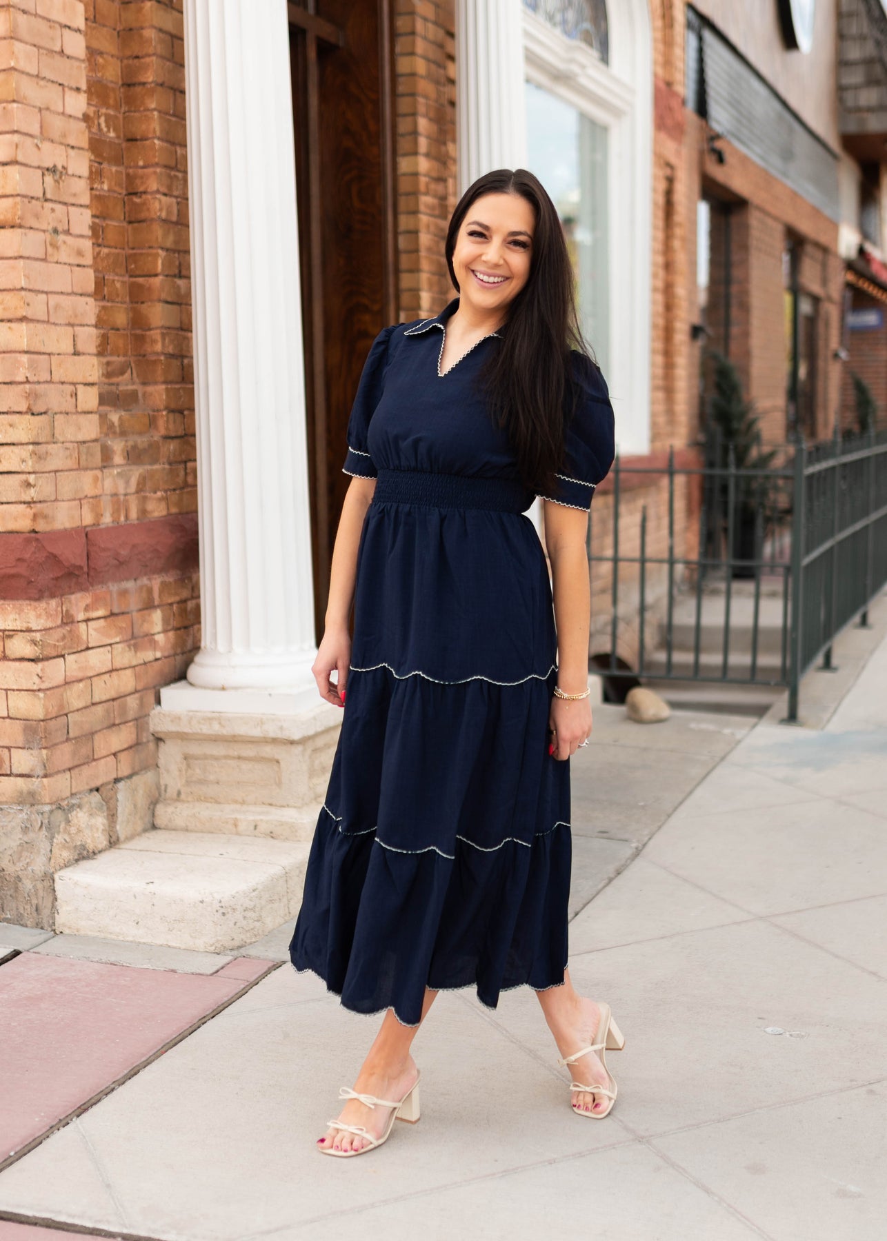 Classic, flattering, and full of charming detail — the Kylee Navy Tiered Dress is one of those pieces that feels instantly polished the moment you put it on. Designed in a rich navy fabric, this dress features a tiered skirt accented with beautiful white scalloped trim that adds a playful, feminine touch. The collared neckline and subtle v neckline create a clean, tailored look, while the thick elastic waistband gives it a comfortable and flattering fit. Finished with sleeve cuffs and delicate button details, it’s a dress that feels both timeless and special.