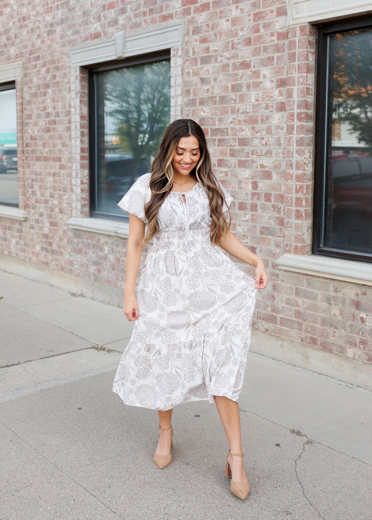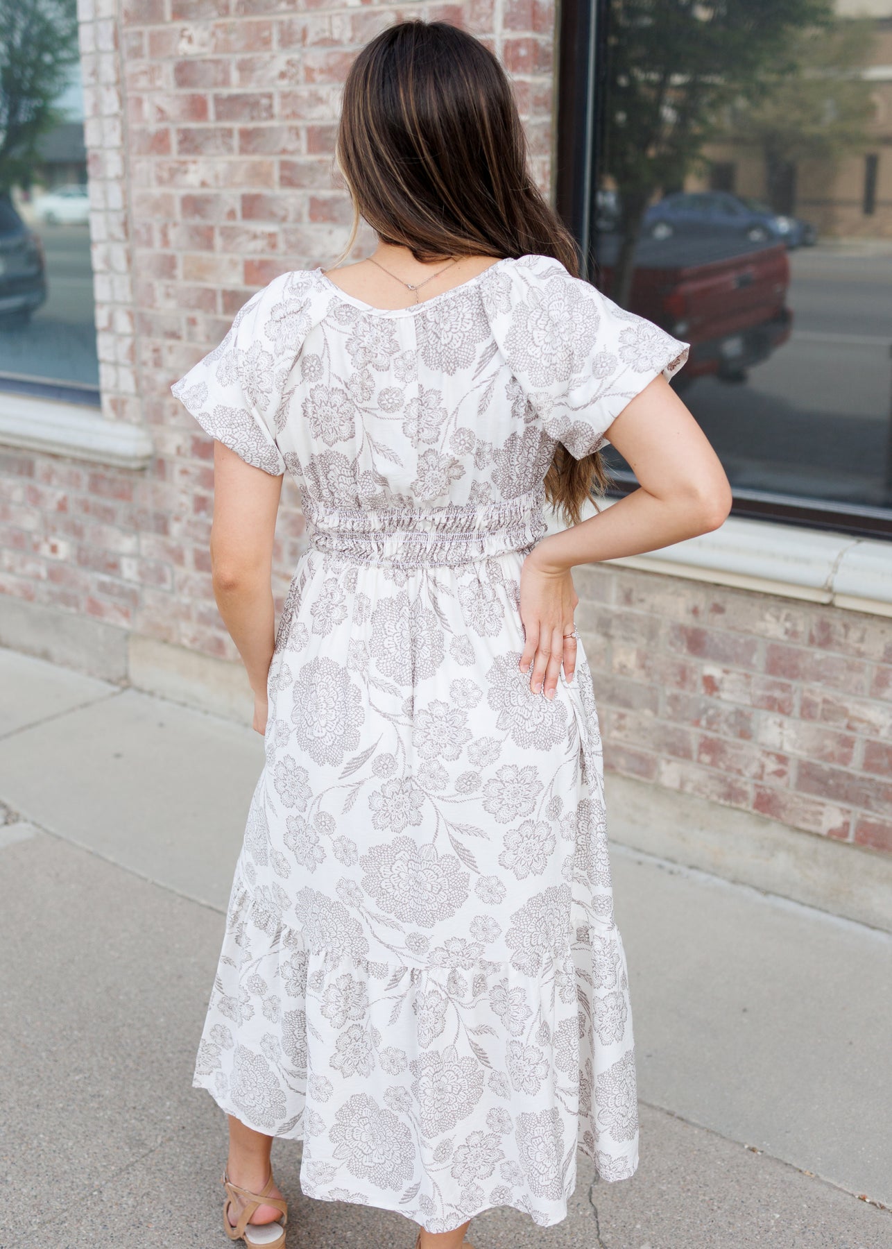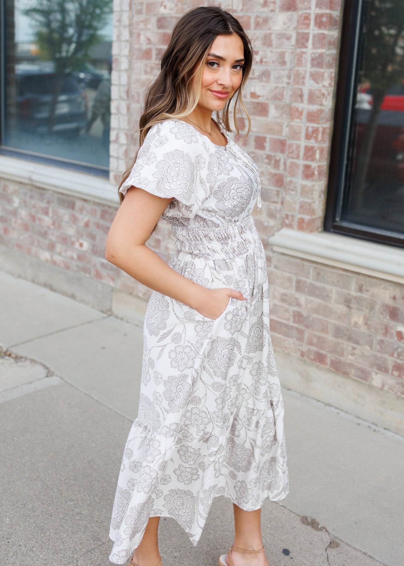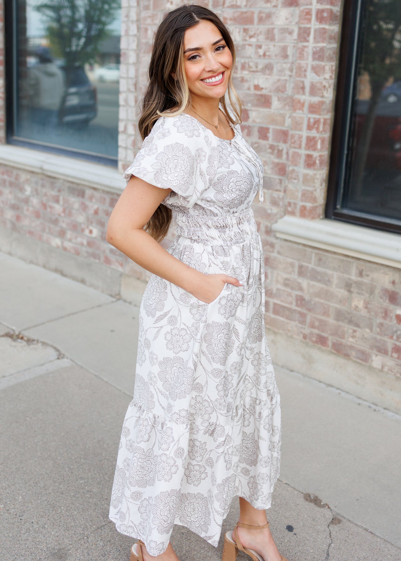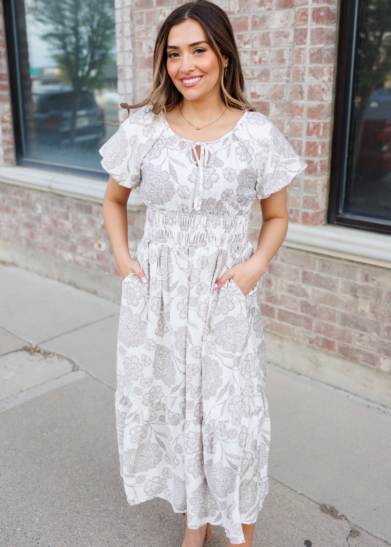 Romantic, soft, and effortlessly elevated — the Savannah Taupe Floral Dress is a timeless piece that feels just as good as it looks. Designed with an ivory base and delicate taupe floral print, this dress features feminine puff sleeves and a flattering elastic waist for an easy, comfortable fit. The round neckline with a subtle tie detail adds a touch of charm, while the tiered skirt creates beautiful movement. And of course — it has pockets for everyday practicality.