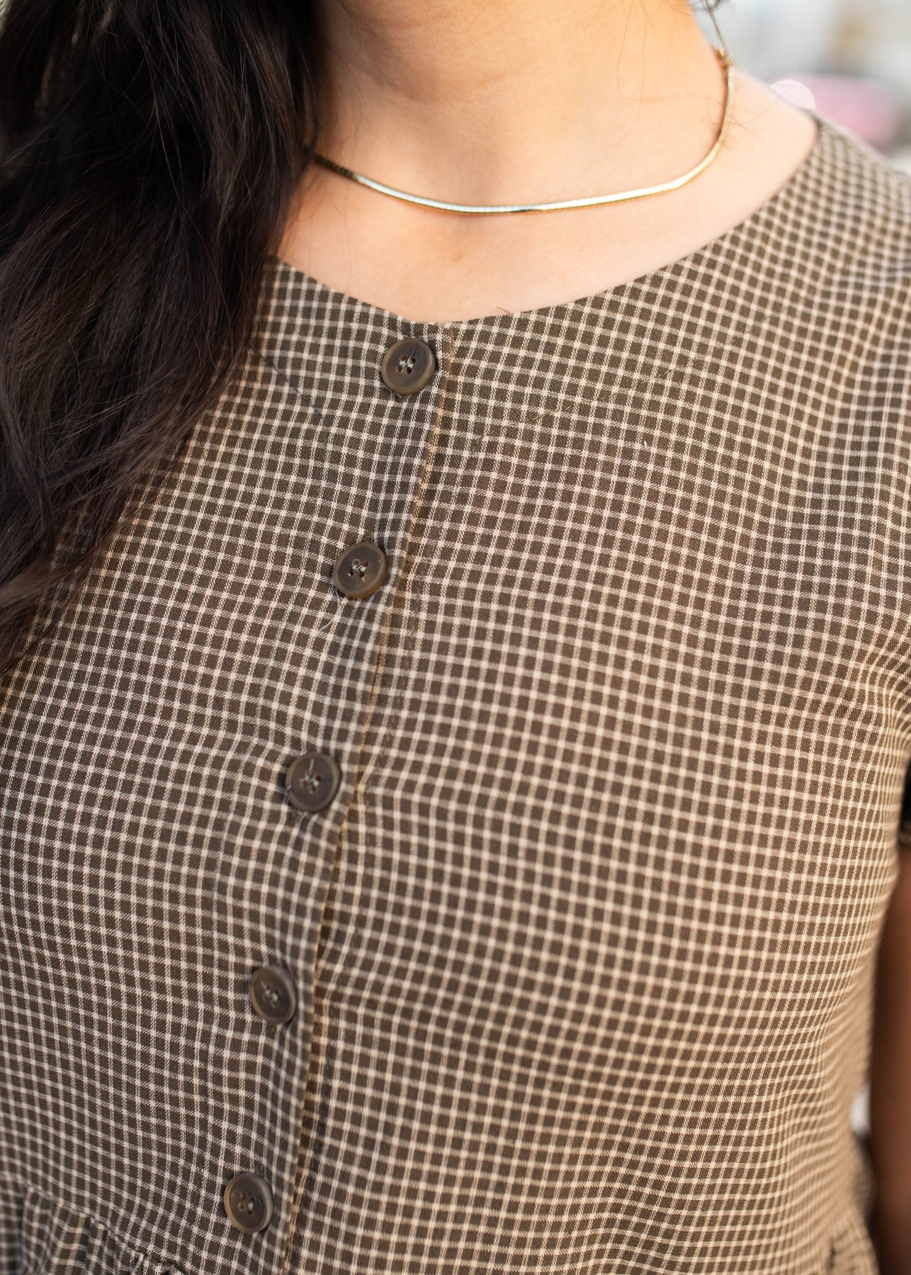 The Gianna Dress is effortlessly pretty and perfectly classic. Designed in a dark olive gingham, it features a flattering scoop neckline and a functional button-up front for easy wear. The tiered skirt adds soft movement, while the lining and side pockets make it both practical and comfortable. Simple, sweet, and ready to wear anywhere!