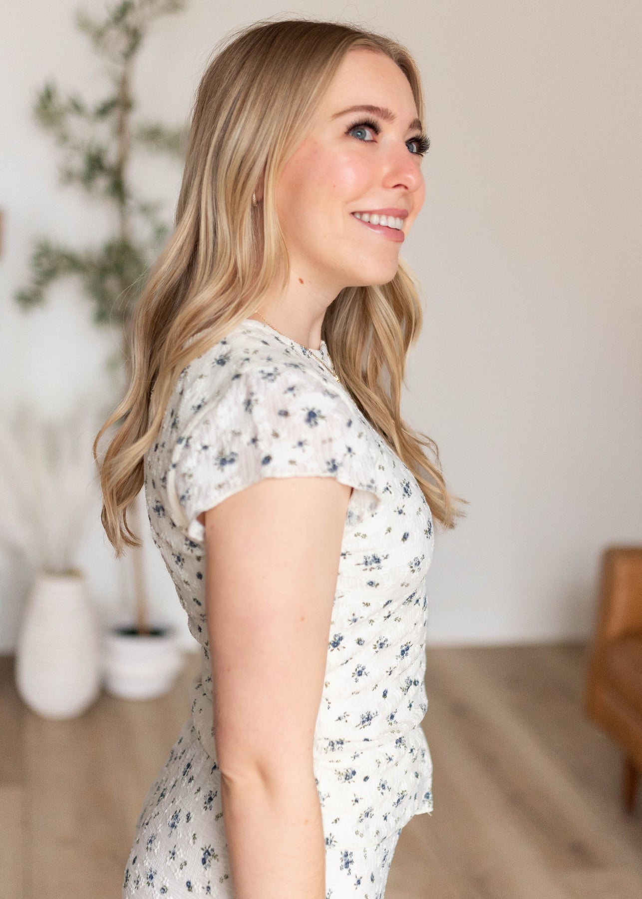 Side view of the ivory floral top