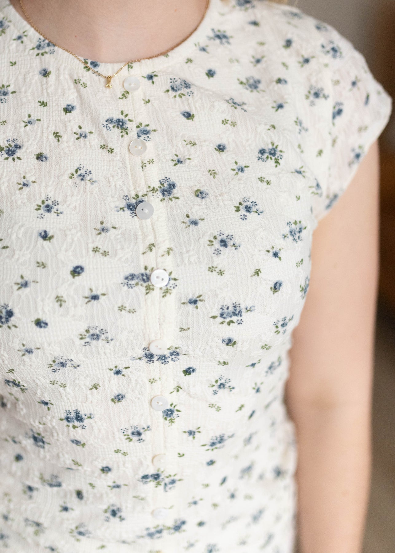 Close up of the buttons and fabric on the ivory floral top