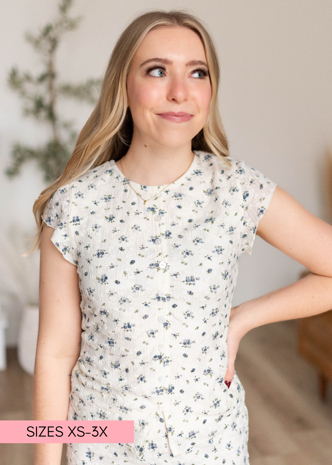 Pretty, polished, and perfect for styling multiple ways — the Abby Ivory Floral Lace Top is designed to create an effortlessly put-together look. Featuring a soft ivory base with a delicate blue floral print, this fitted silhouette offers a flattering shape while the textured lace fabric adds beautiful detail. The faux button front gives it a classic, feminine feel, making it easy to dress up or keep casual. Pair it with the coordinating skirt for a seamless matching set or style it with your favorite denim for an everyday outfit you’ll love.