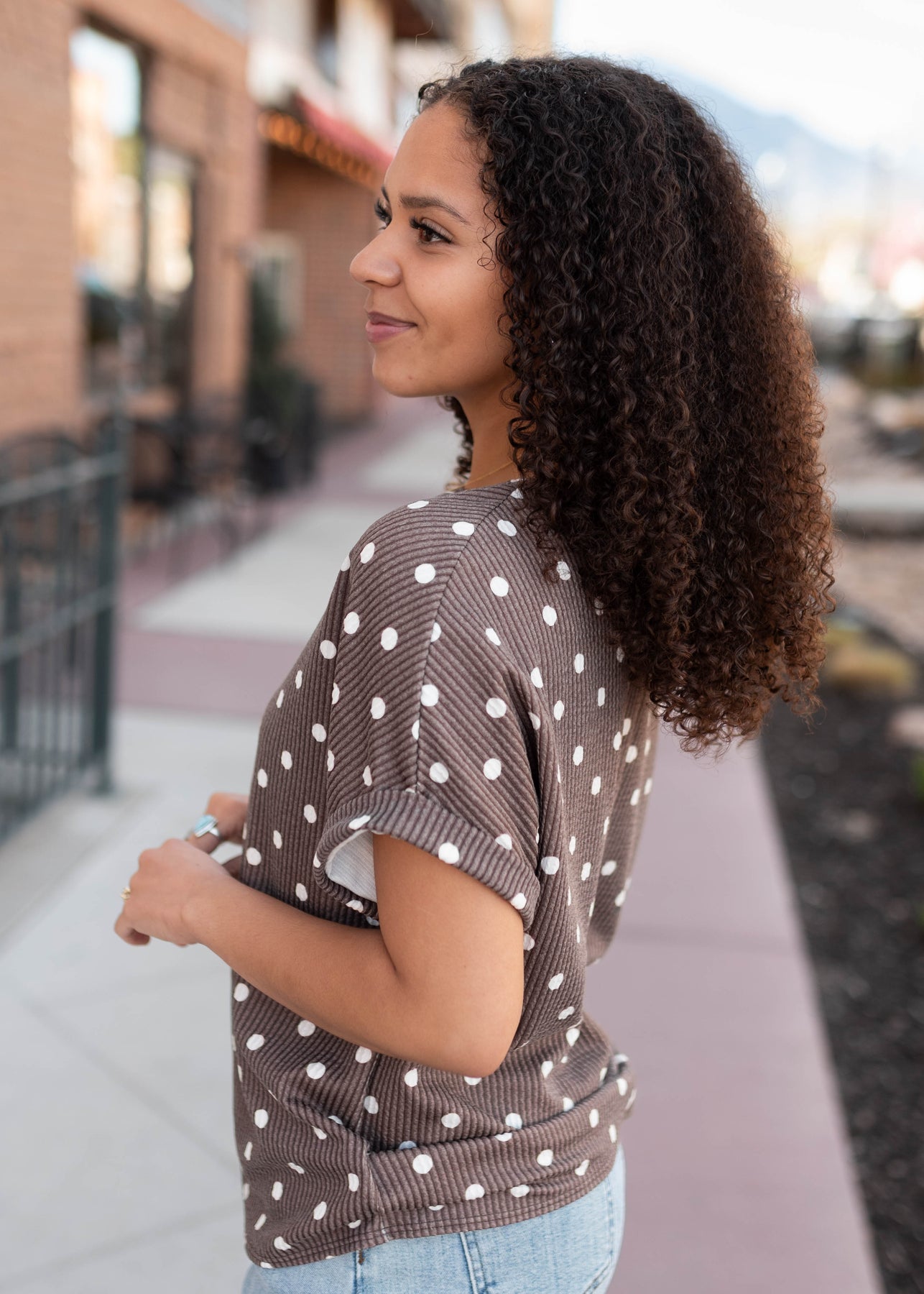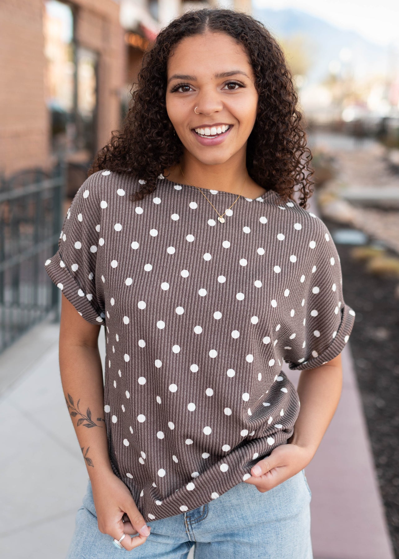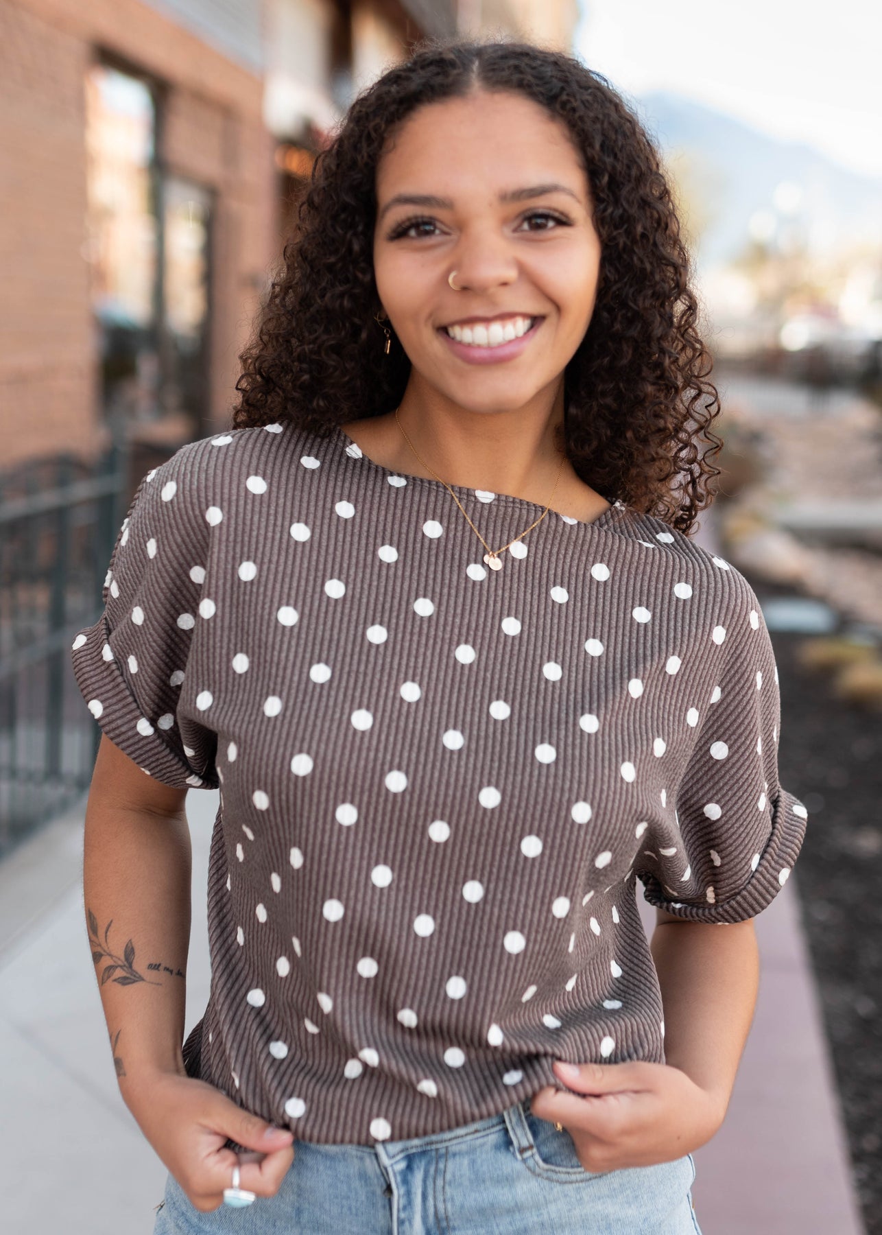 Playful, classic, and easy to style — the Angelina Brown Polkadot Top is a fun twist on an everyday essential. Designed with a rich brown base and cream polka dots, this top features a simple round neckline and a soft ribbed material that adds subtle texture. The loose fit keeps it comfortable and flattering, making it an effortless piece you can dress up or down.