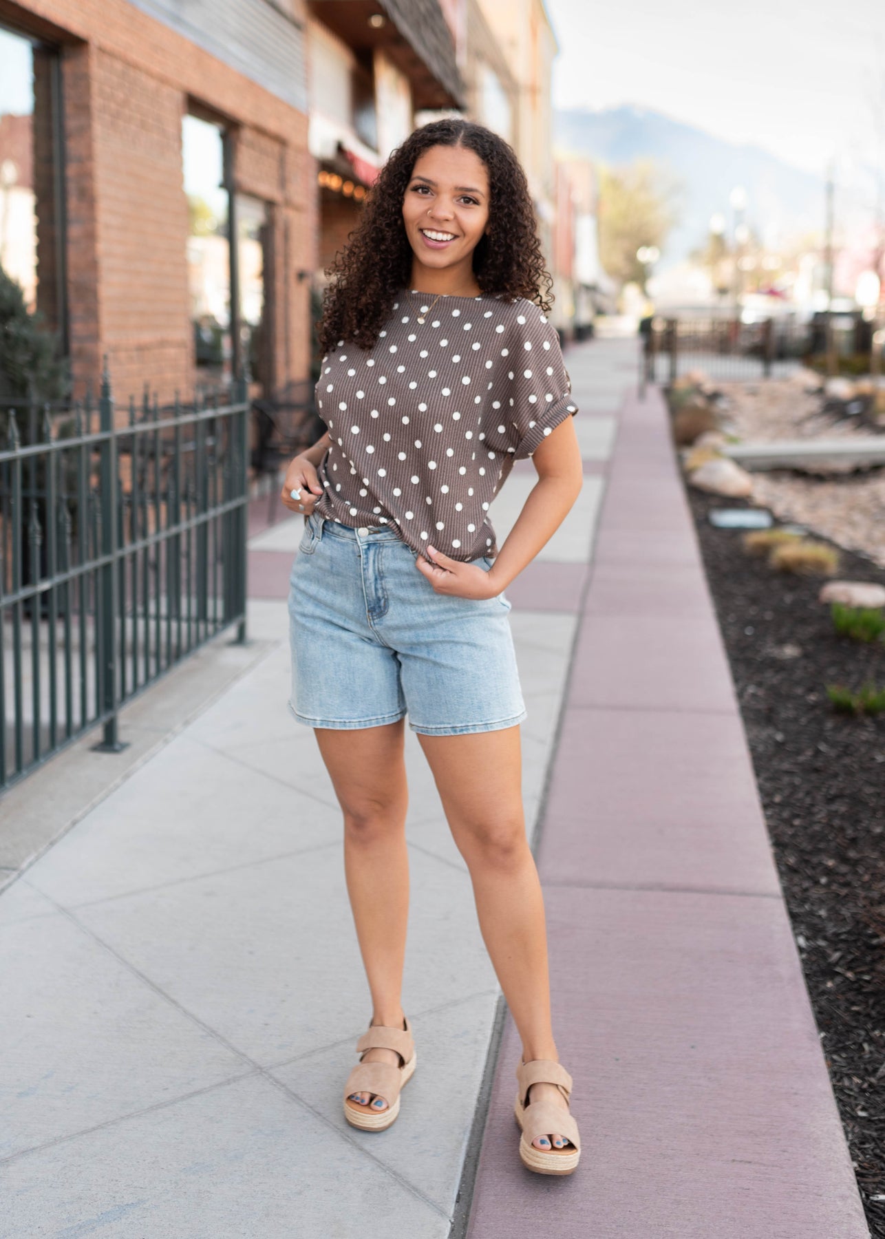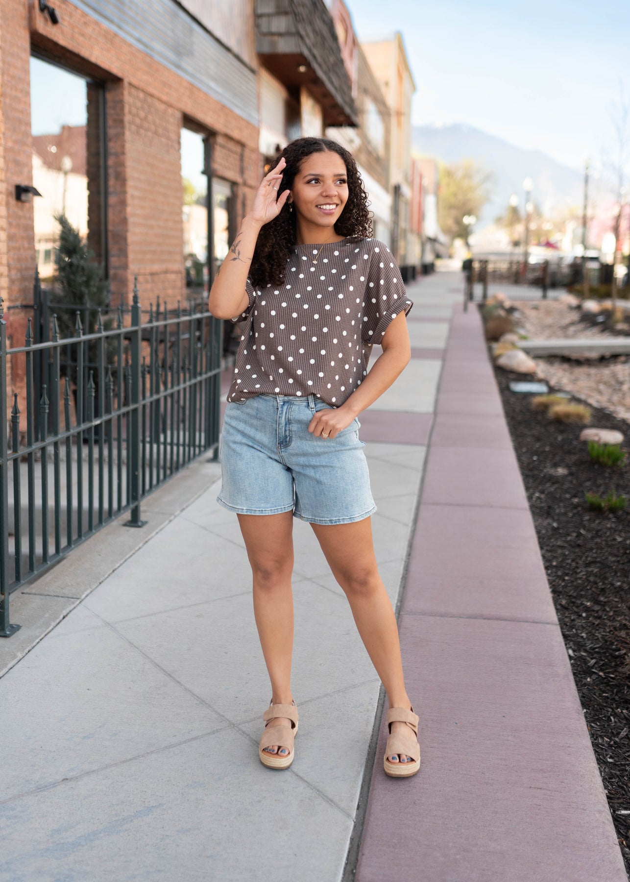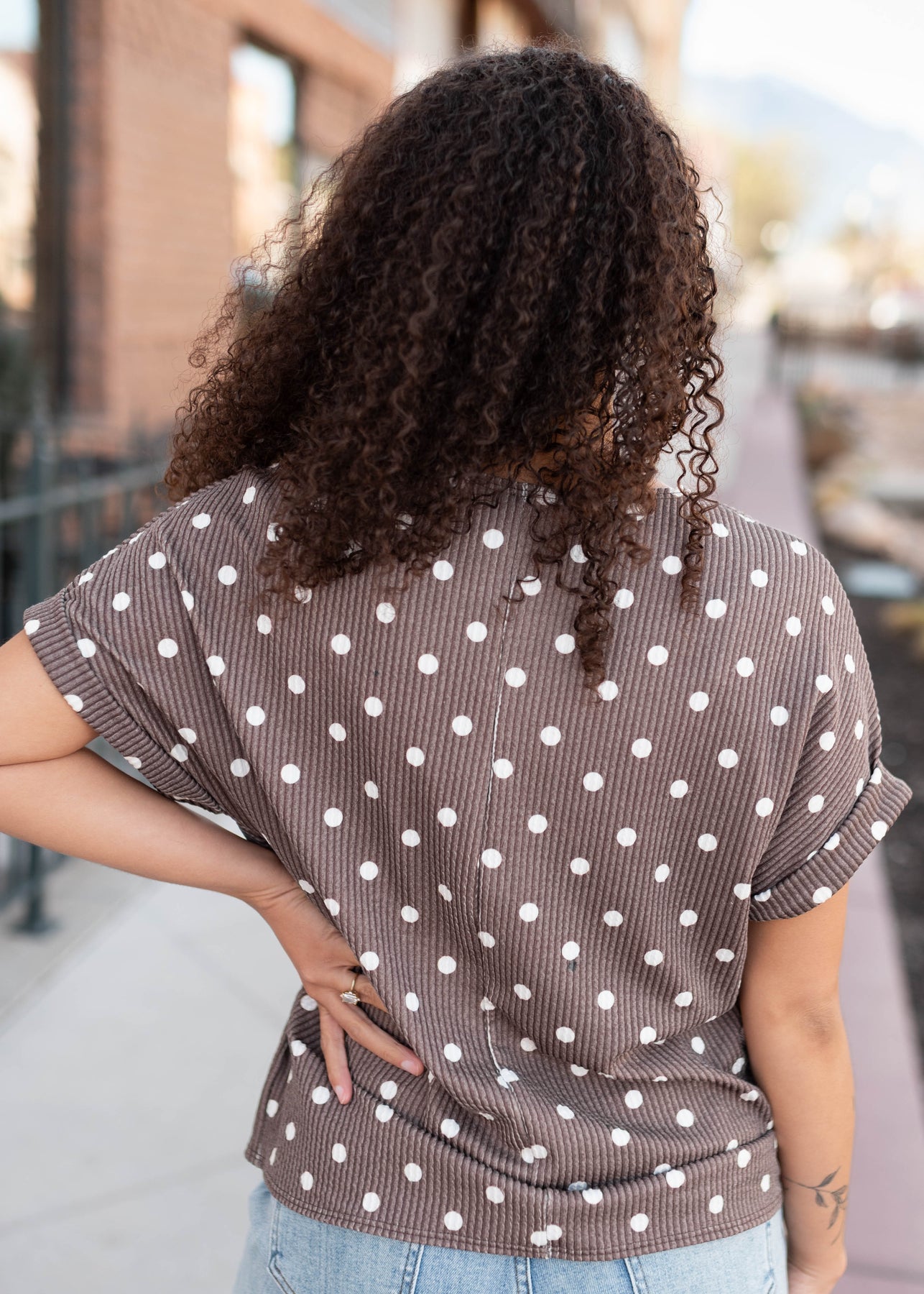 Playful, classic, and easy to style — the Angelina Brown Polkadot Top is a fun twist on an everyday essential. Designed with a rich brown base and cream polka dots, this top features a simple round neckline and a soft ribbed material that adds subtle texture. The loose fit keeps it comfortable and flattering, making it an effortless piece you can dress up or down.