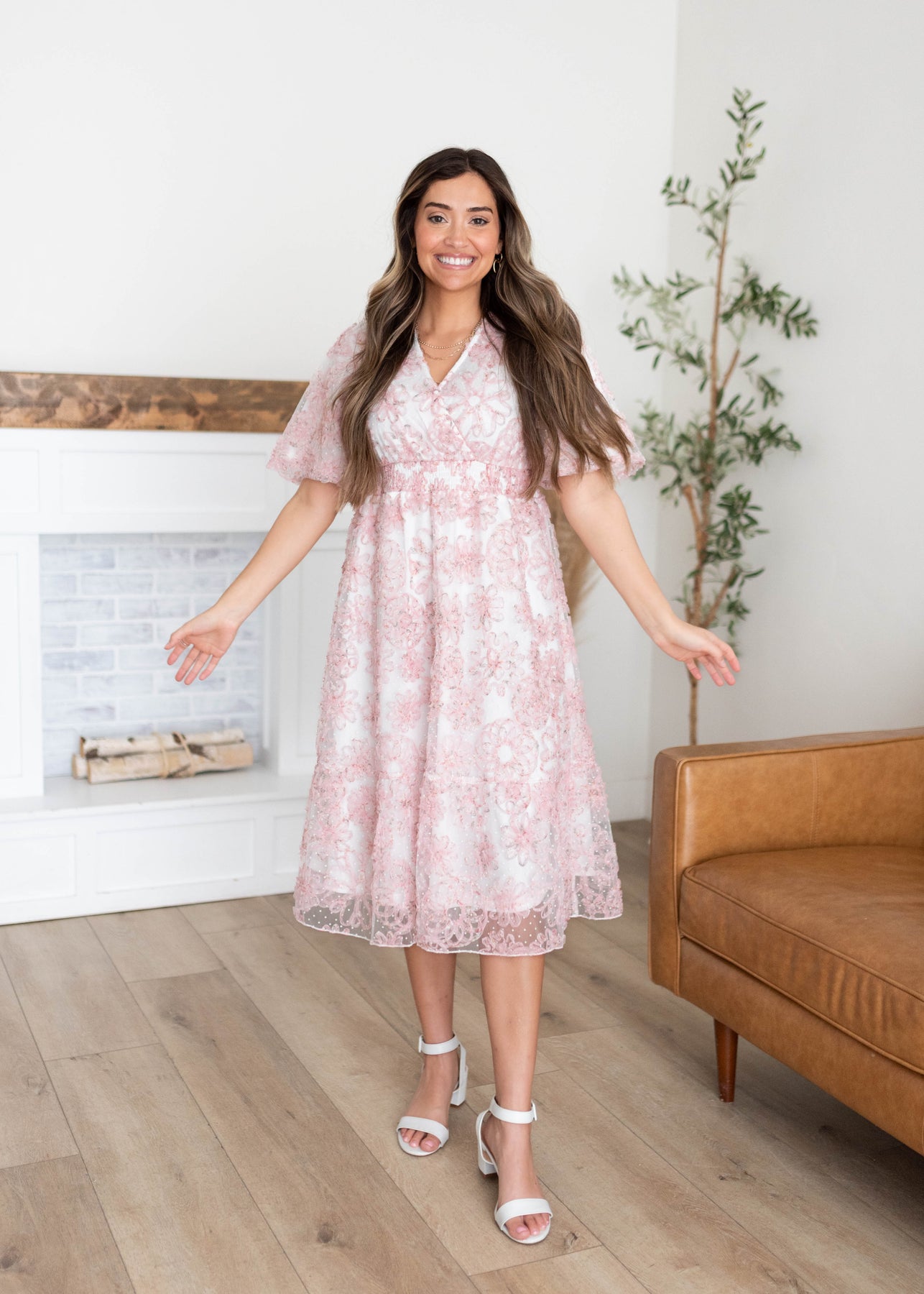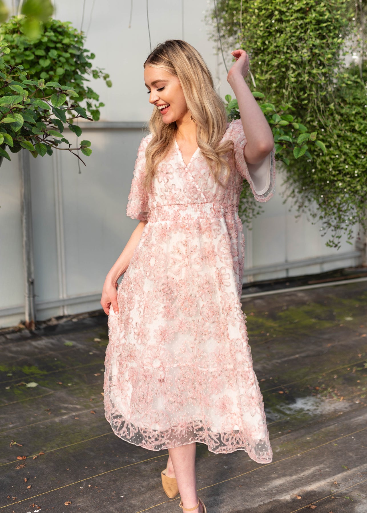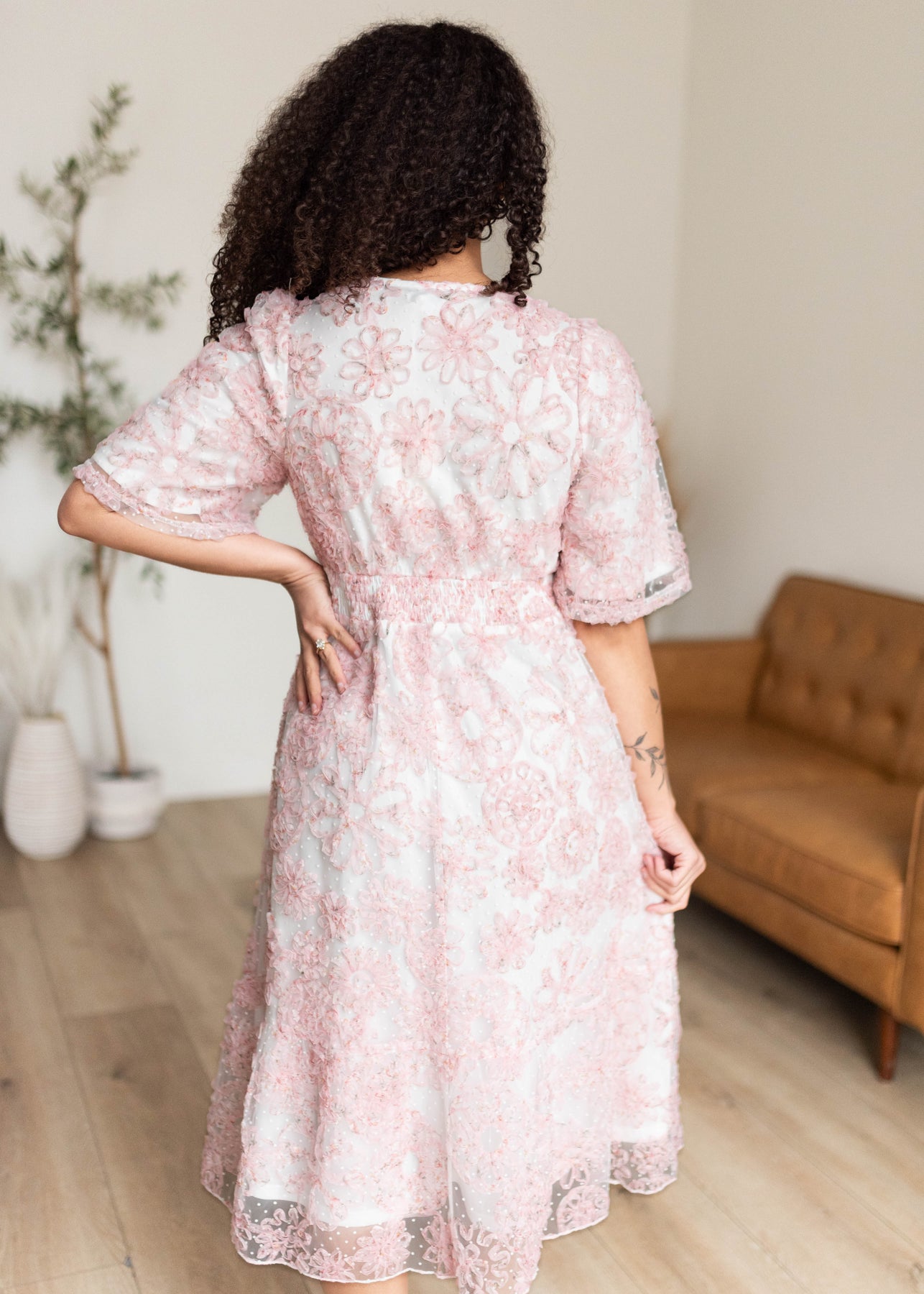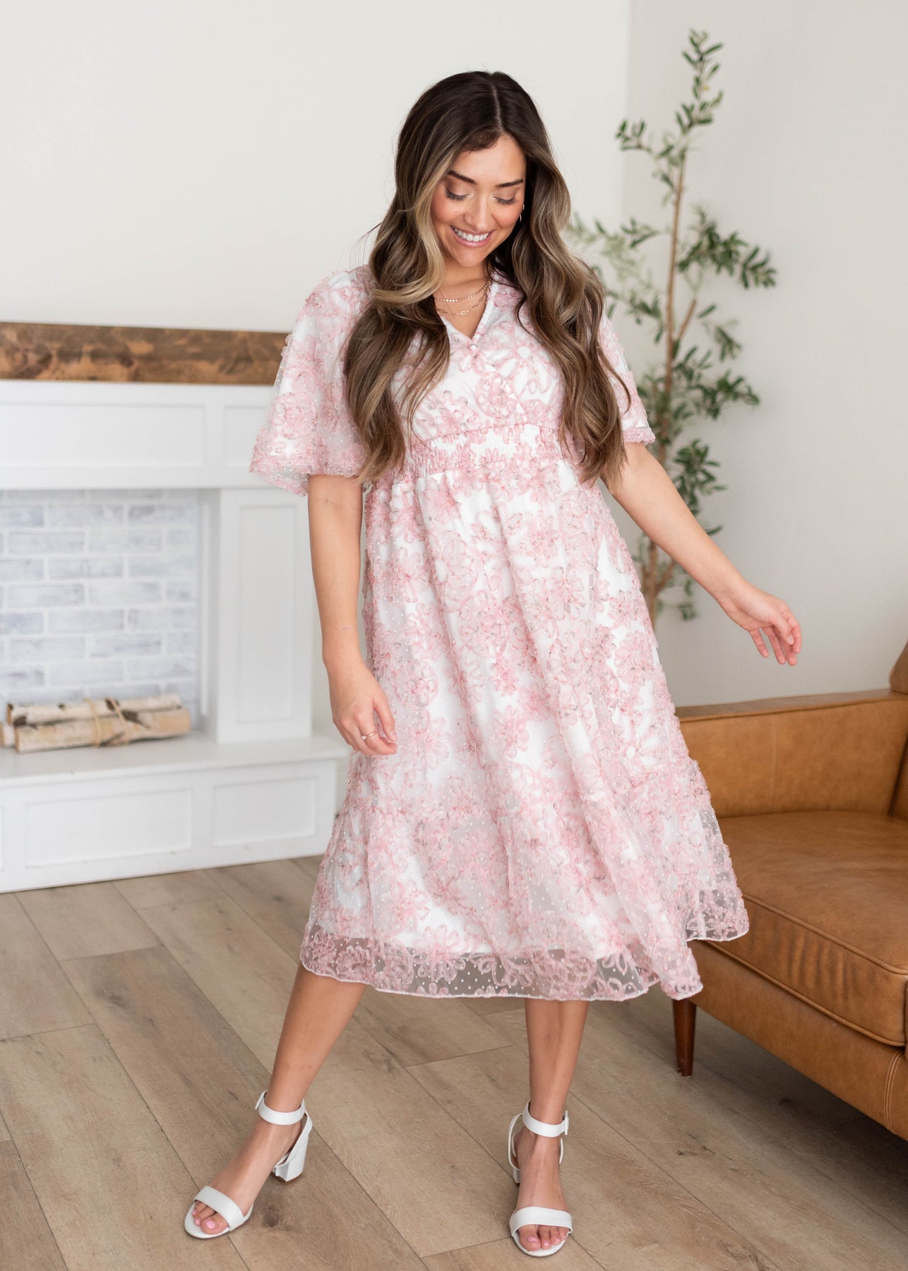 The Aubree Pink Floral Dress is a dreamy, wear-anywhere style designed with comfort and versatility in mind. Featuring a flattering smocked elastic waist, V-neckline, and soft flutter sleeves, this dress is crafted in a beautiful swiss dot fabric with a textured pink floral print throughout. Nursing-friendly with a discreet snap at the neckline and fully lined for coverage, it’s as practical as it is pretty.