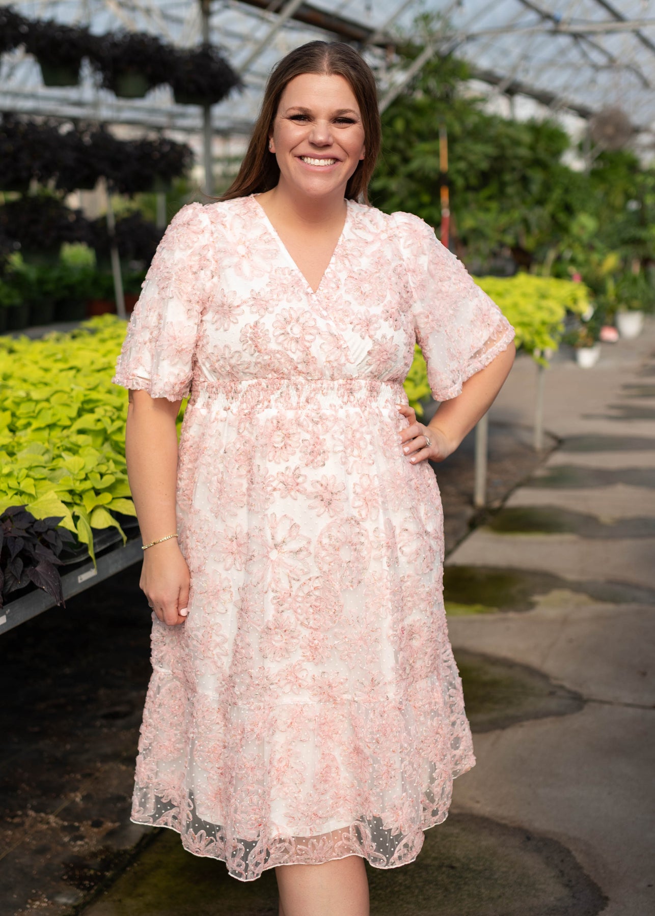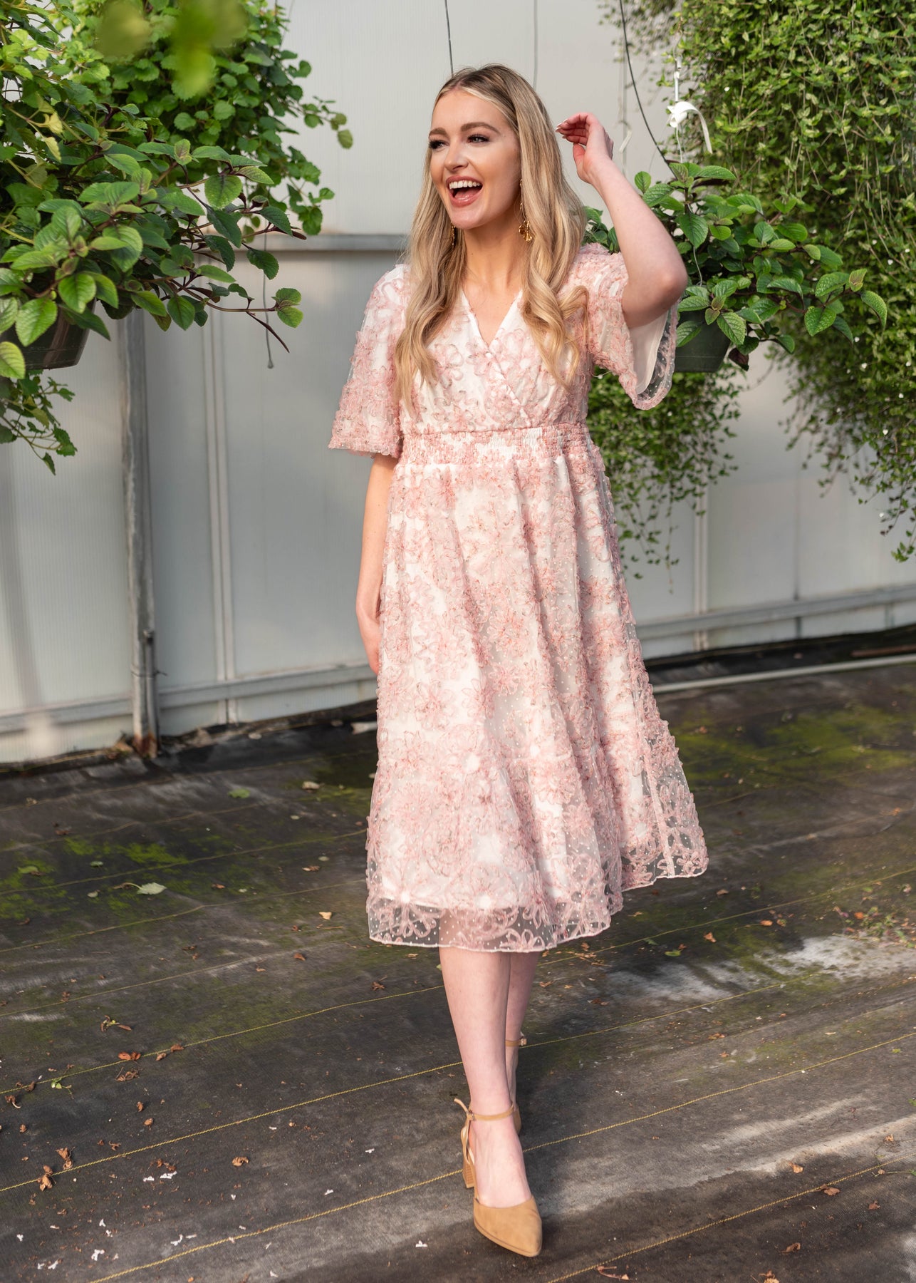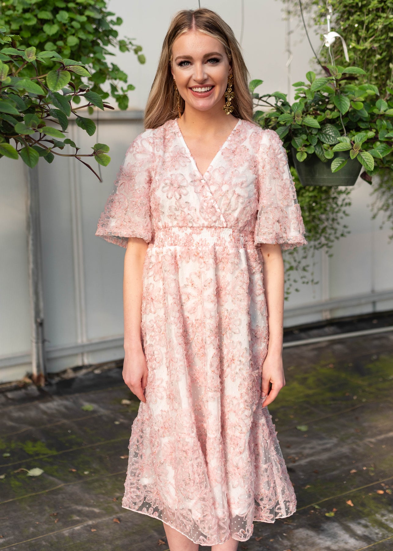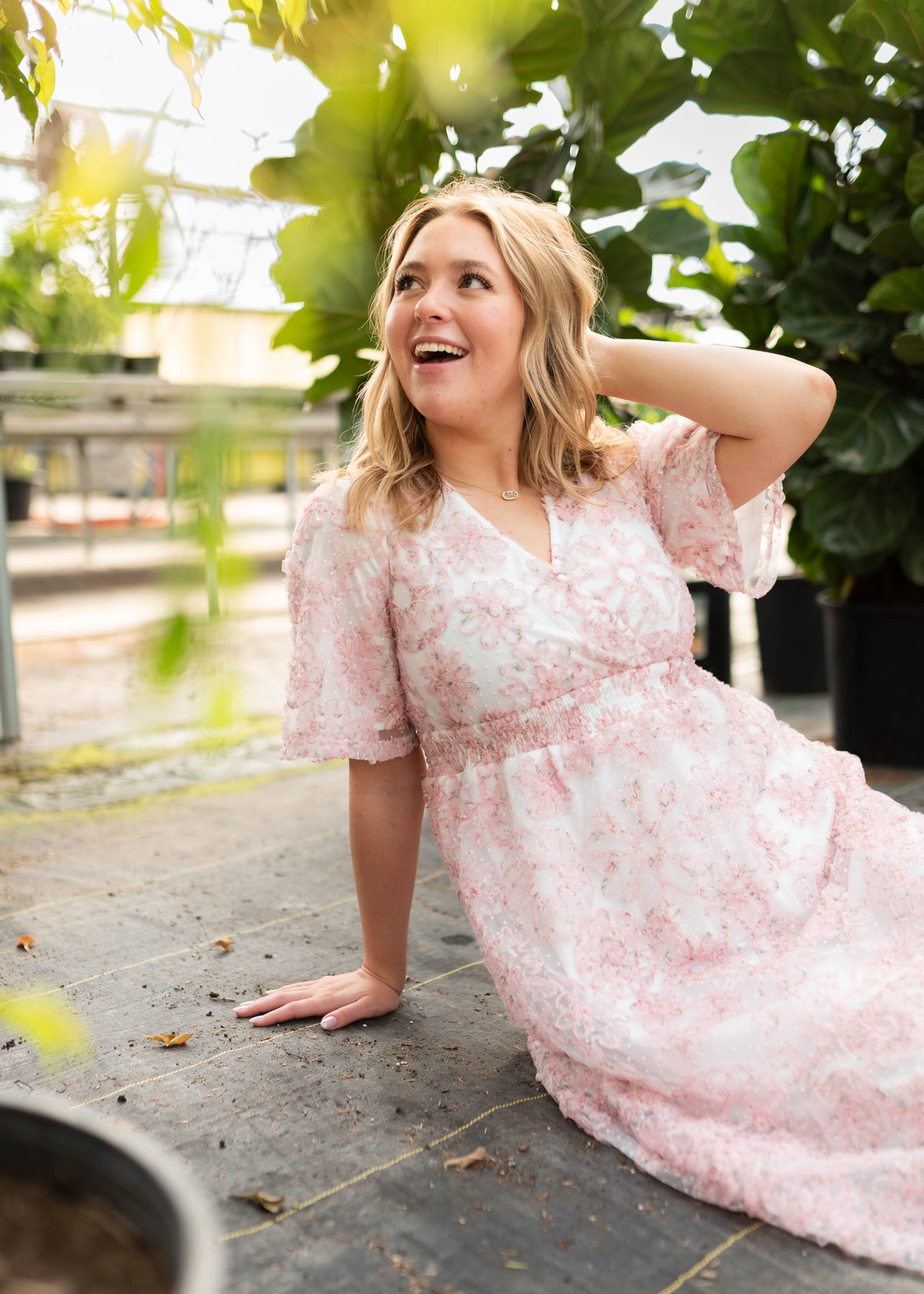 The Aubree Pink Floral Dress is a dreamy, wear-anywhere style designed with comfort and versatility in mind. Featuring a flattering smocked elastic waist, V-neckline, and soft flutter sleeves, this dress is crafted in a beautiful swiss dot fabric with a textured pink floral print throughout. Nursing-friendly with a discreet snap at the neckline and fully lined for coverage, it’s as practical as it is pretty.