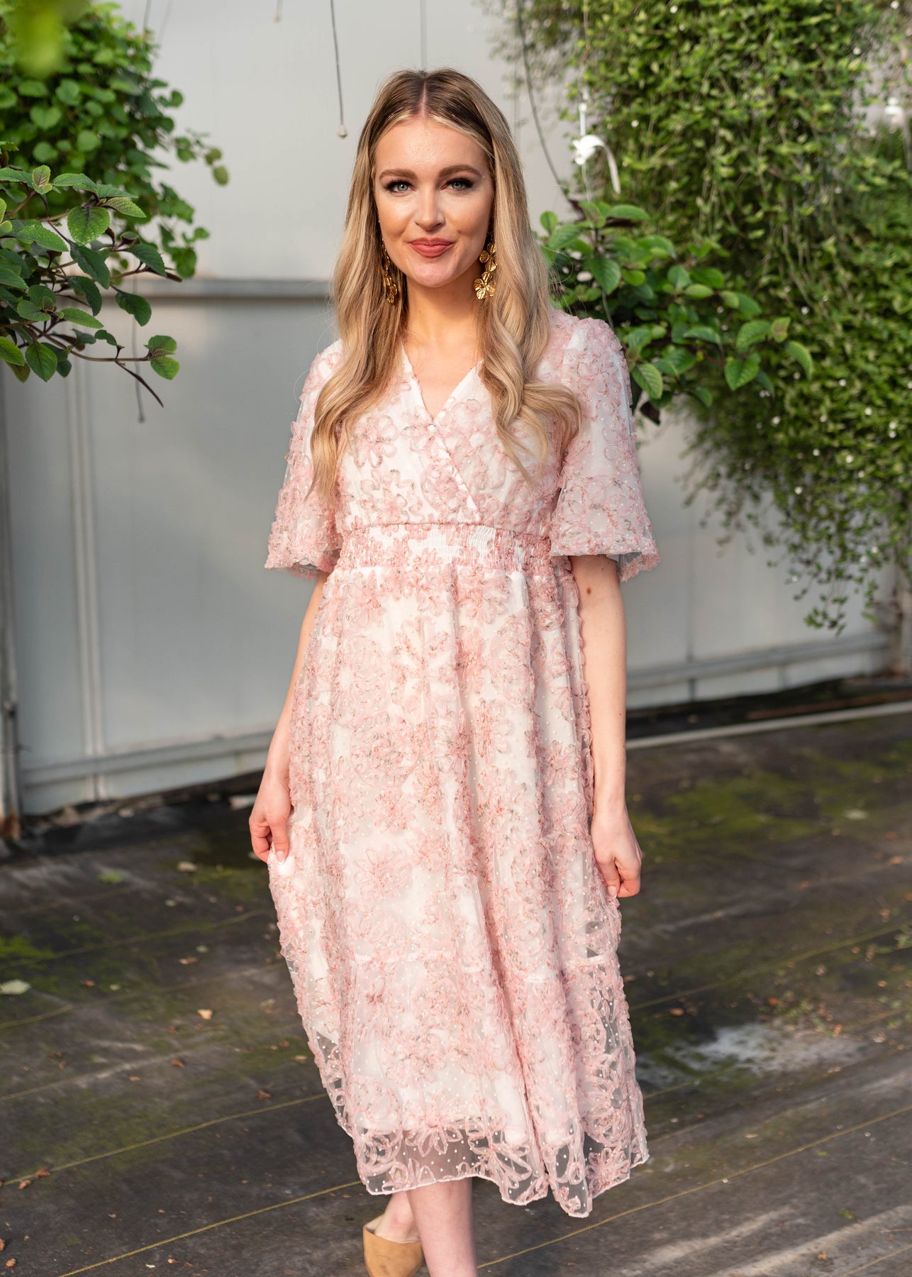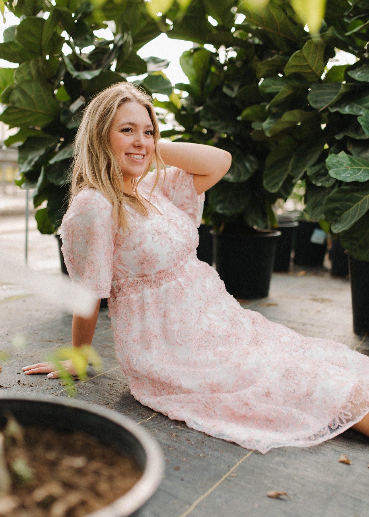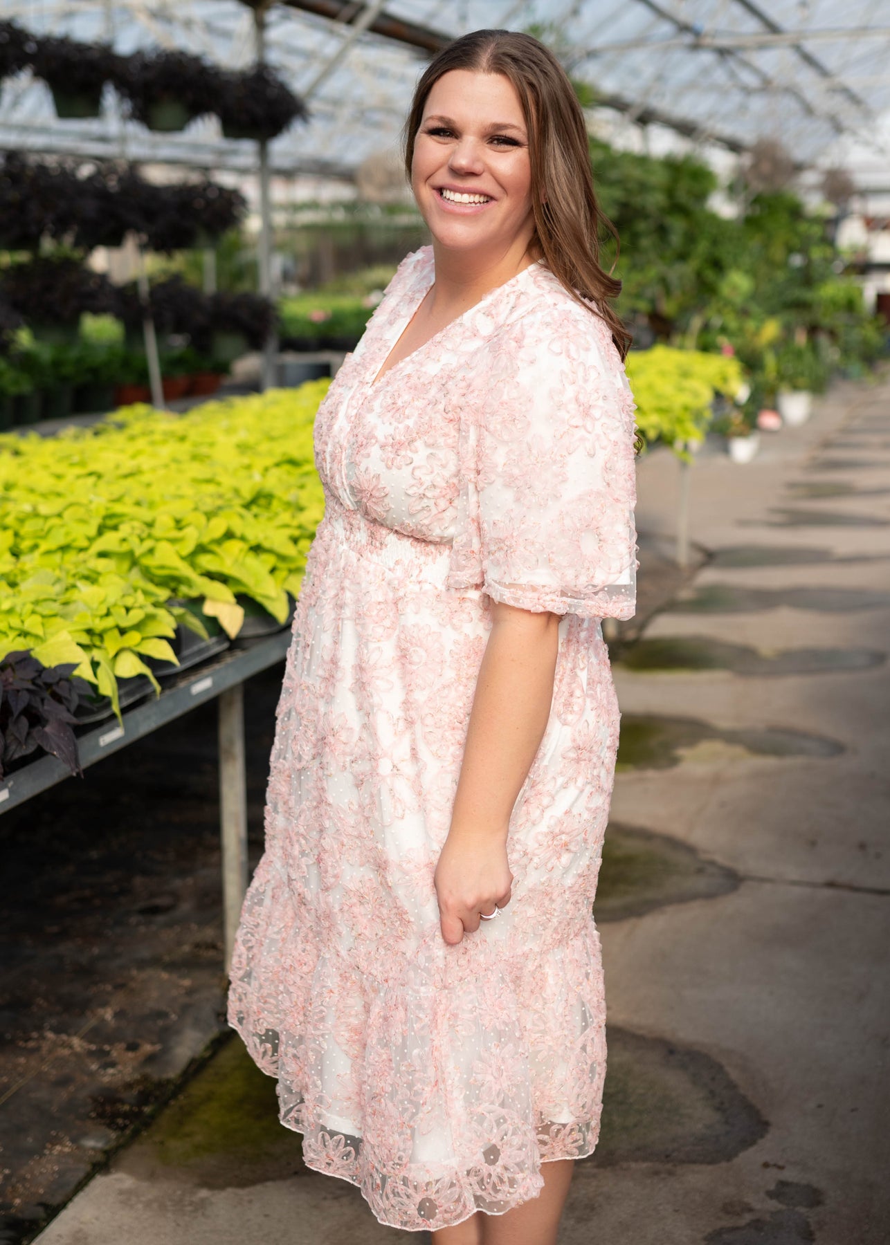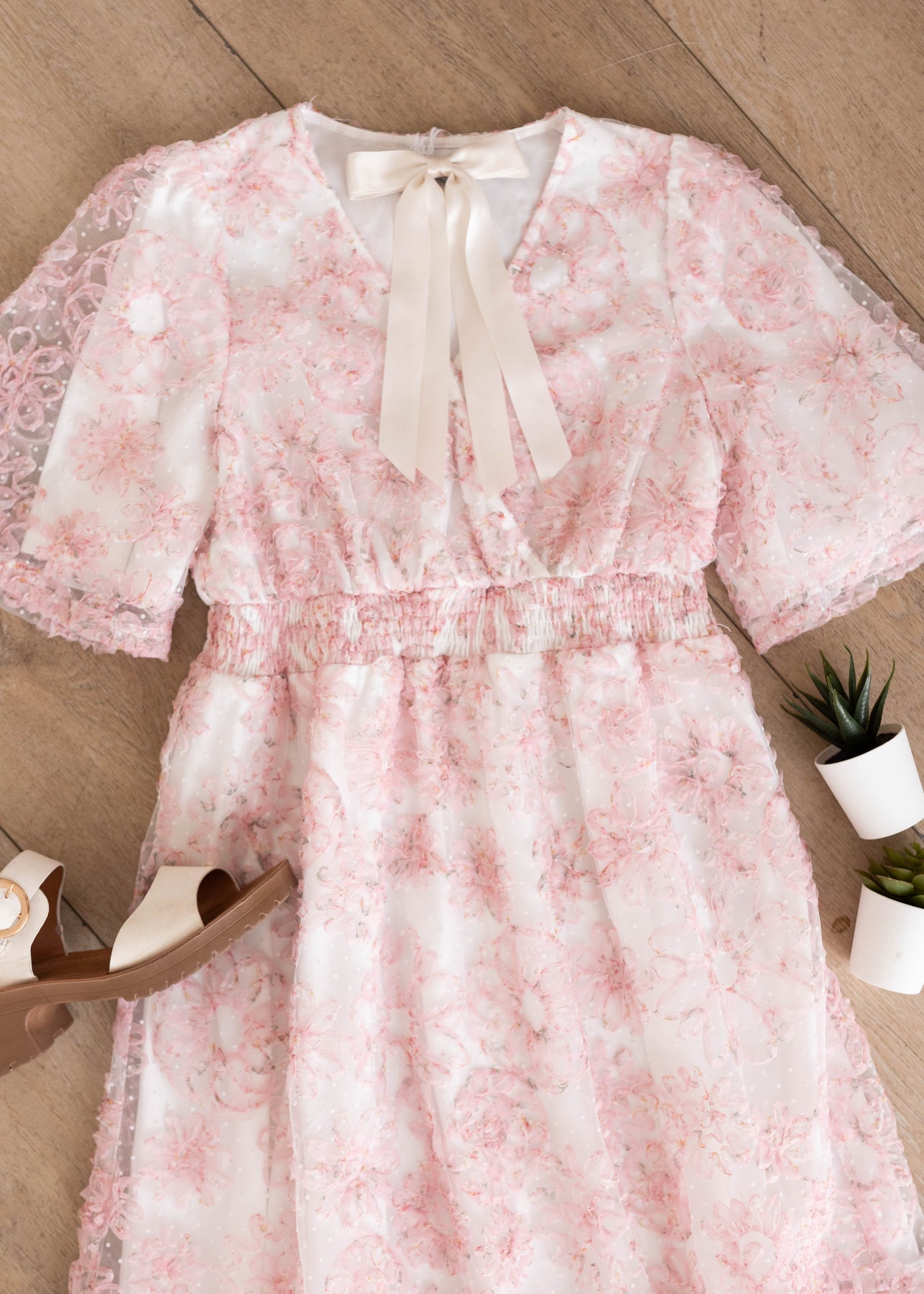 The Aubree Pink Floral Dress is a dreamy, wear-anywhere style designed with comfort and versatility in mind. Featuring a flattering smocked elastic waist, V-neckline, and soft flutter sleeves, this dress is crafted in a beautiful swiss dot fabric with a textured pink floral print throughout. Nursing-friendly with a discreet snap at the neckline and fully lined for coverage, it’s as practical as it is pretty.