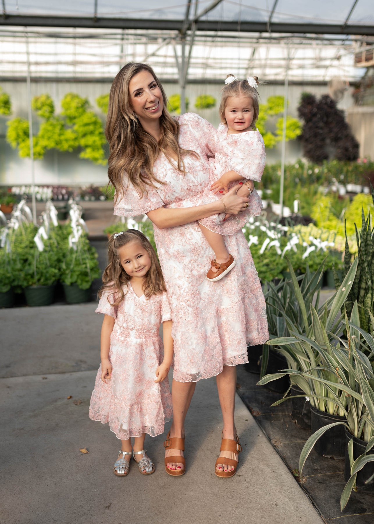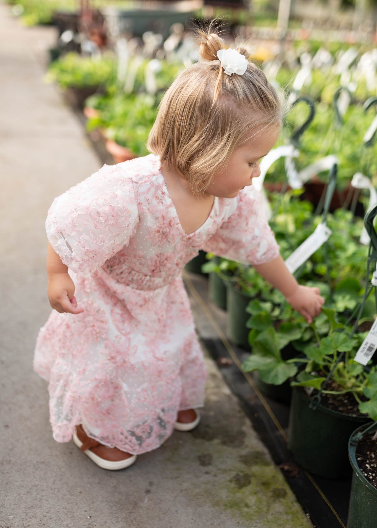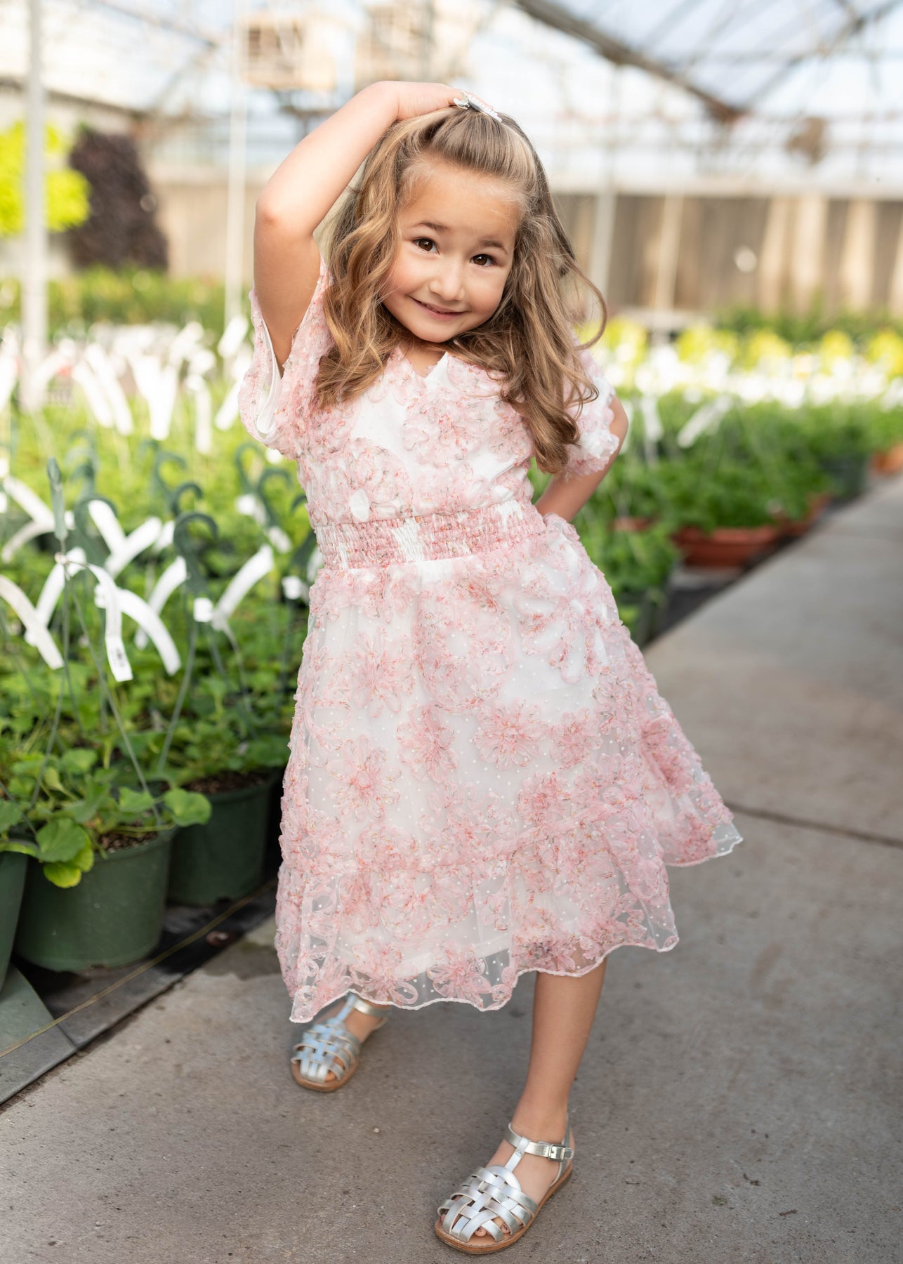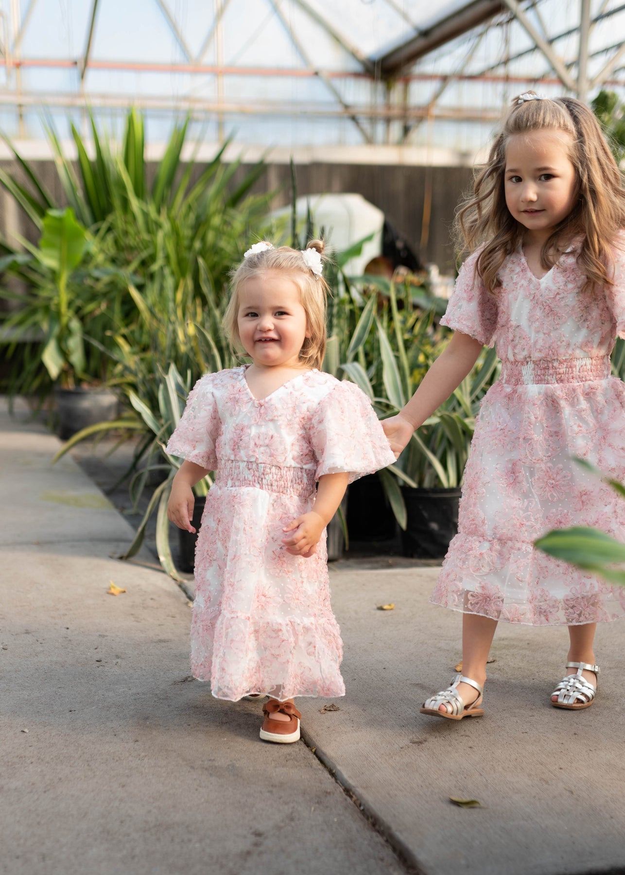 The Aubree Pink Floral Girls Dress is the sweetest mini made to match mama in style. Featuring the same beautiful pink floral textured print with swiss dot detail throughout, this dress has soft flutter sleeves and a comfortable fit that’s perfect for twirling. Fully lined with a charming single tier skirt, it’s designed for special memories and everyday magic alike.