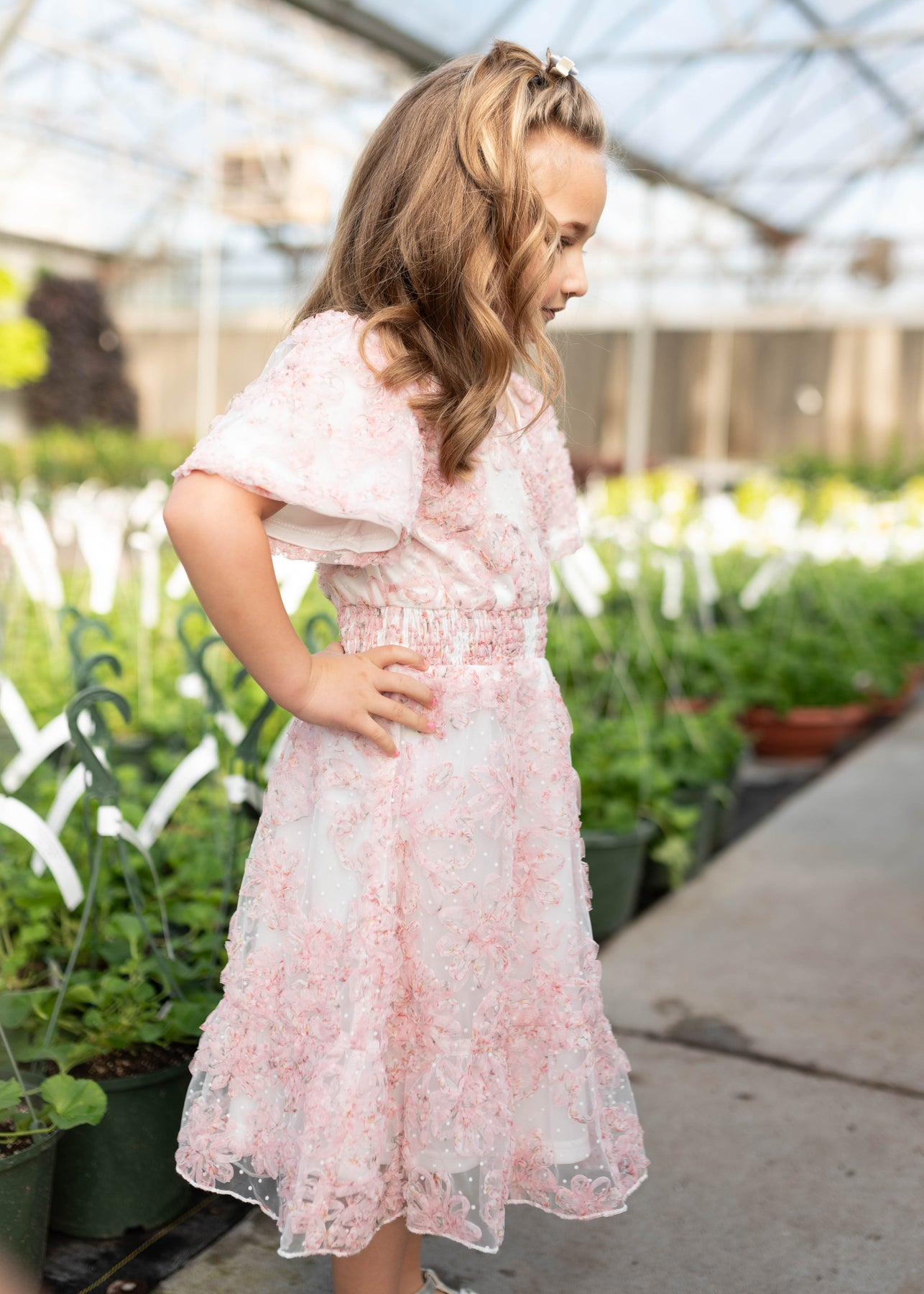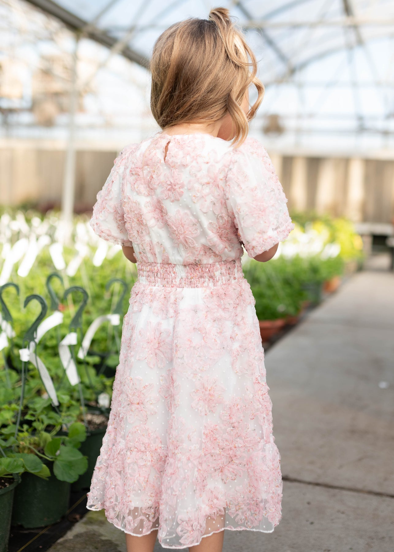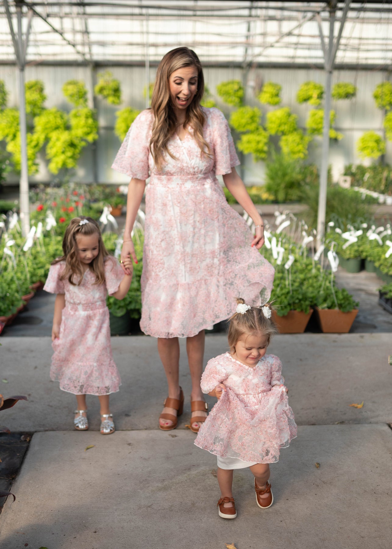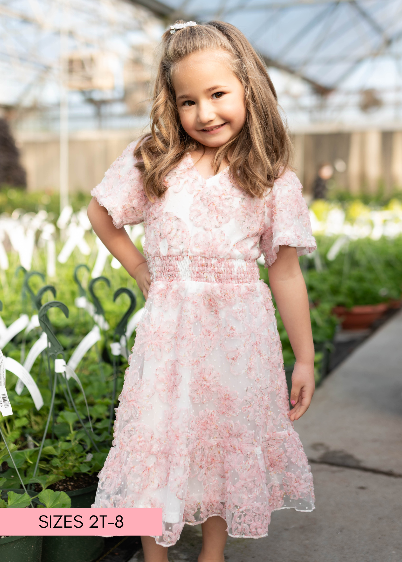 The Aubree Pink Floral Girls Dress is the sweetest mini made to match mama in style. Featuring the same beautiful pink floral textured print with swiss dot detail throughout, this dress has soft flutter sleeves and a comfortable fit that’s perfect for twirling. Fully lined with a charming single tier skirt, it’s designed for special memories and everyday magic alike.