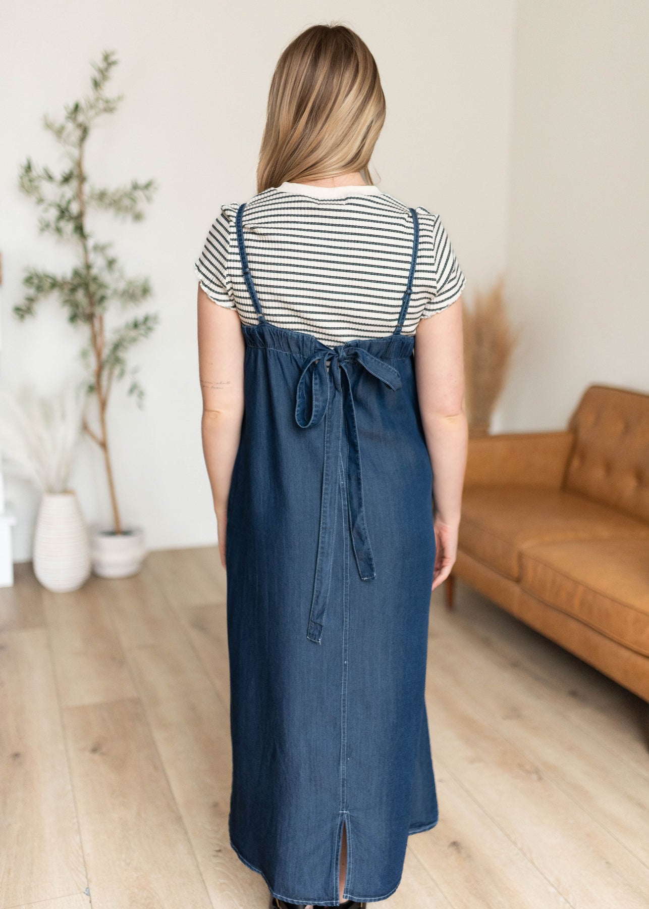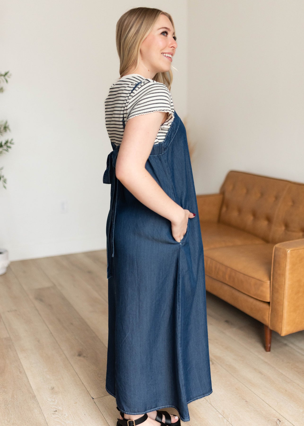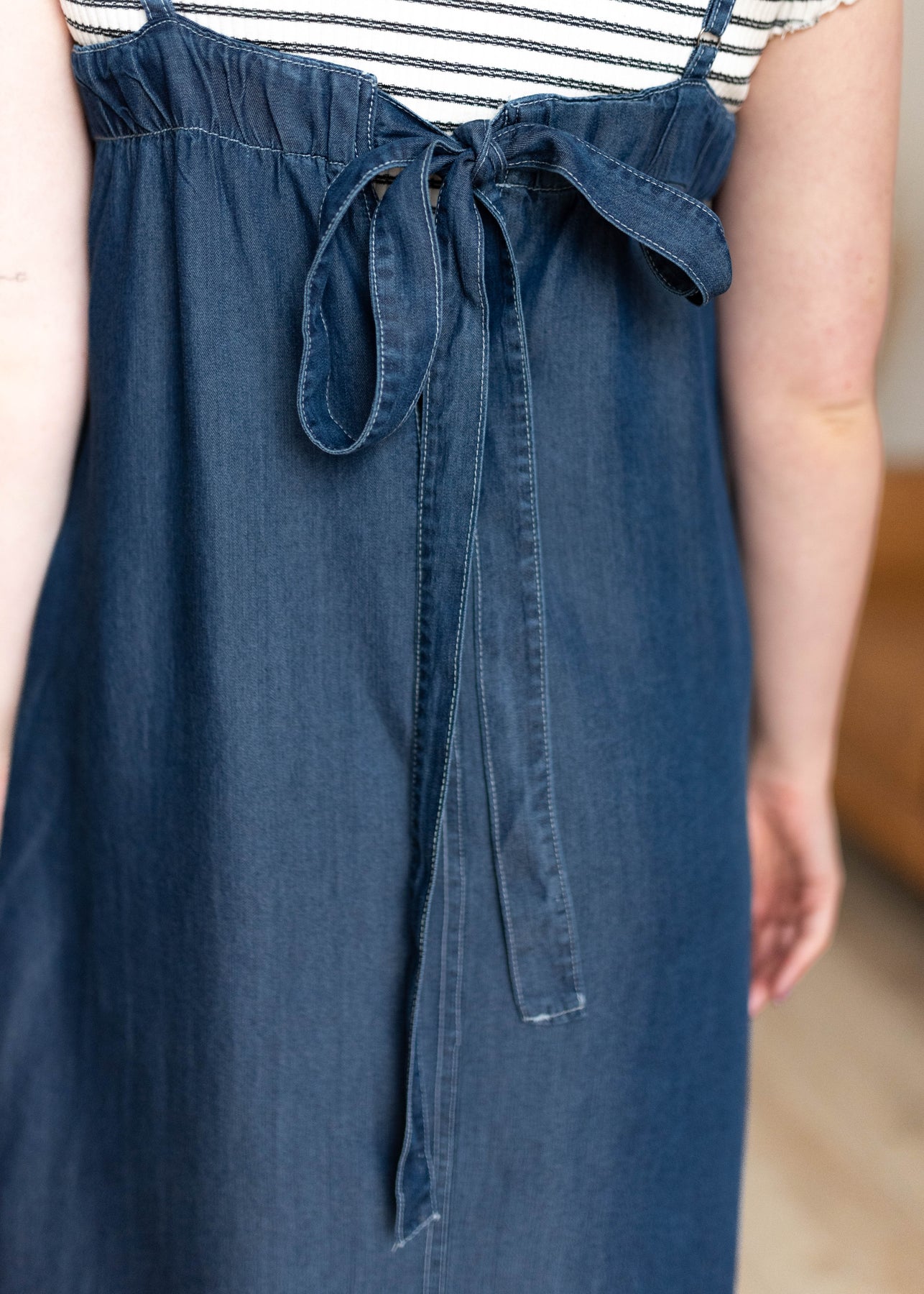 Easy, effortless, and one of those dresses you’ll reach for again and again — the Marie Chambray Dress is made for feeling put together without even trying. Designed in a beautiful dark denim wash, this lightweight midi features a flattering square neckline and adjustable straps for the perfect fit. The relaxed silhouette keeps things comfortable and easy to wear, while the sweet bow tie detail in the back adds just the right feminine touch. And yes… it has pockets (always a win!).