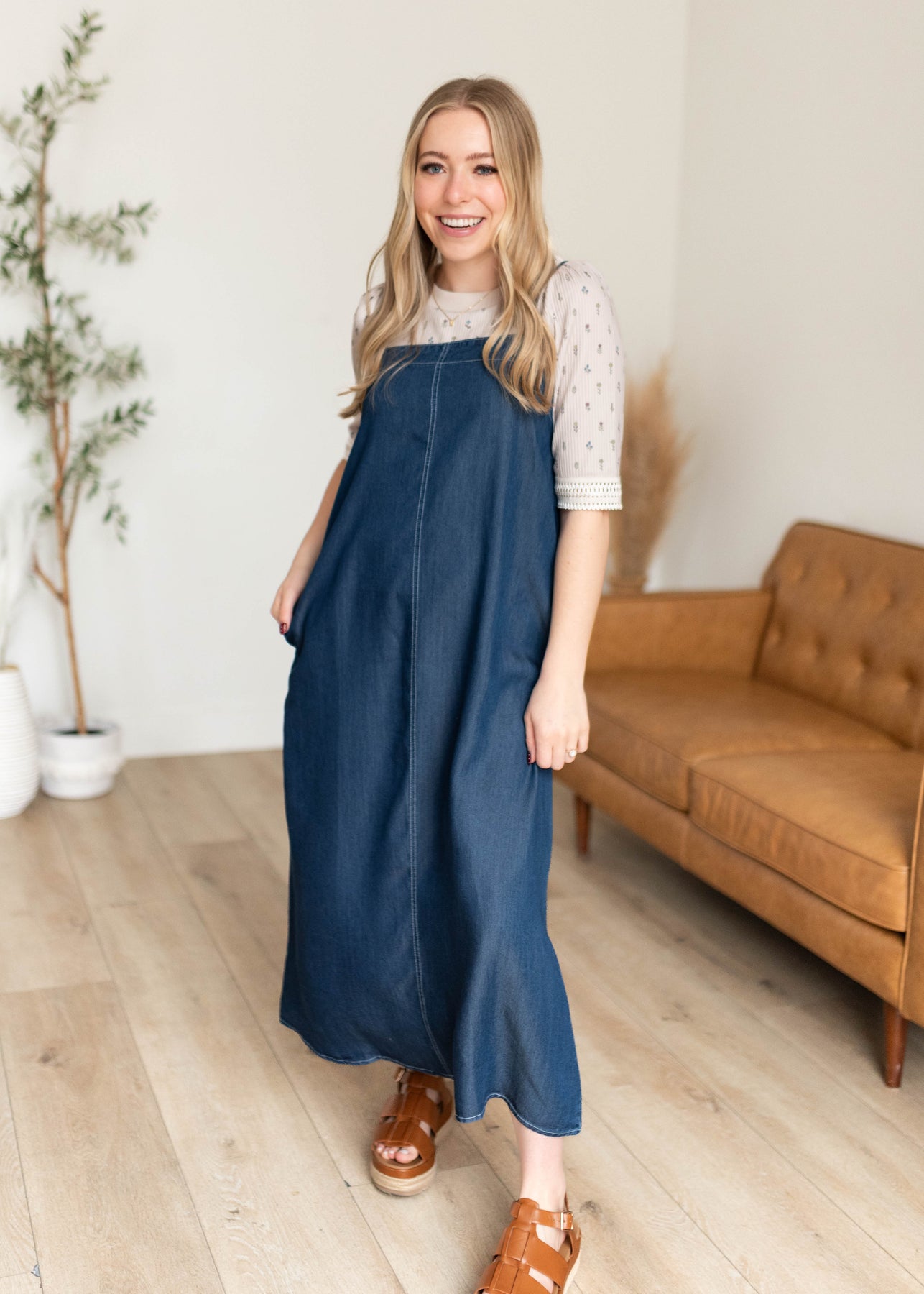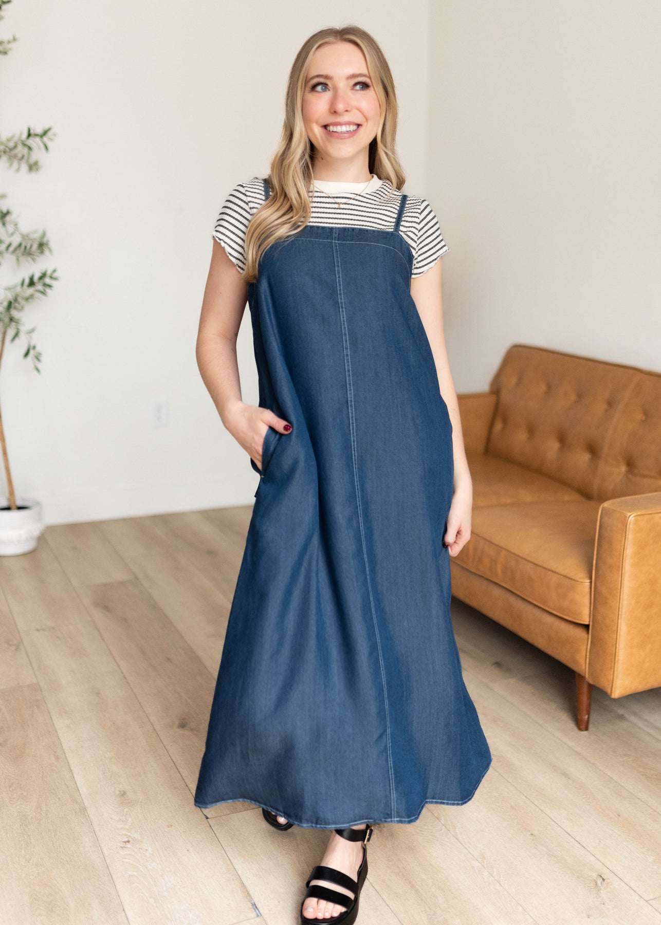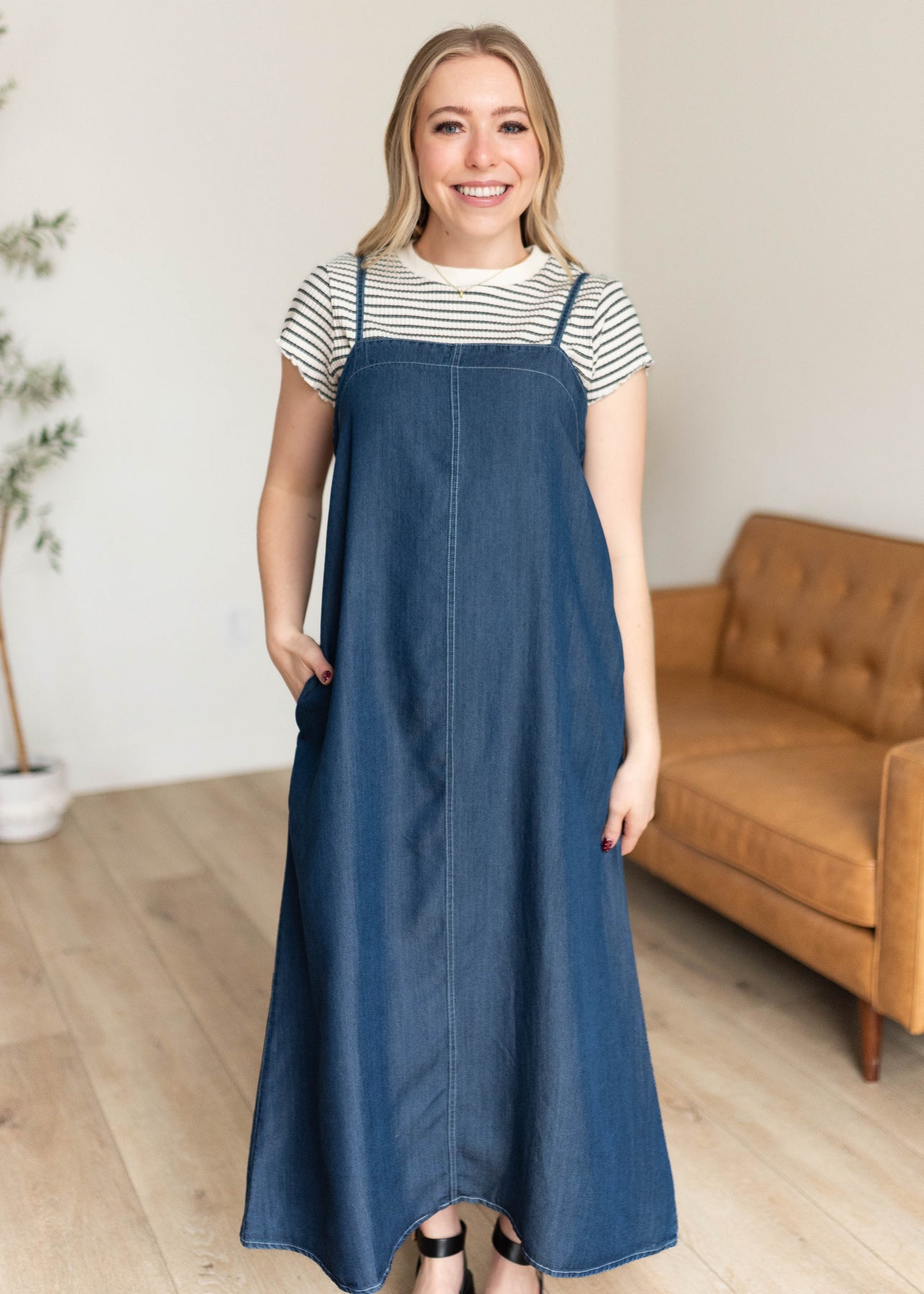Easy, effortless, and one of those dresses you’ll reach for again and again — the Marie Chambray Dress is made for feeling put together without even trying. Designed in a beautiful dark denim wash, this lightweight midi features a flattering square neckline and adjustable straps for the perfect fit. The relaxed silhouette keeps things comfortable and easy to wear, while the sweet bow tie detail in the back adds just the right feminine touch. And yes… it has pockets (always a win!).