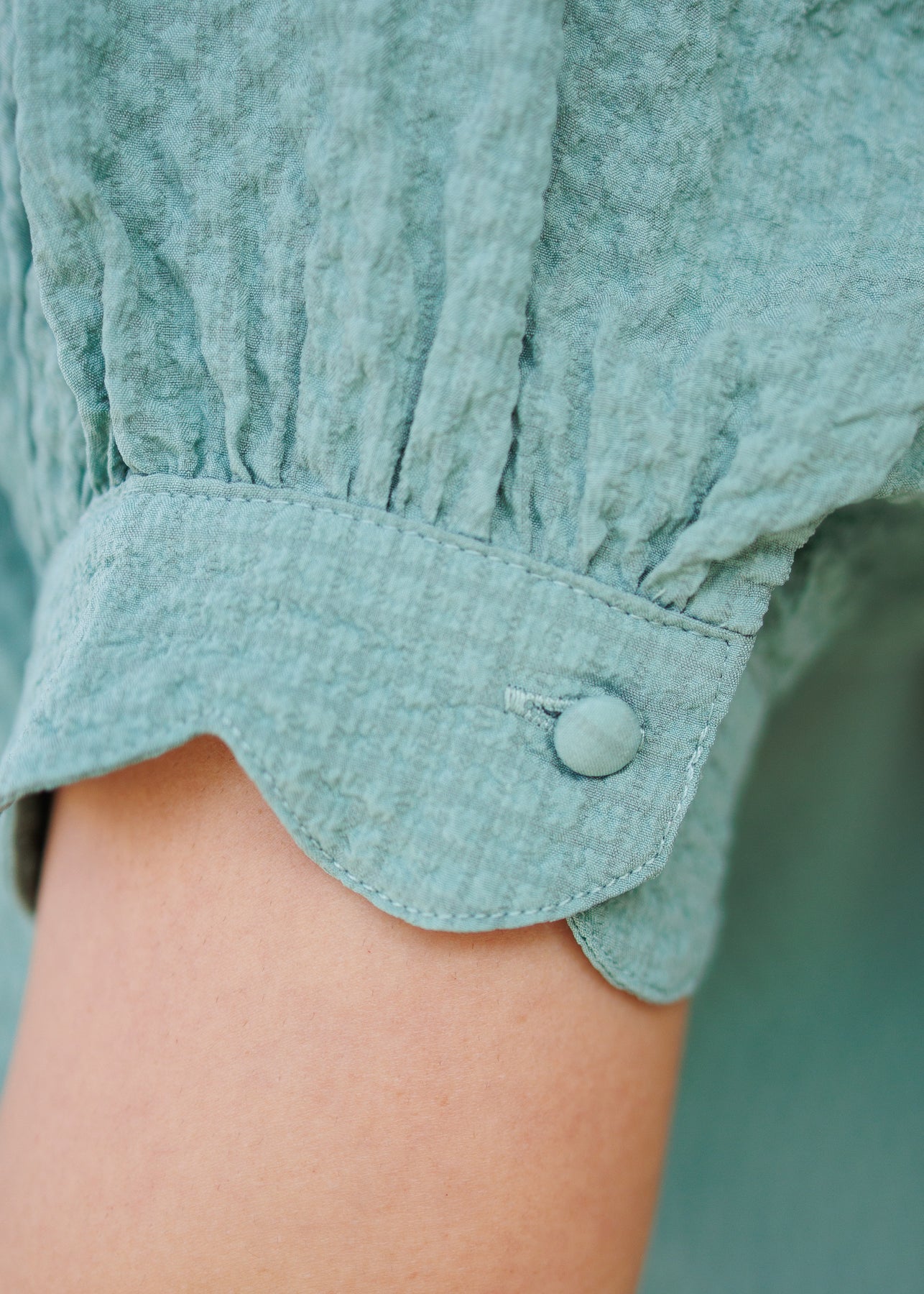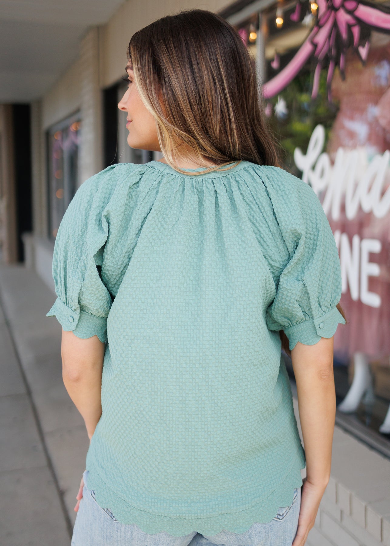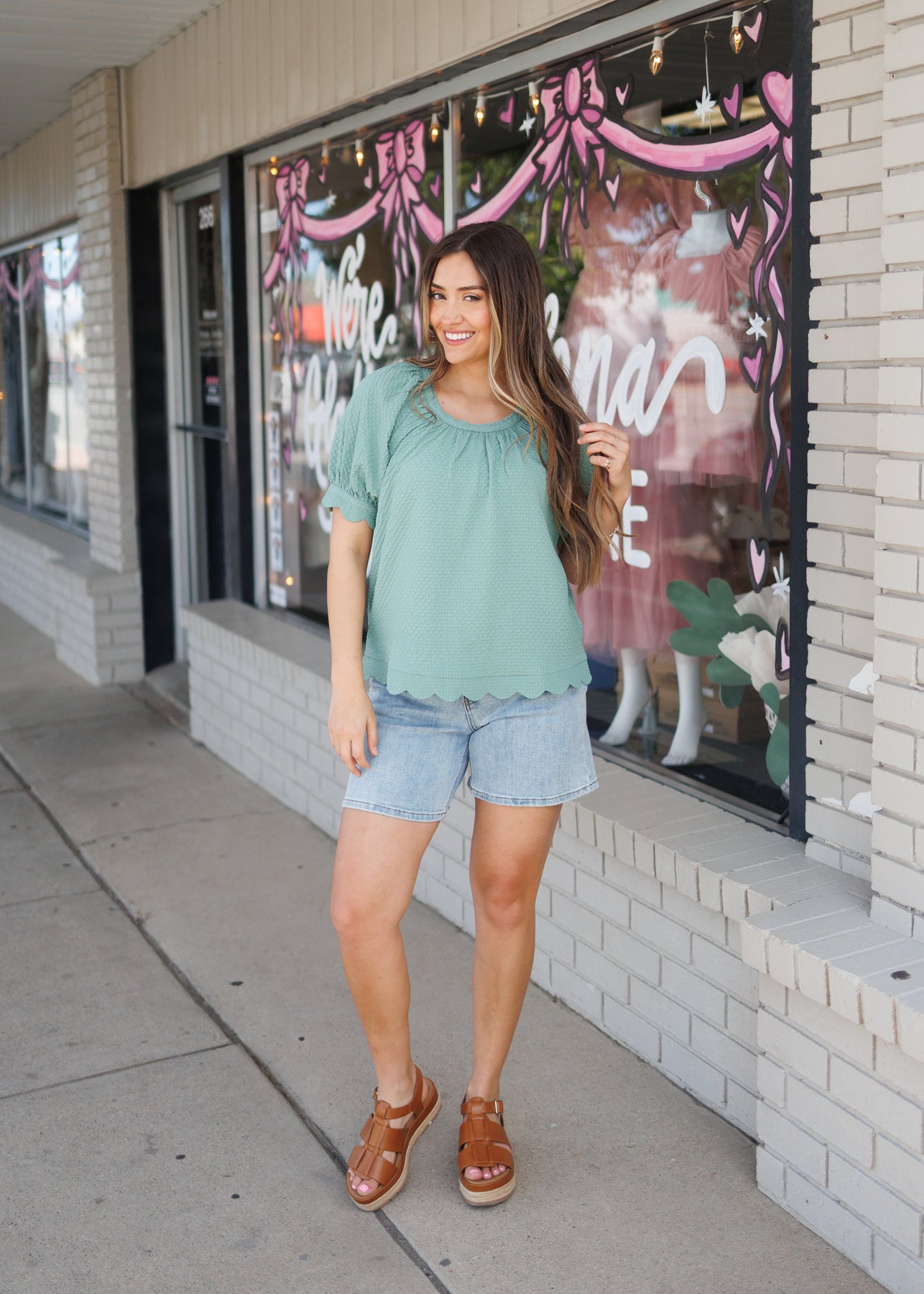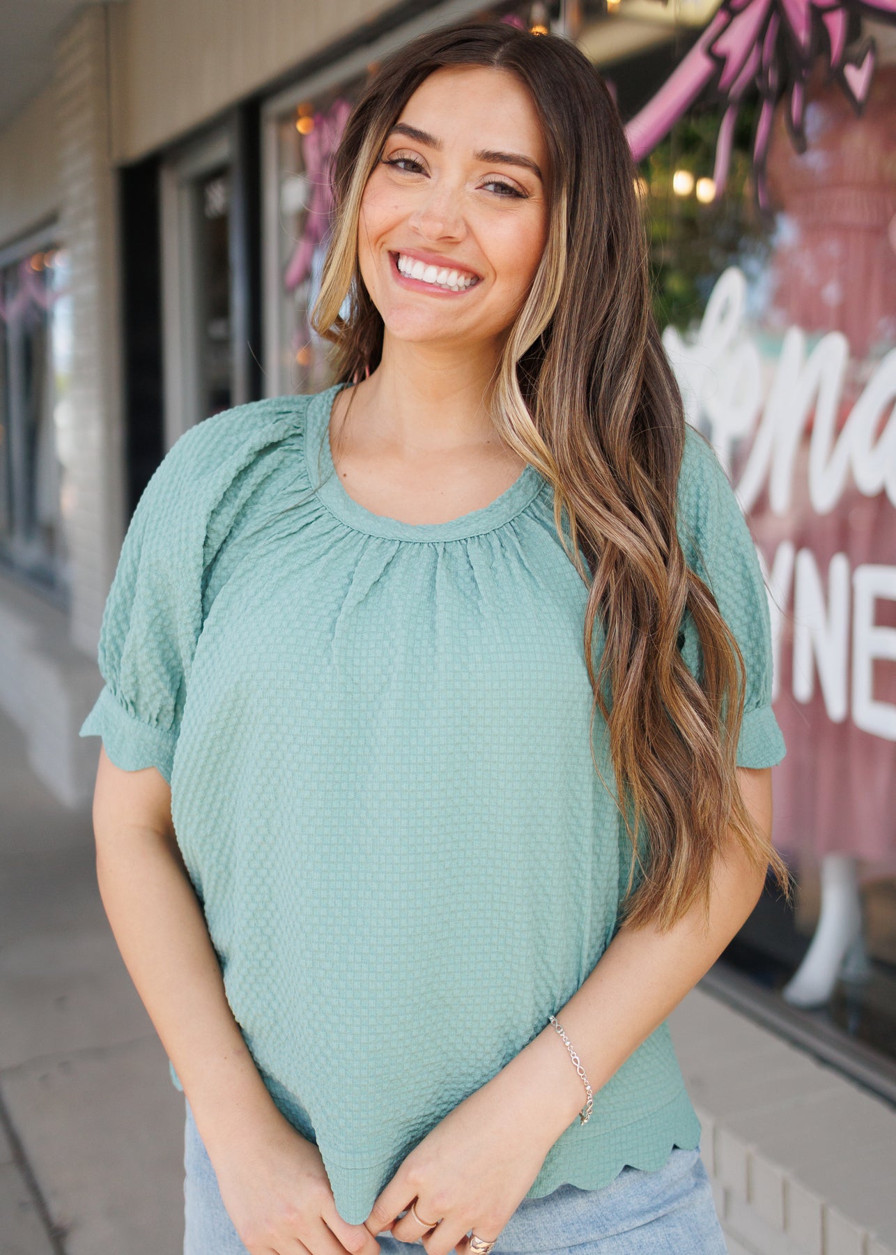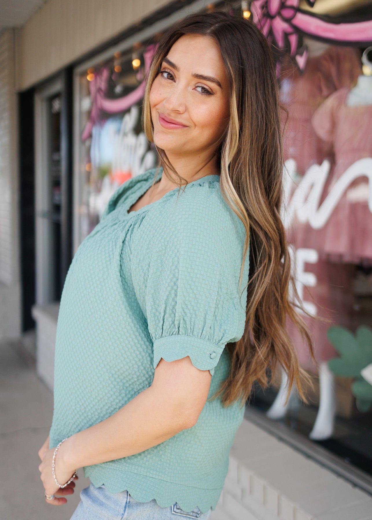 Feminine, textured, and effortlessly polished — the Gracie Deep Sage Textured Top is a beautiful staple with elevated detail. Designed in a rich deep sage hue, this top features a classic round neckline and soft textured fabric that adds dimension to your look. The ruffle details along the sleeves and hem bring a delicate, romantic touch, while the buttoned sleeves add a subtle, tailored finish. With a full-length fit, it’s easy to style tucked or untucked for any occasion.