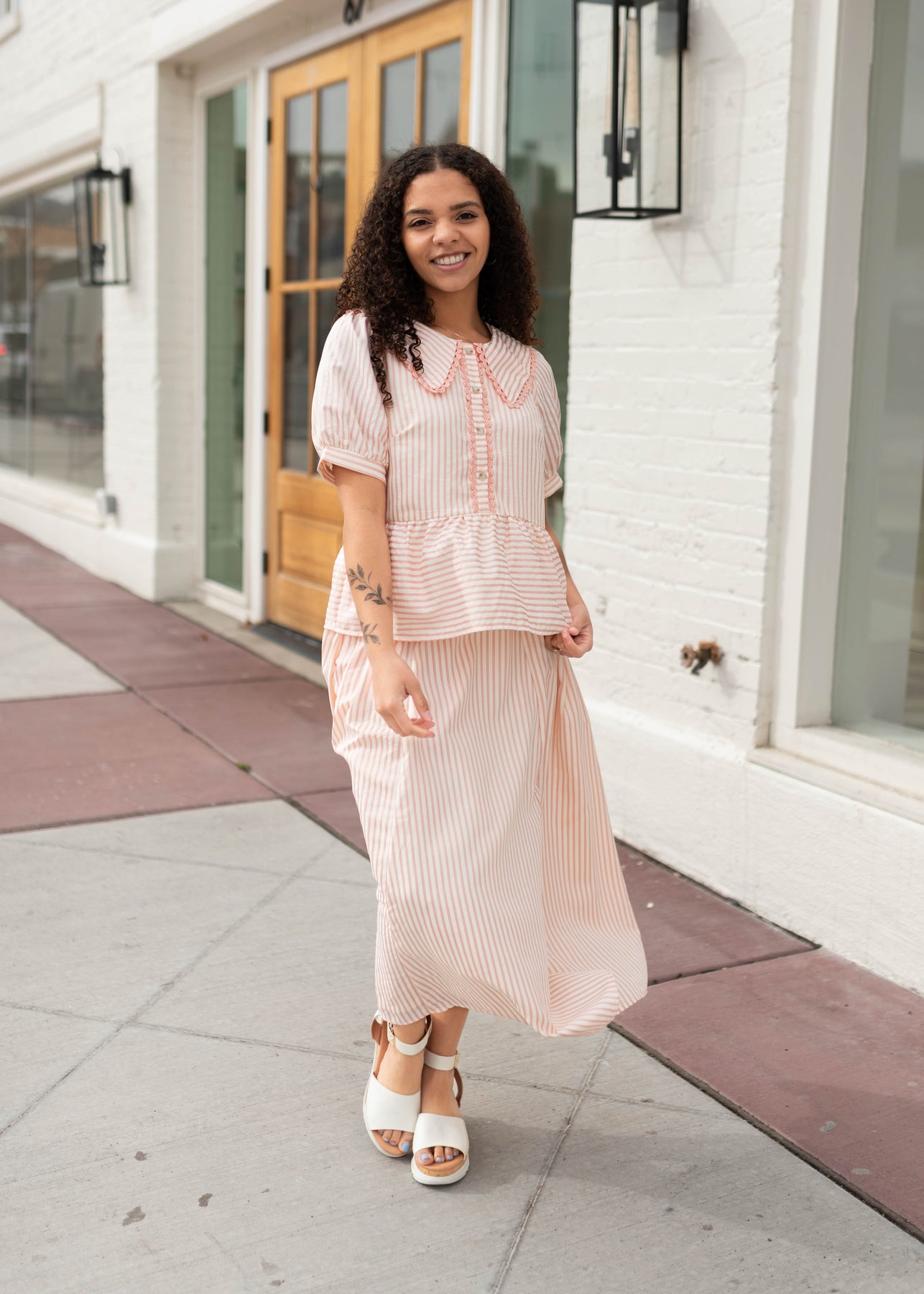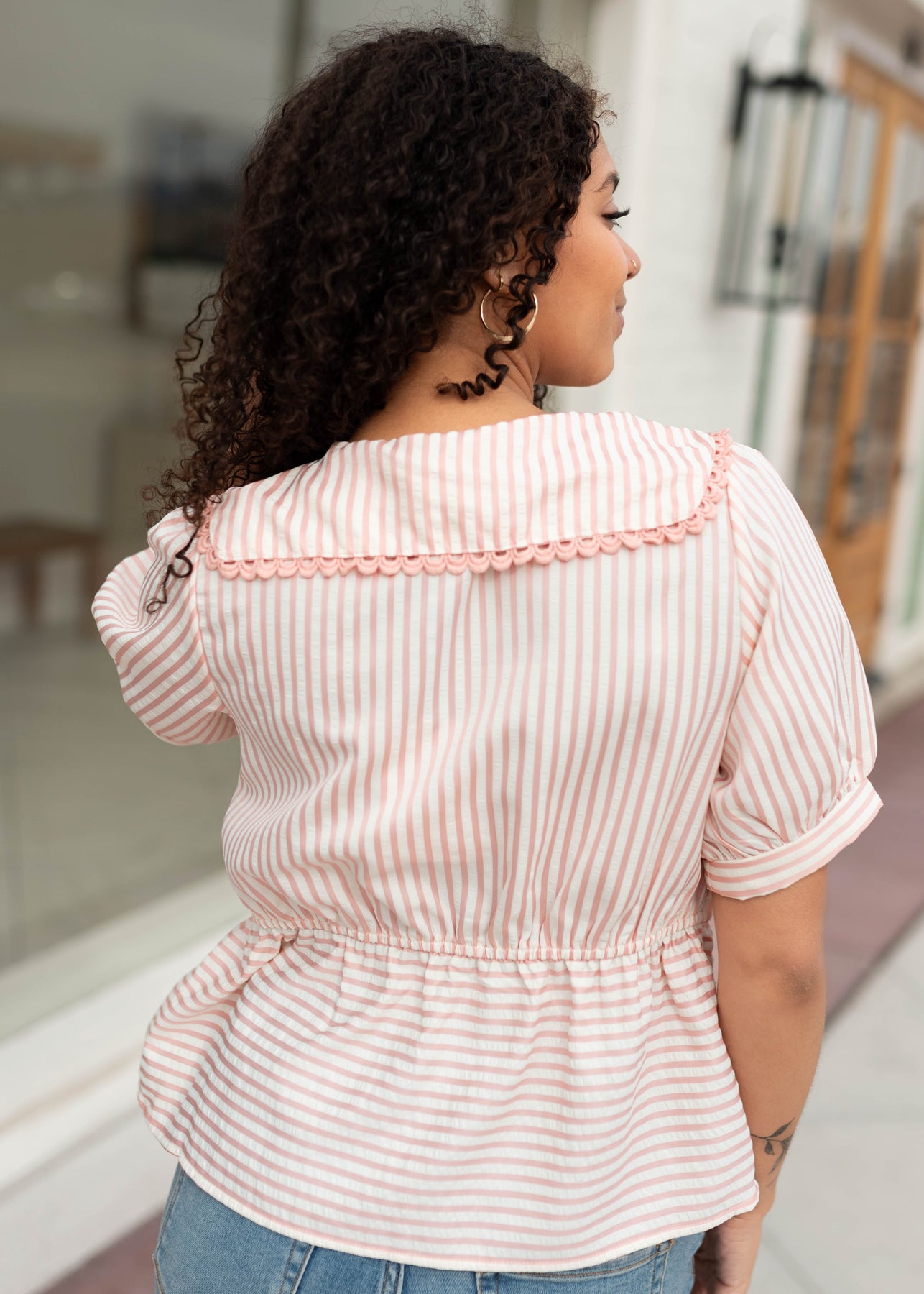 Playful, feminine, and full of charming details — the Kendra Pink Striped Collared Top is a standout piece that makes styling feel effortless. Designed with soft pink and cream stripes, this top features an oversized collared neckline accented with delicate lace trim for an extra sweet touch. The babydoll silhouette with a peplum ruffle creates a relaxed, flowy fit, while puff sleeves add soft volume. Finished with a button-up front and a slightly boxy shape, it’s a fun piece to wear on its own or paired with the coordinating skirt for a perfectly matched set.