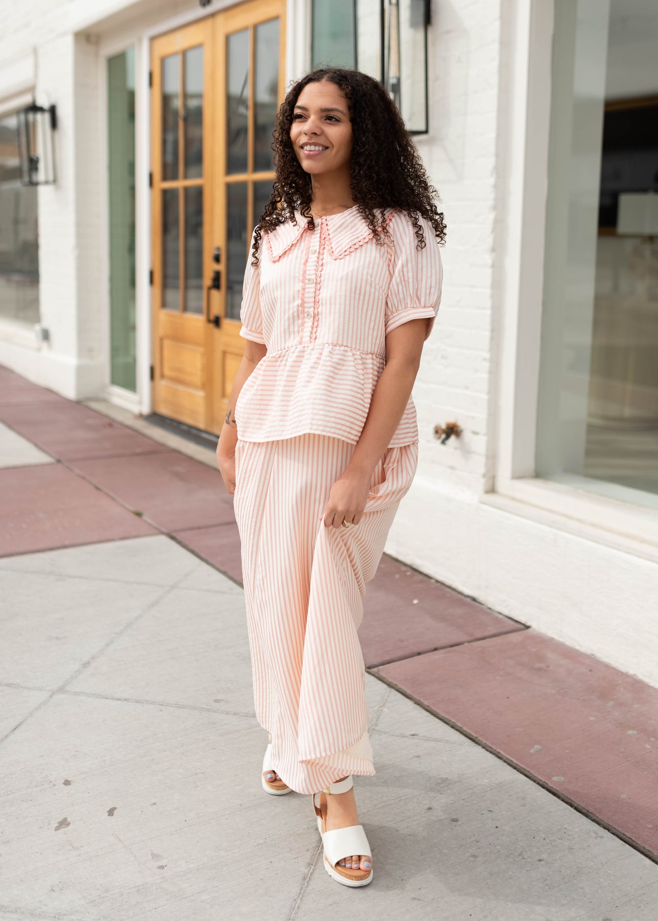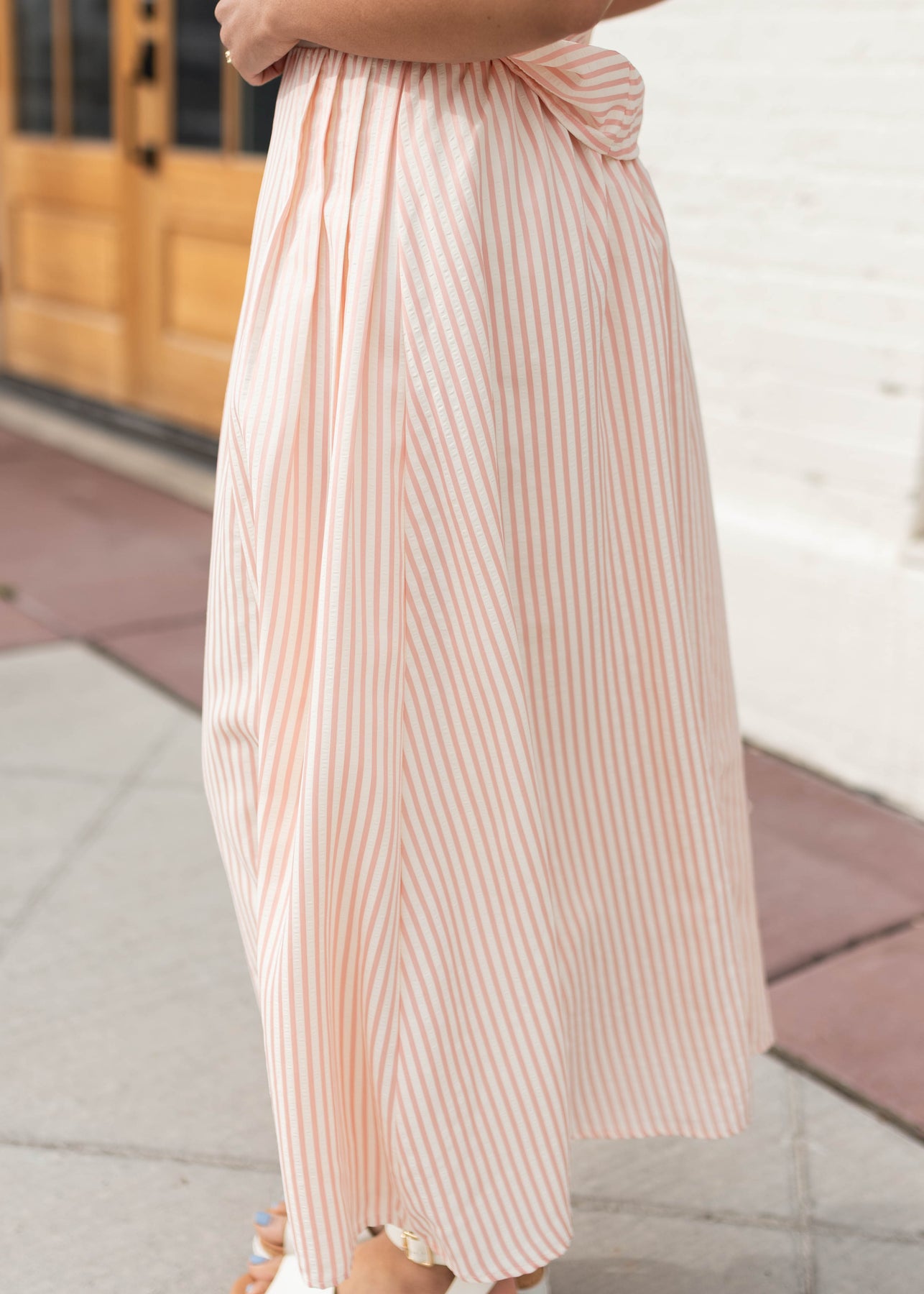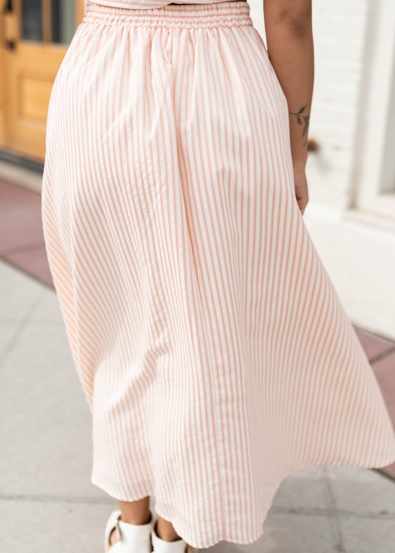 Flowy, feminine, and full of movement — the Kendra Pink Stripe Midi Skirt is the kind of piece that instantly brightens your outfit. Designed with soft pink and white stripes, this skirt features a wide, flowy silhouette with pleated details that create beautiful movement as you walk. The elastic waistband keeps the fit comfortable and easy to wear, while the lined design provides great coverage. Pair it with the coordinating top for a polished matching set or mix and match it with your favorite basics.
