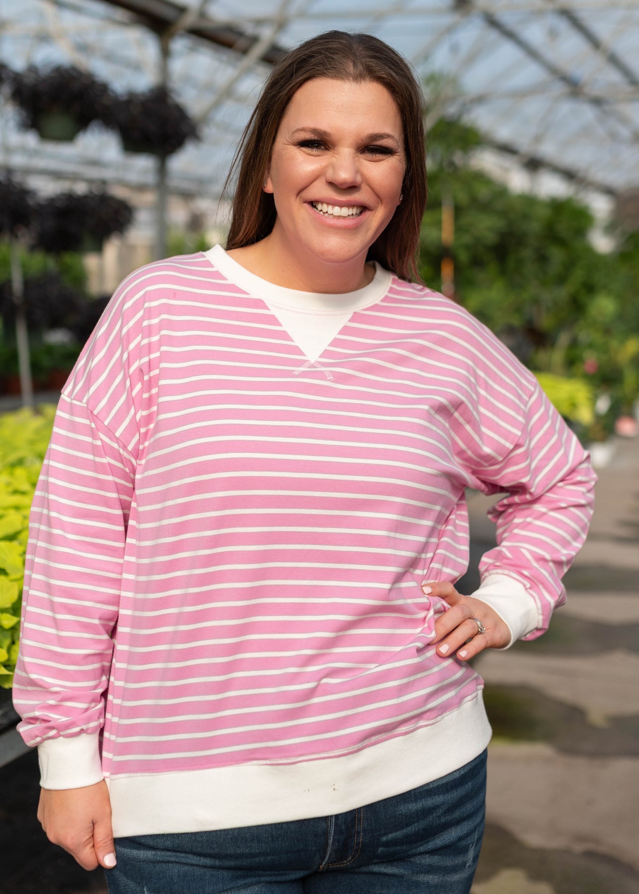 The Tessa Pink Striped Pullover is the perfect blend of comfort and casual style. Designed with a relaxed fit and soft stretch, this pullover features classic stripes, a round neckline with a sweatshirt-style applique detail, and white trim for a polished finish. It’s the kind of layer you’ll throw on again and again.