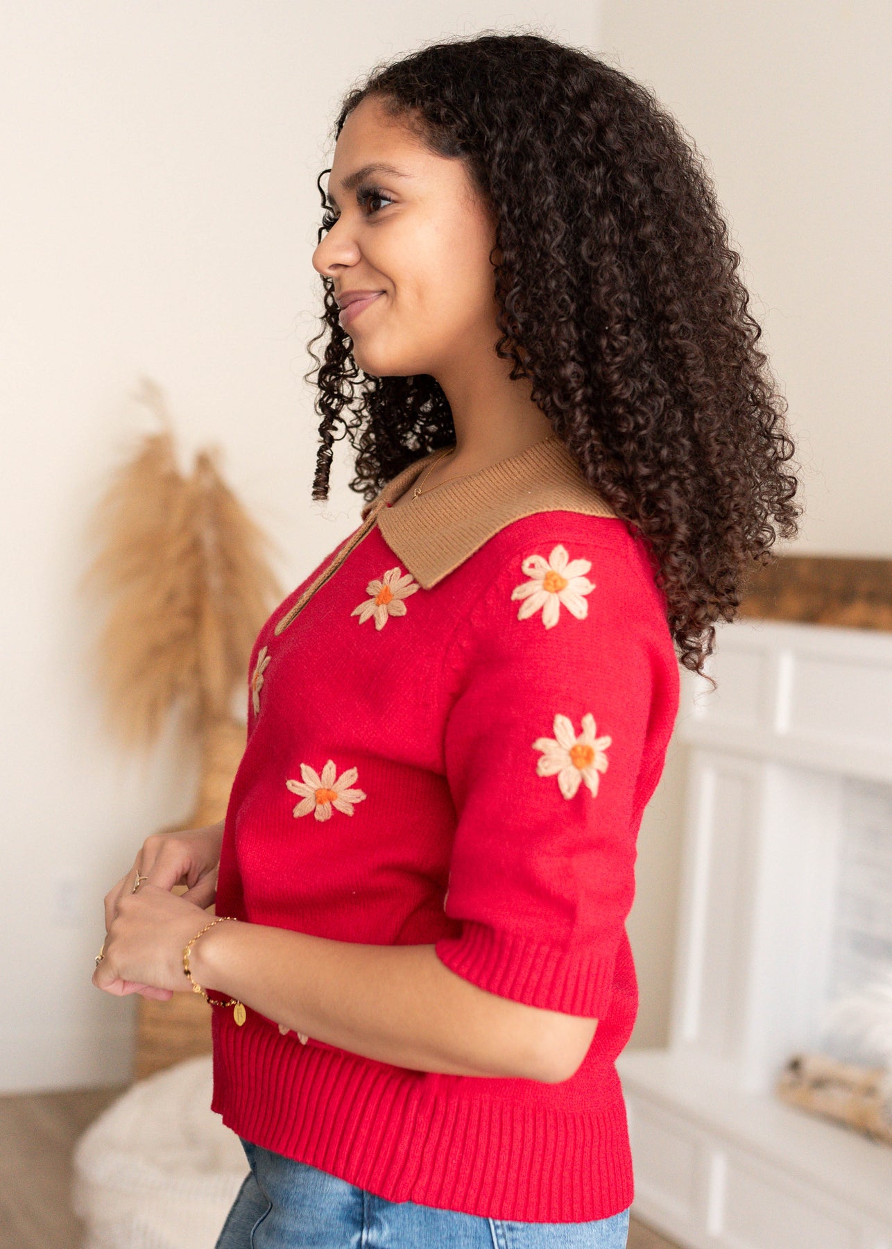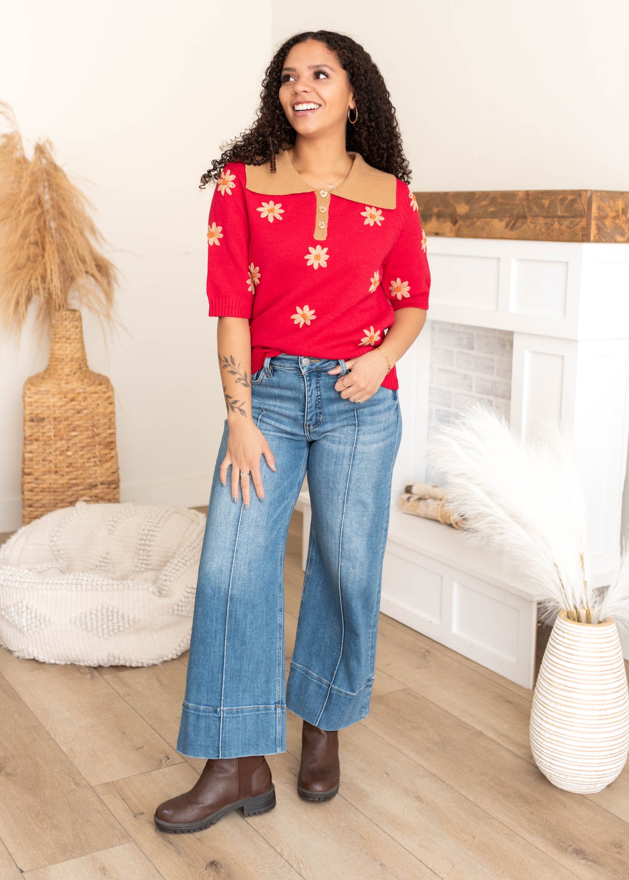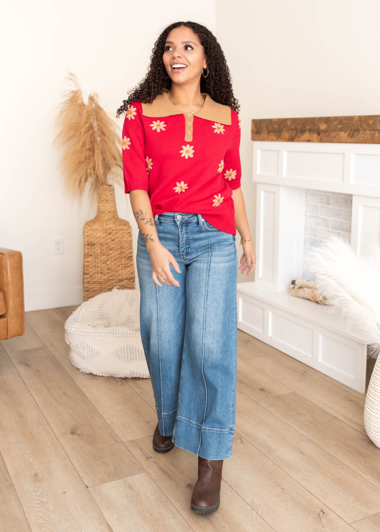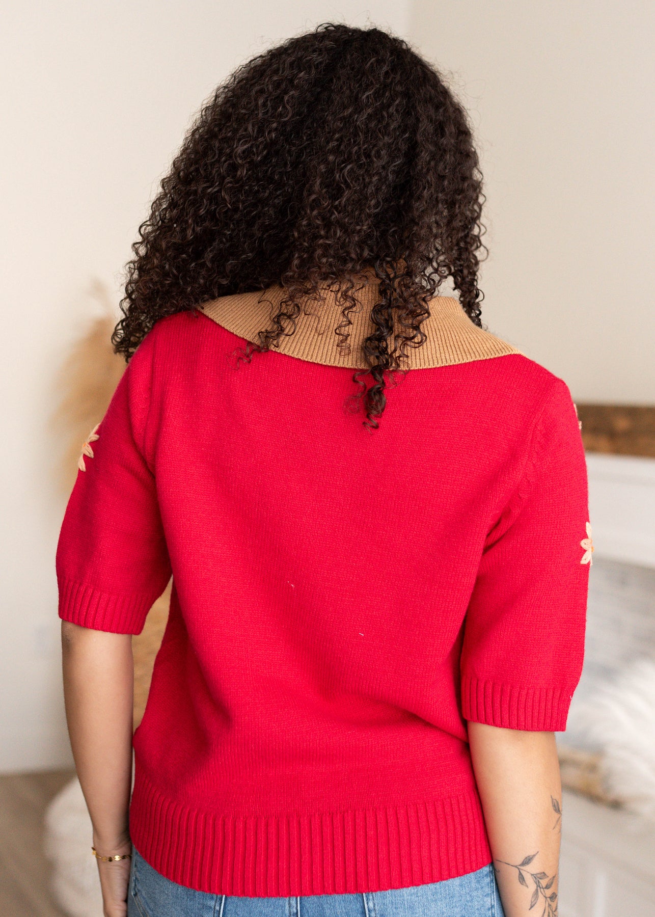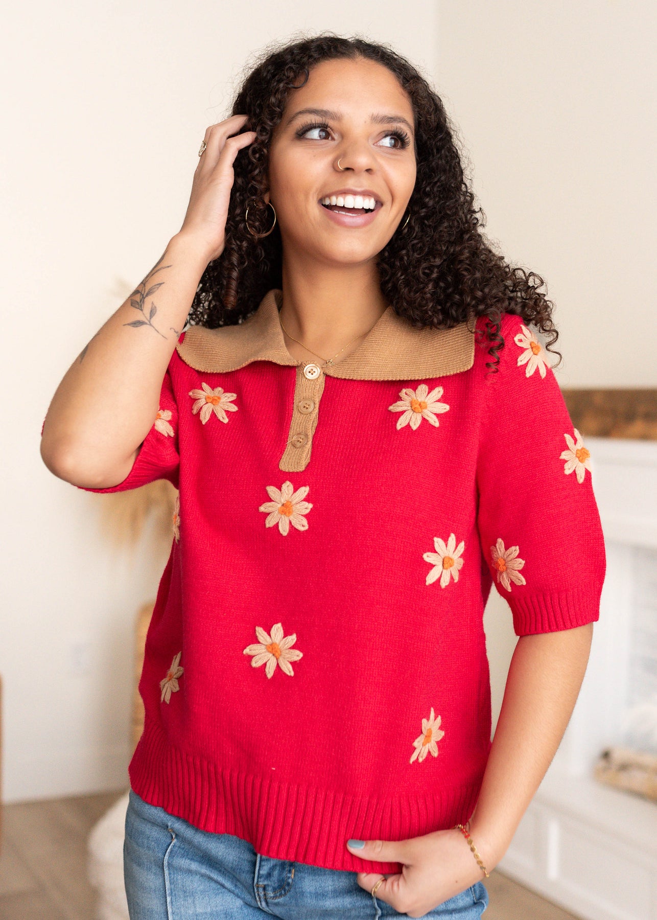 The Danika Red Floral Collared Top is a standout piece that blends cozy knit comfort with thoughtful, elevated details. Featuring a rich red knit bodice, a contrasting tan collar, and delicate embroidered florals, this top feels both classic and special. The half button front and longer sleeves make it easy to wear while adding subtle structure.
