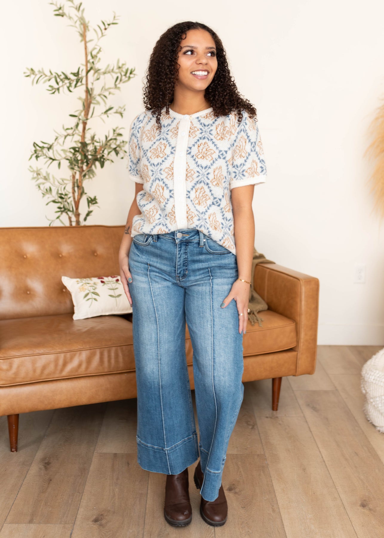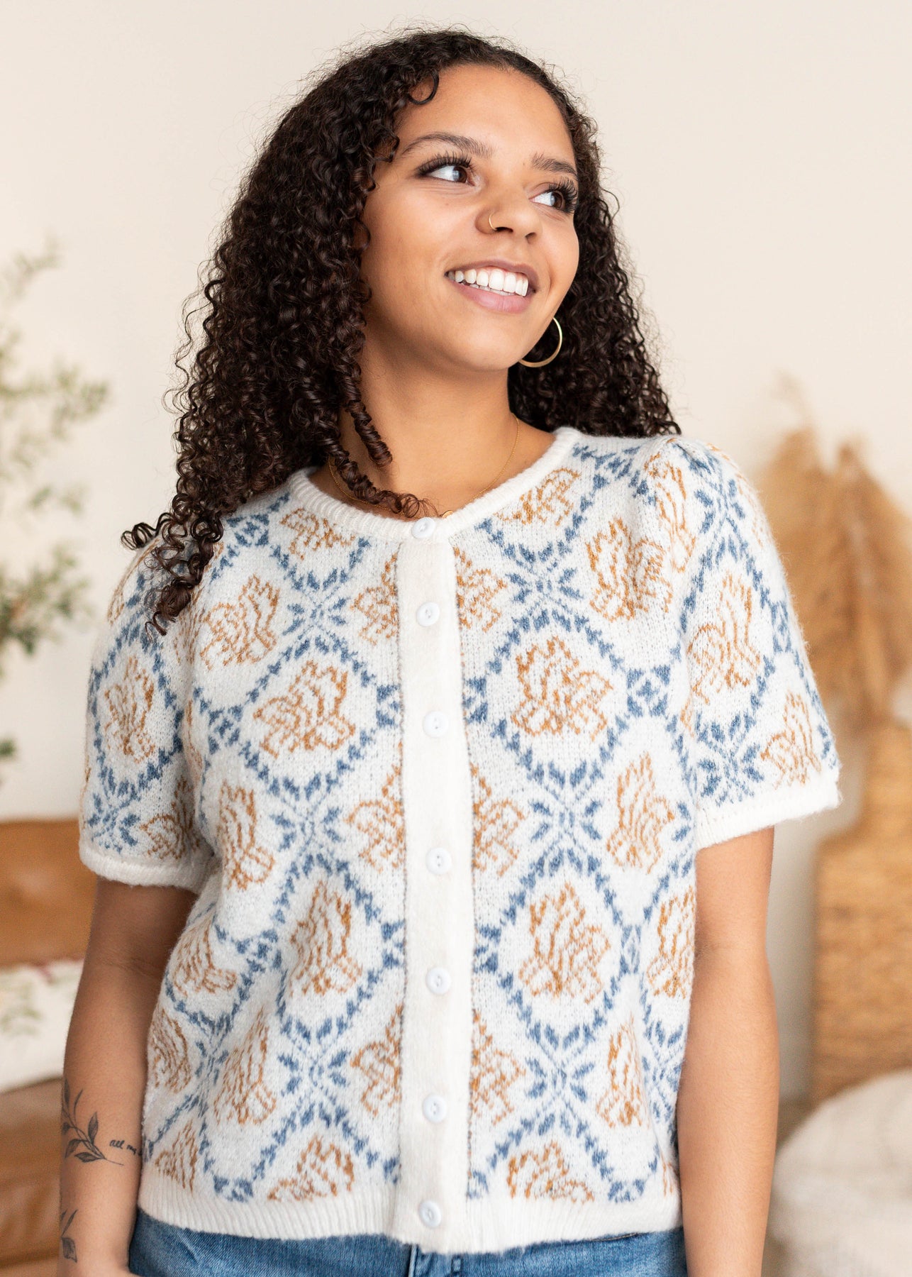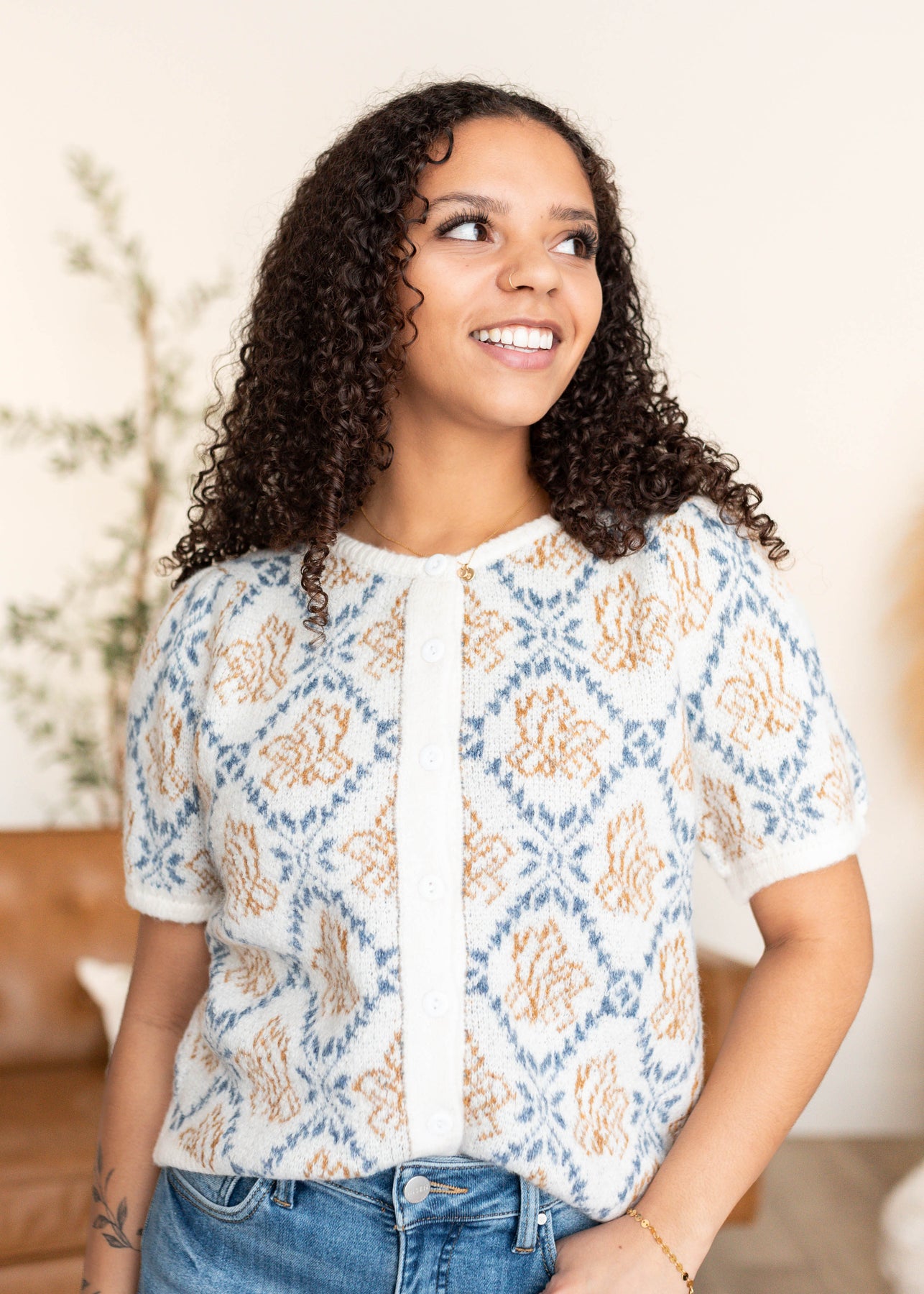 The Maddy Blue Patterned Cardigan is a charming statement layer with a soft, feminine feel. Featuring a blue and cream floral pattern, this cardigan adds a pop of color while remaining easy to style. The short sleeves and button-up front make it a versatile piece you can wear on its own or layered throughout the seasons.