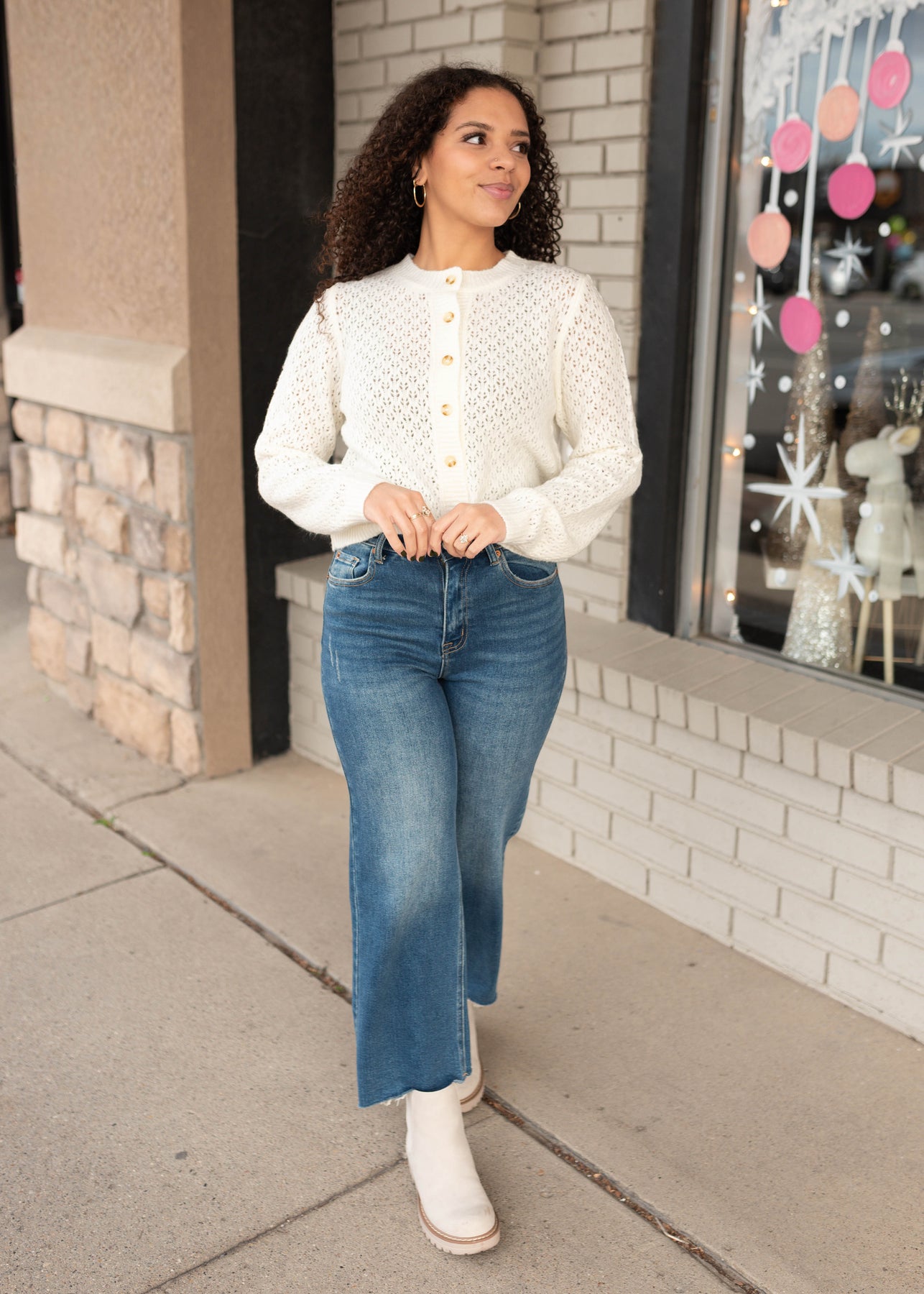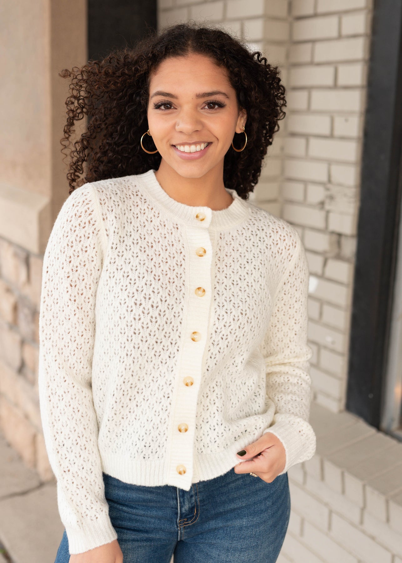 The Mazie Cream Eyelet Cardigan is a soft, feminine layer with timeless appeal. Designed in a creamy neutral shade with delicate eyelet texture, this cardigan adds subtle detail while staying easy to style. The button-up front makes it versatile for wearing open or closed, perfect for effortless layering.