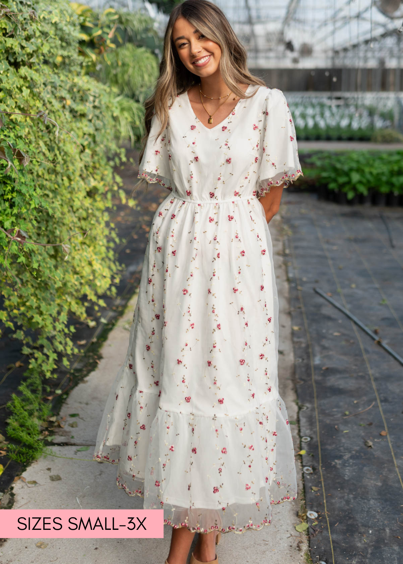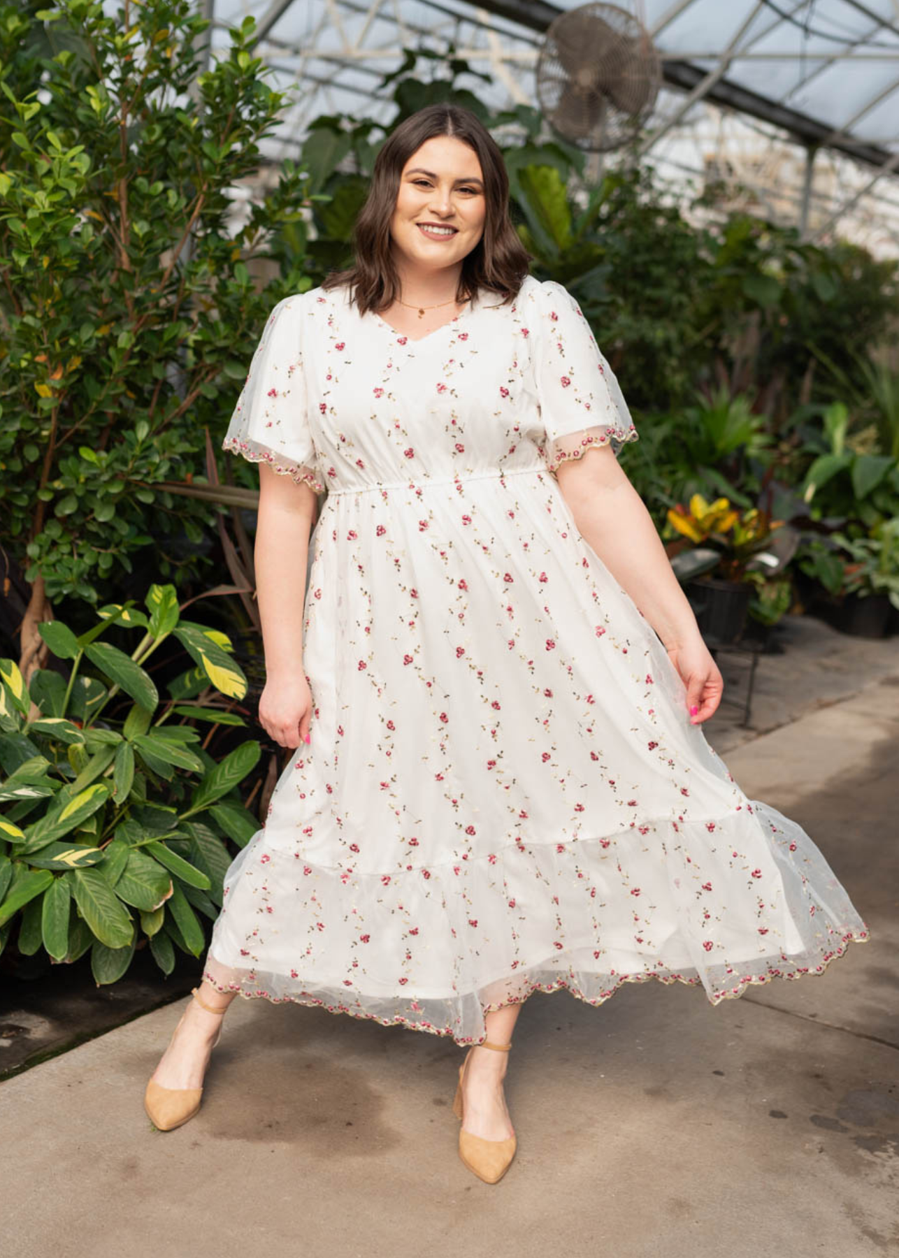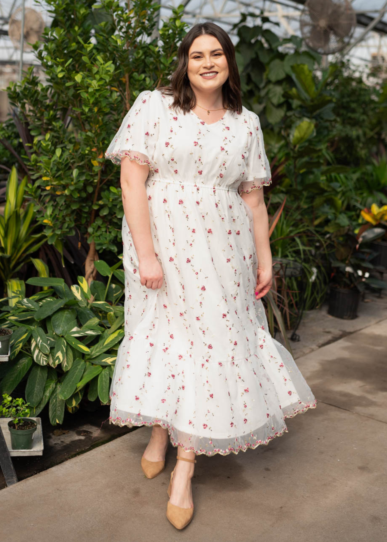 - Amazing embroidered floral mesh overlay that covers the whole dress
