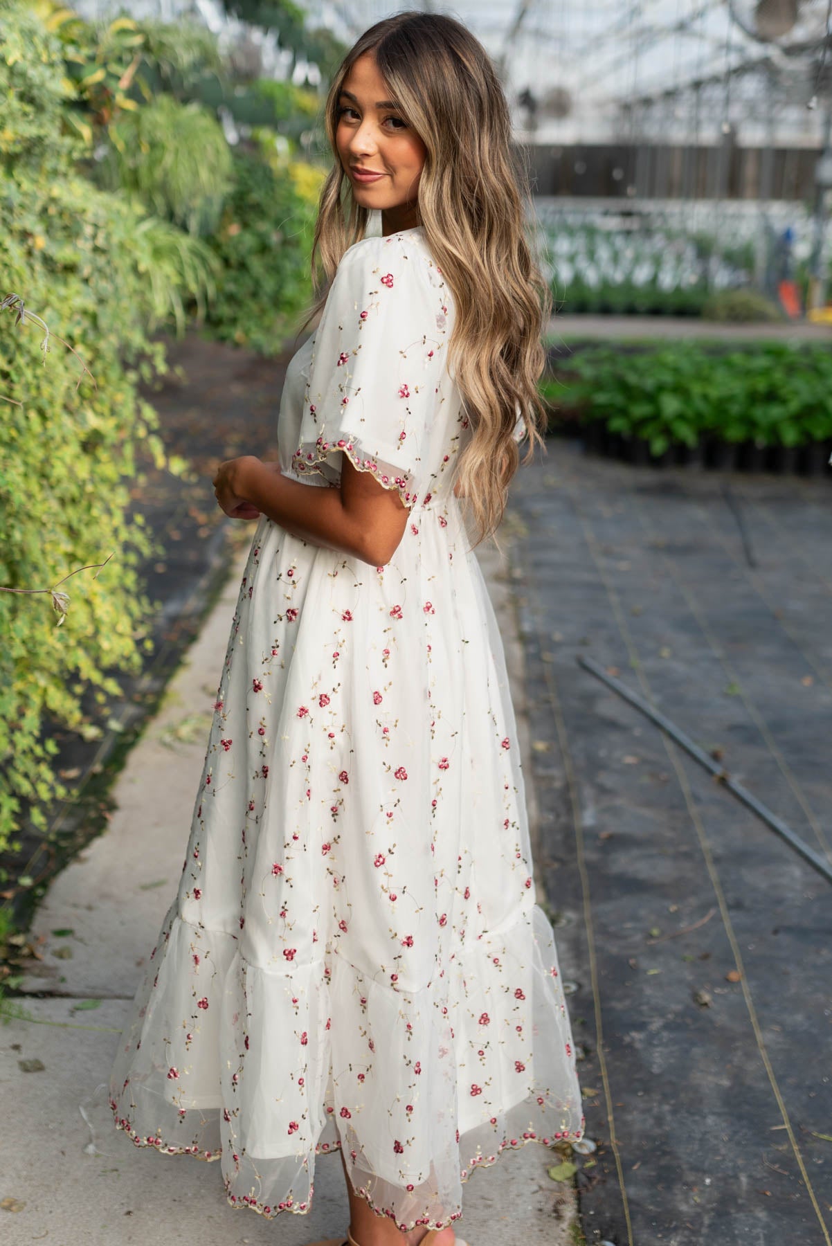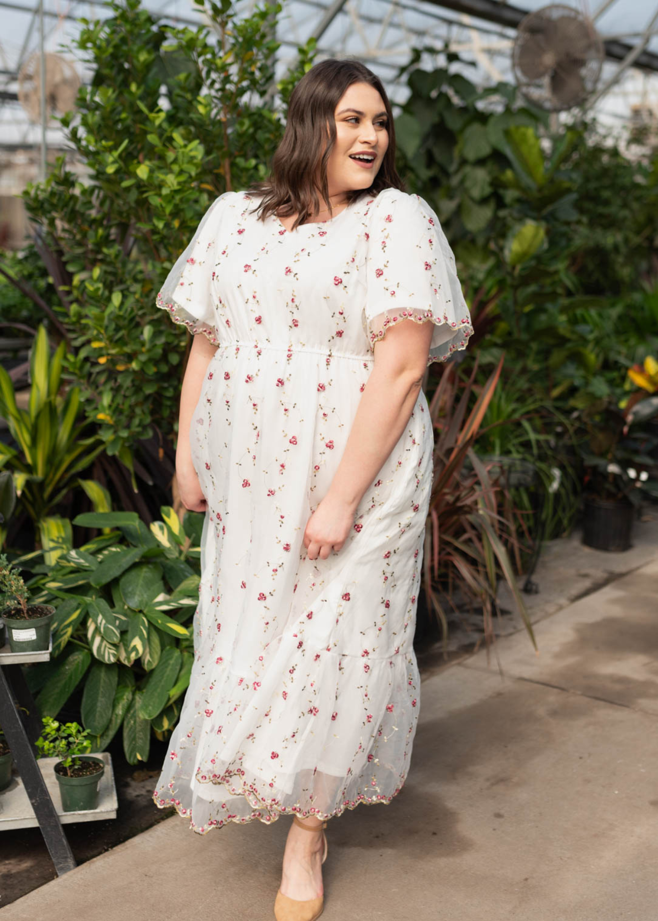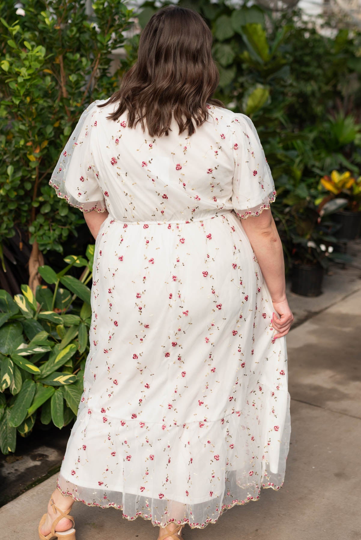- Amazing embroidered floral mesh overlay that covers the whole dress
