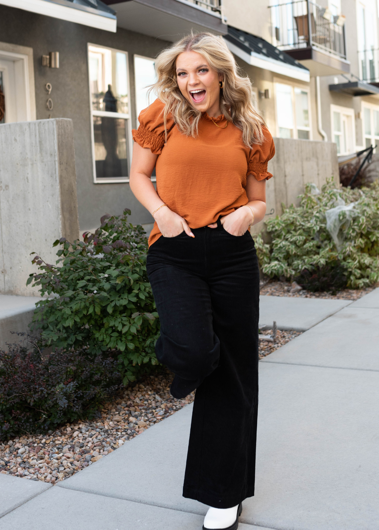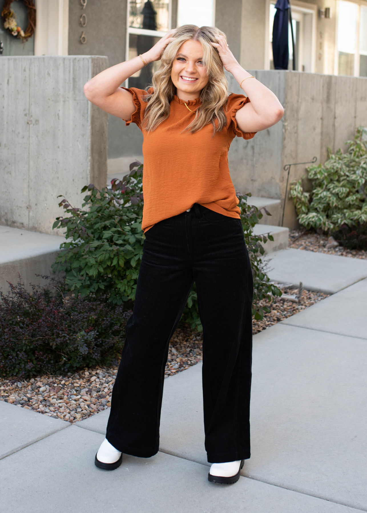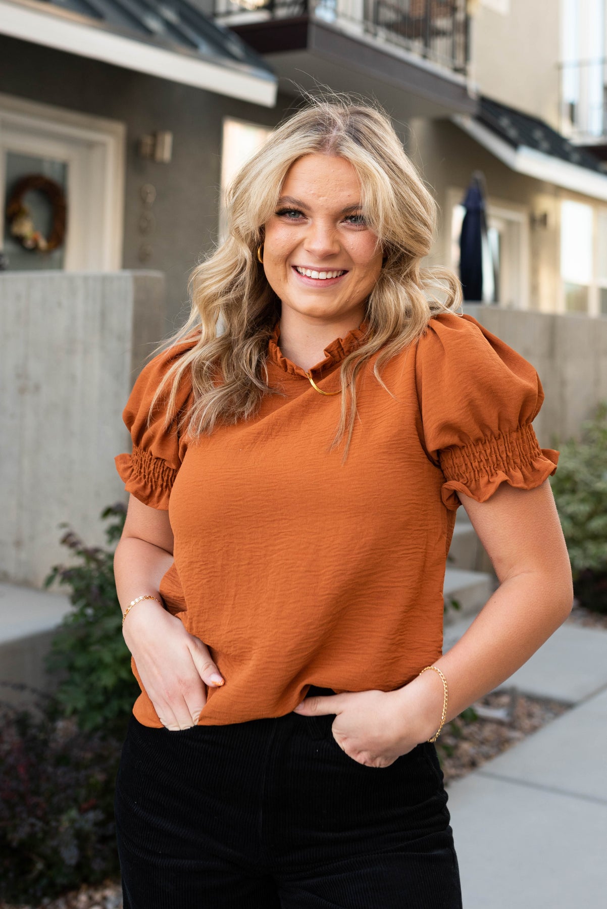 - Ruffled neckline + elastic sleeves