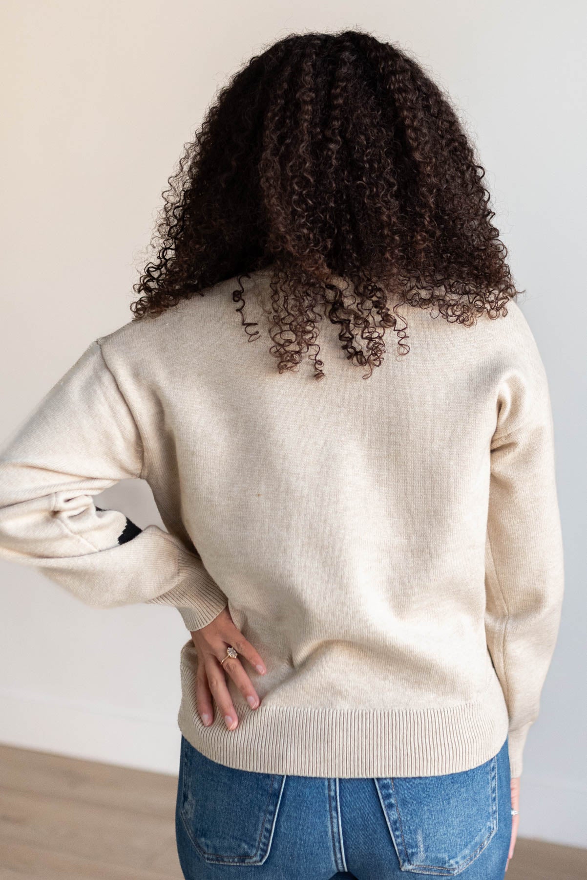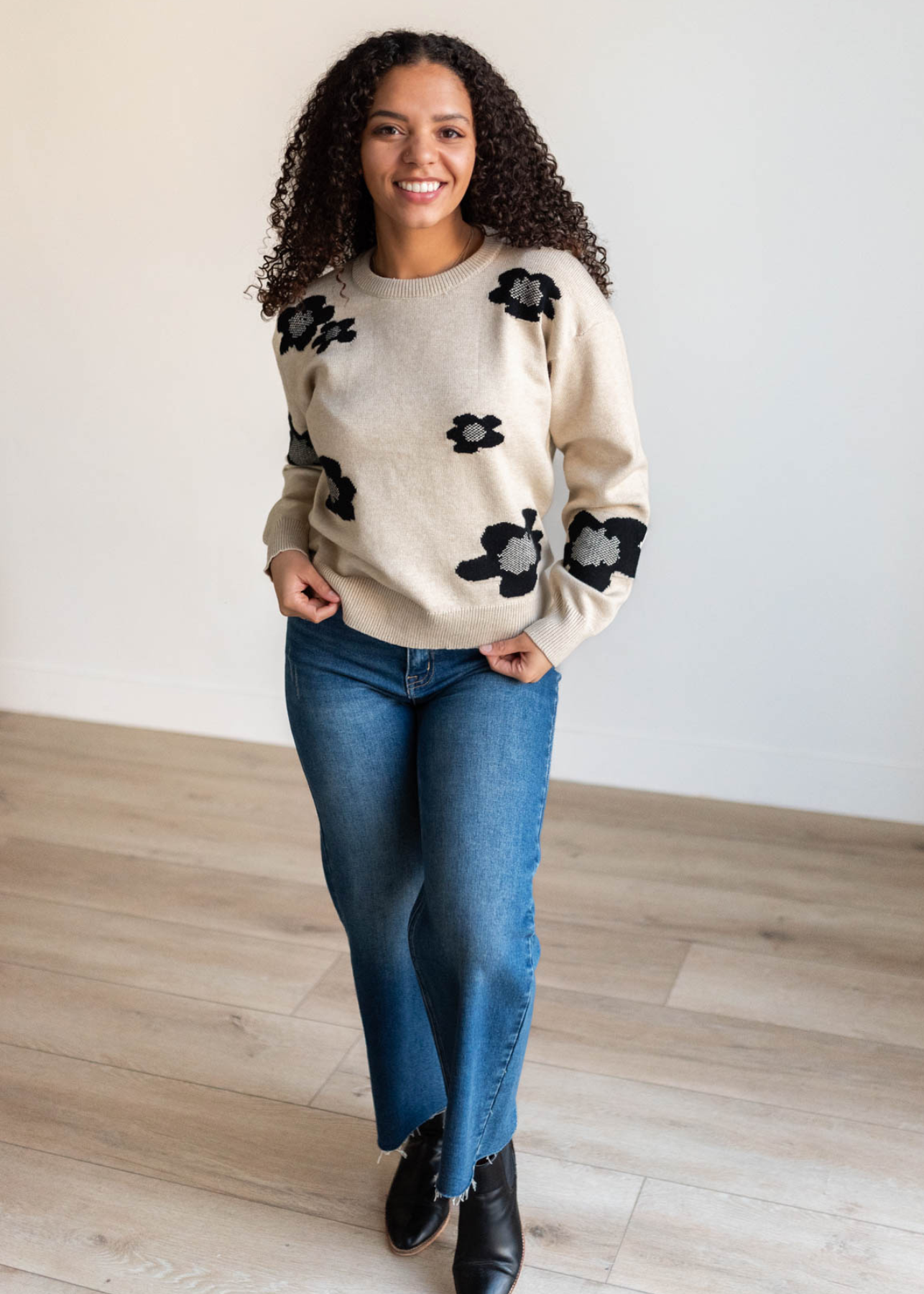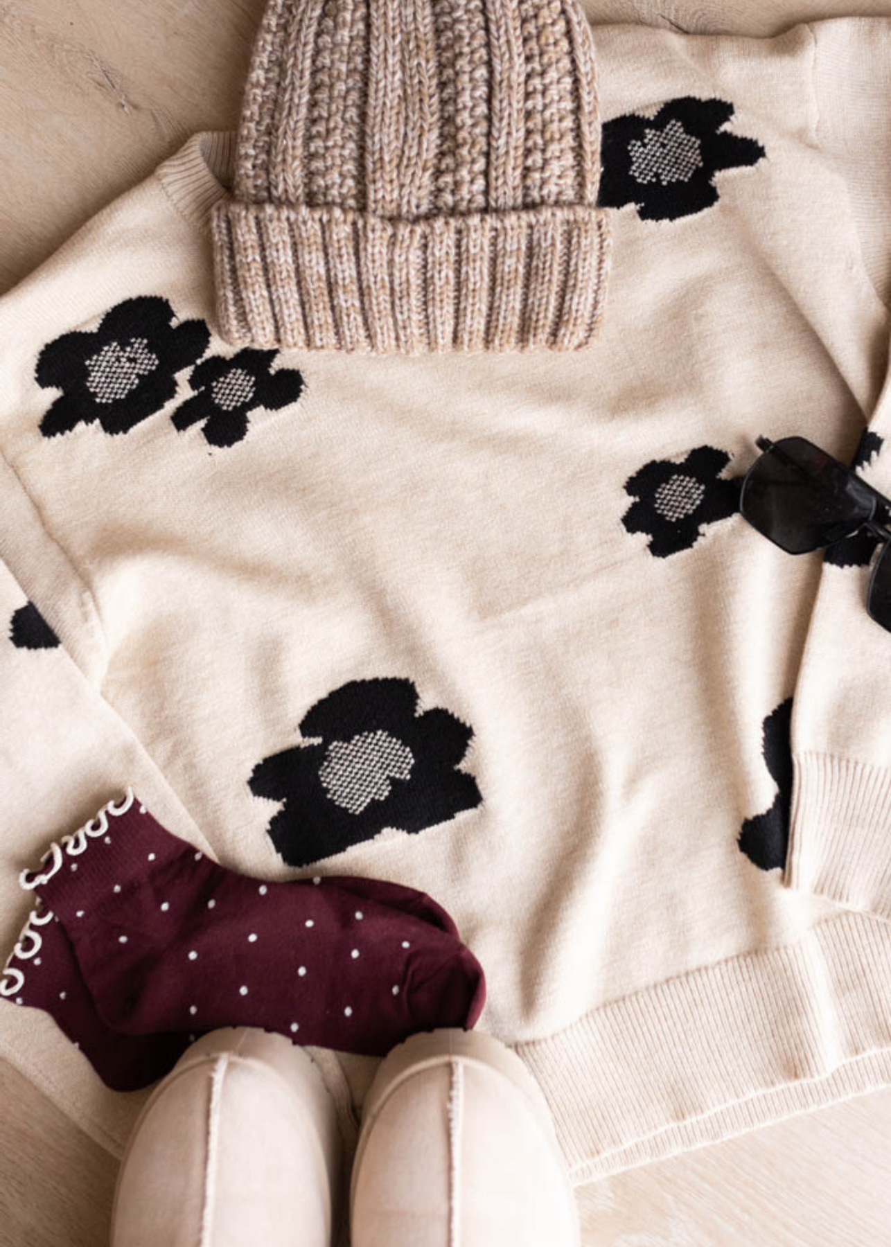 - Neutral khaki base with a fun black daisy print on the front & sleeves