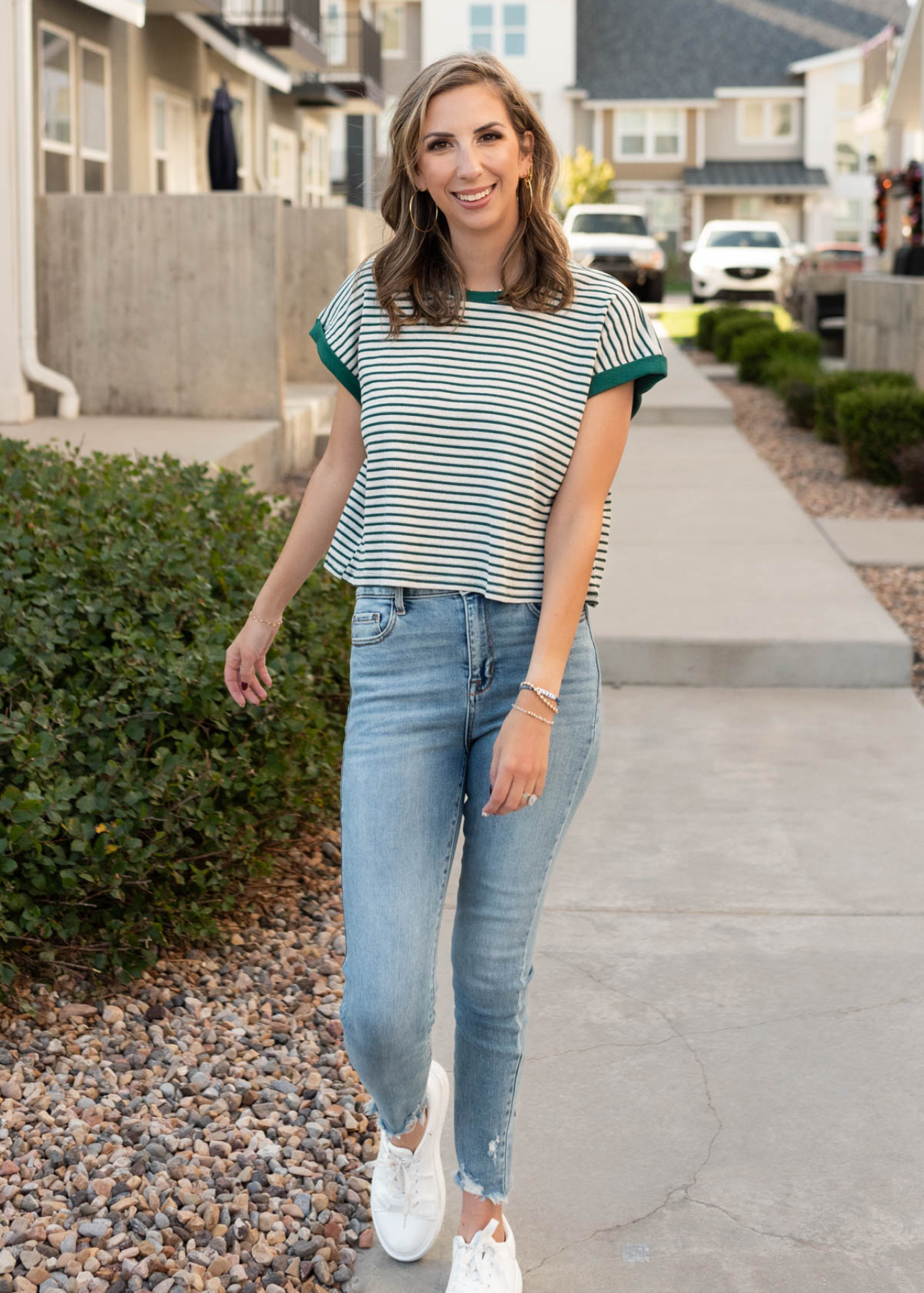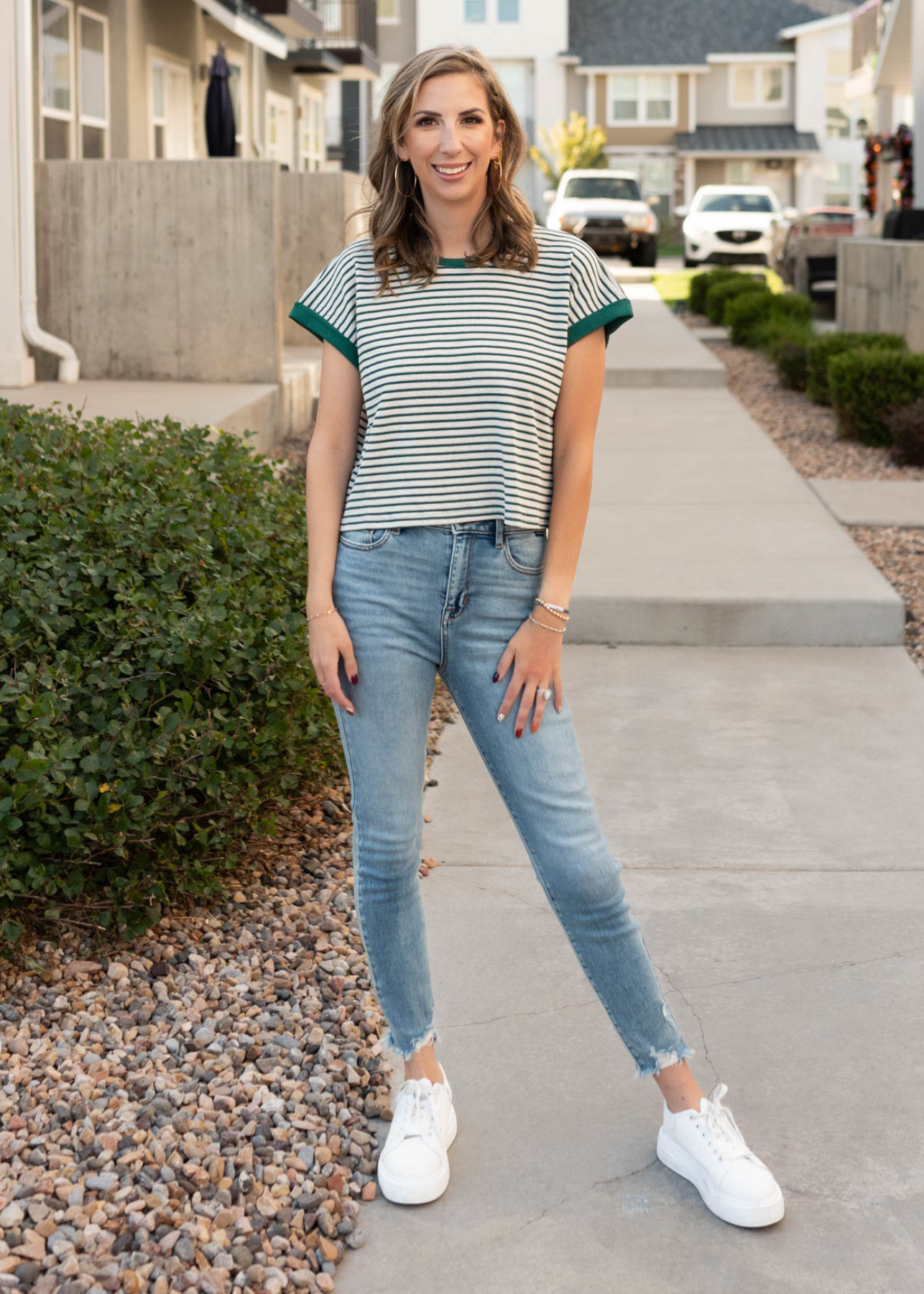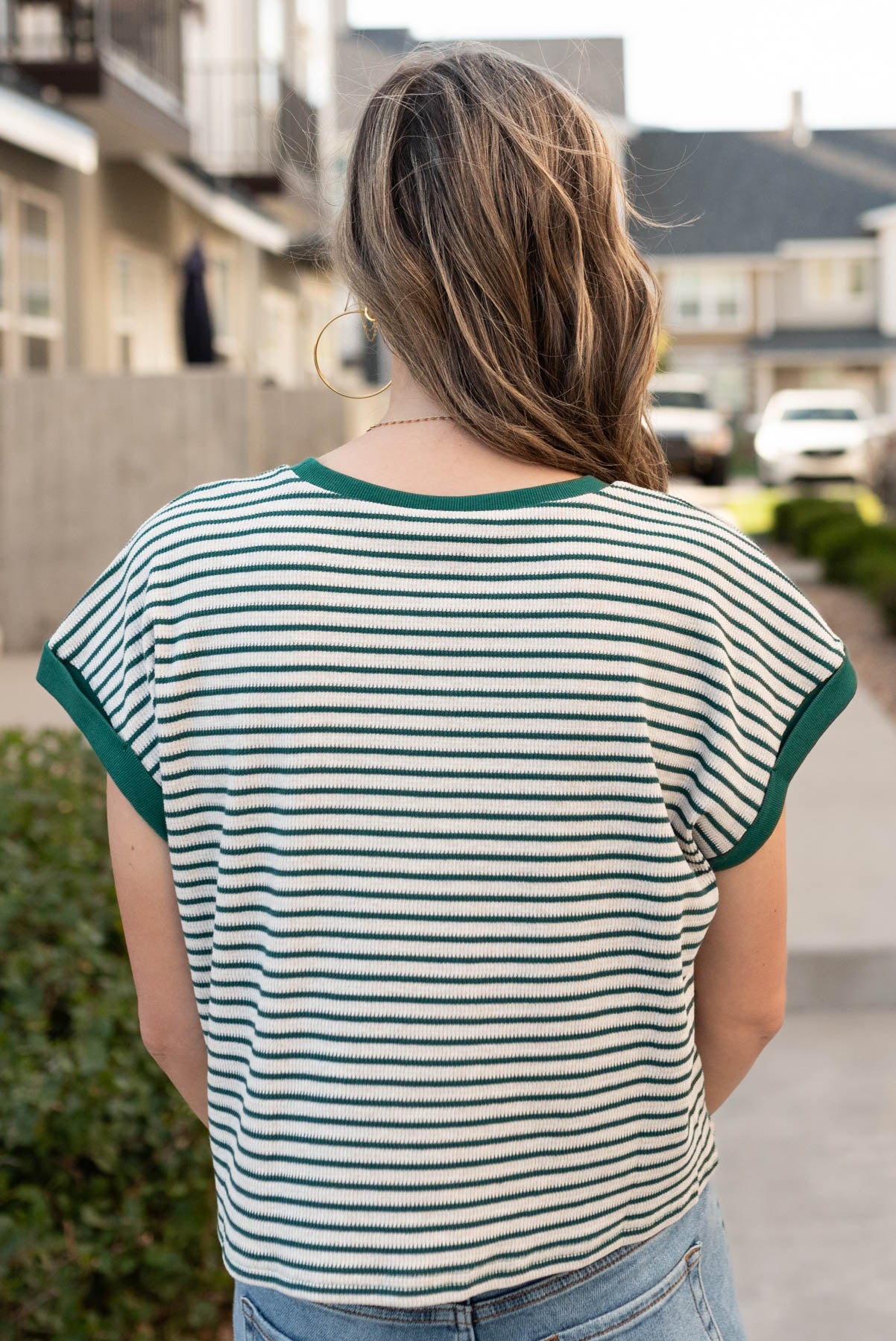- Slight waffle texture with solid trim on the neckline and sleeves
