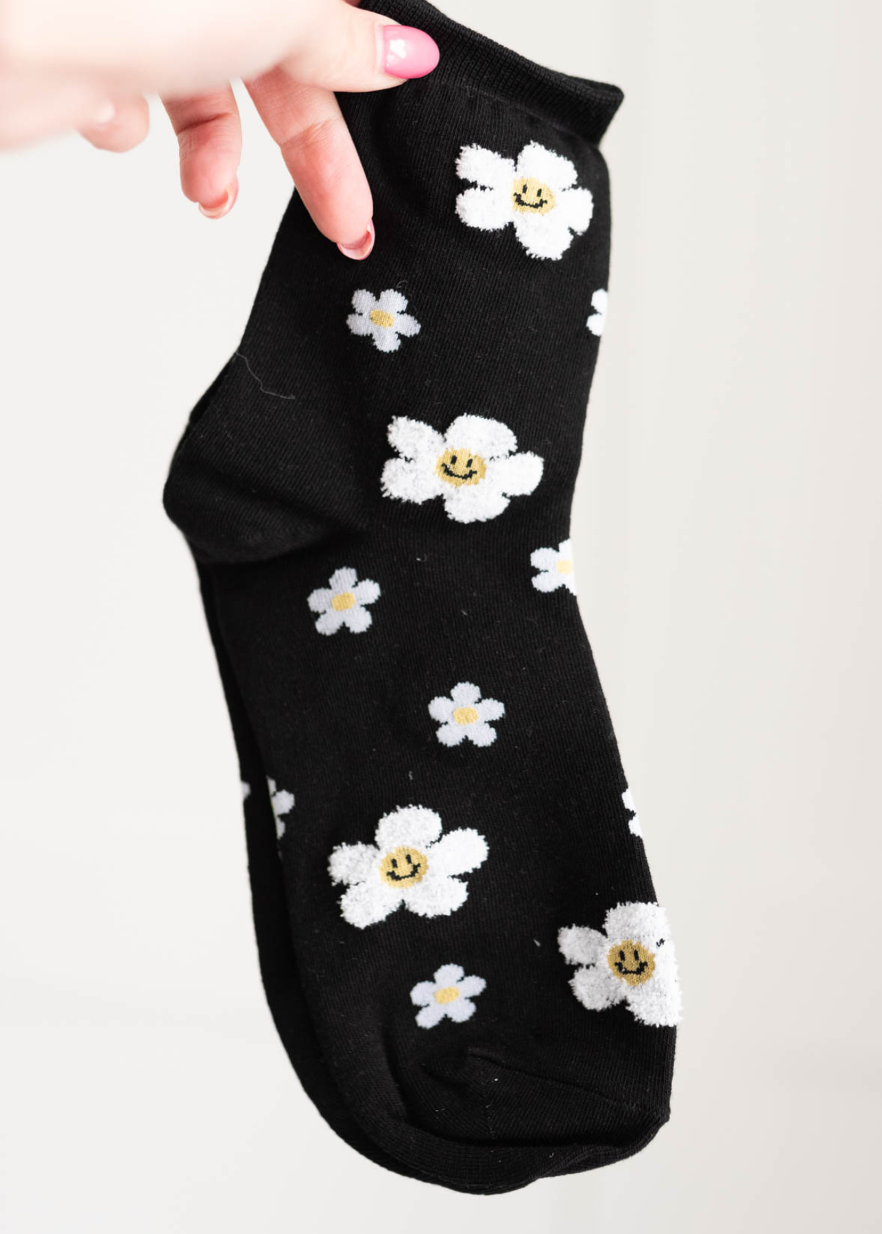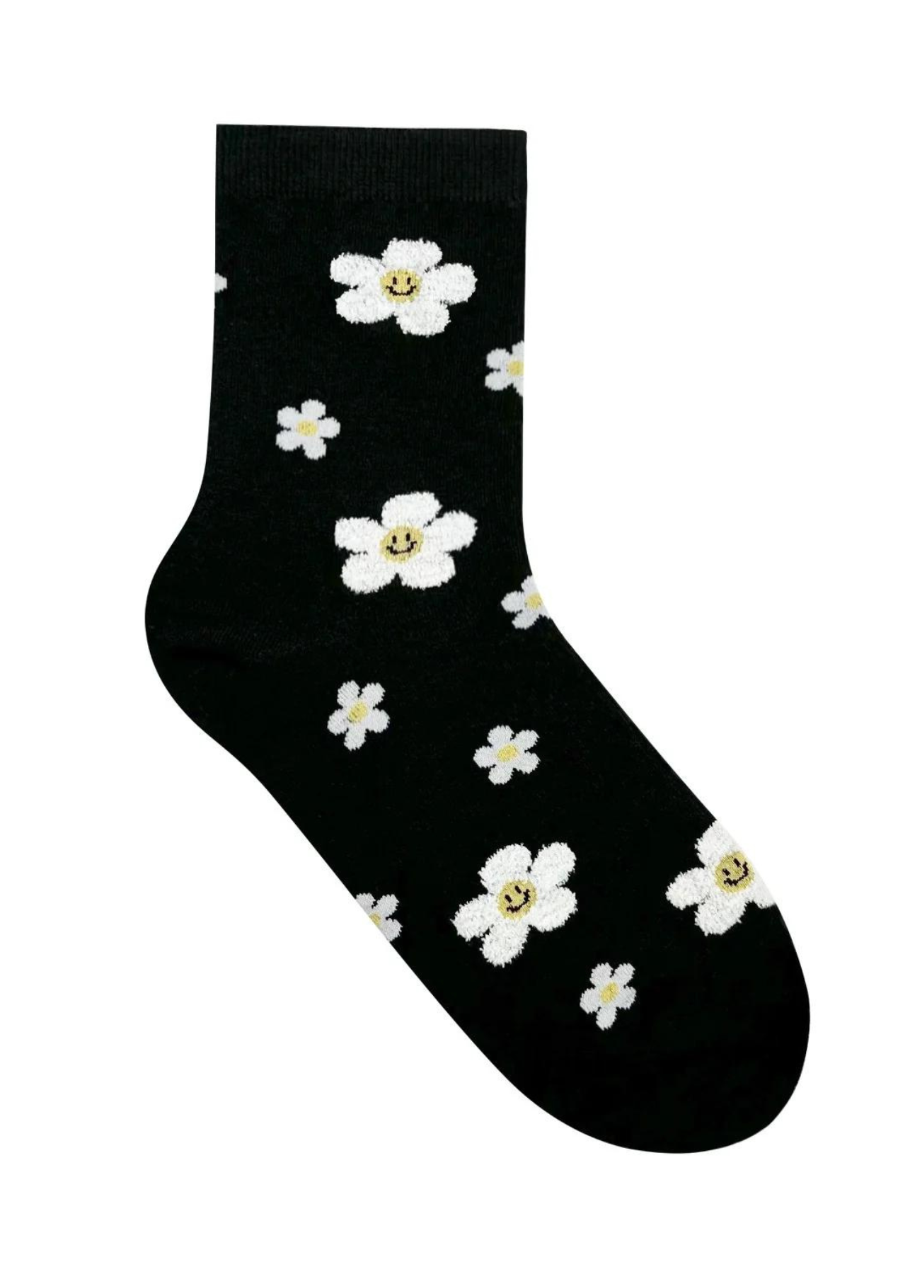 Black flower sock with smiley faces