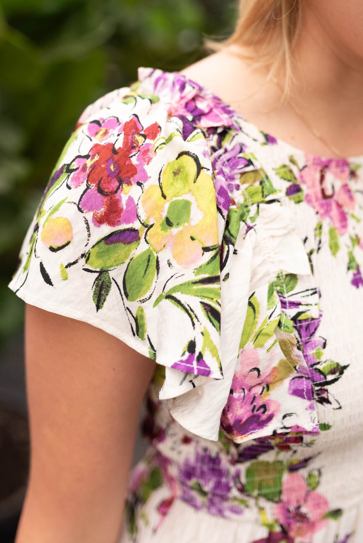 - Vibrant purple and green floral print