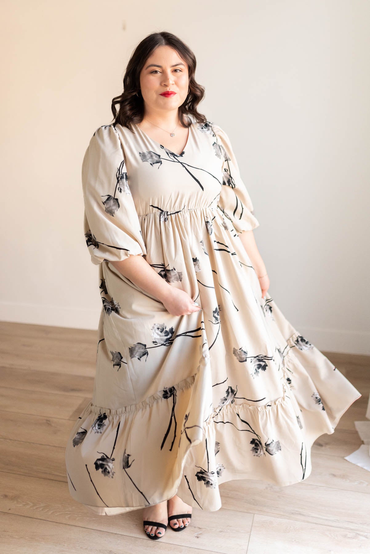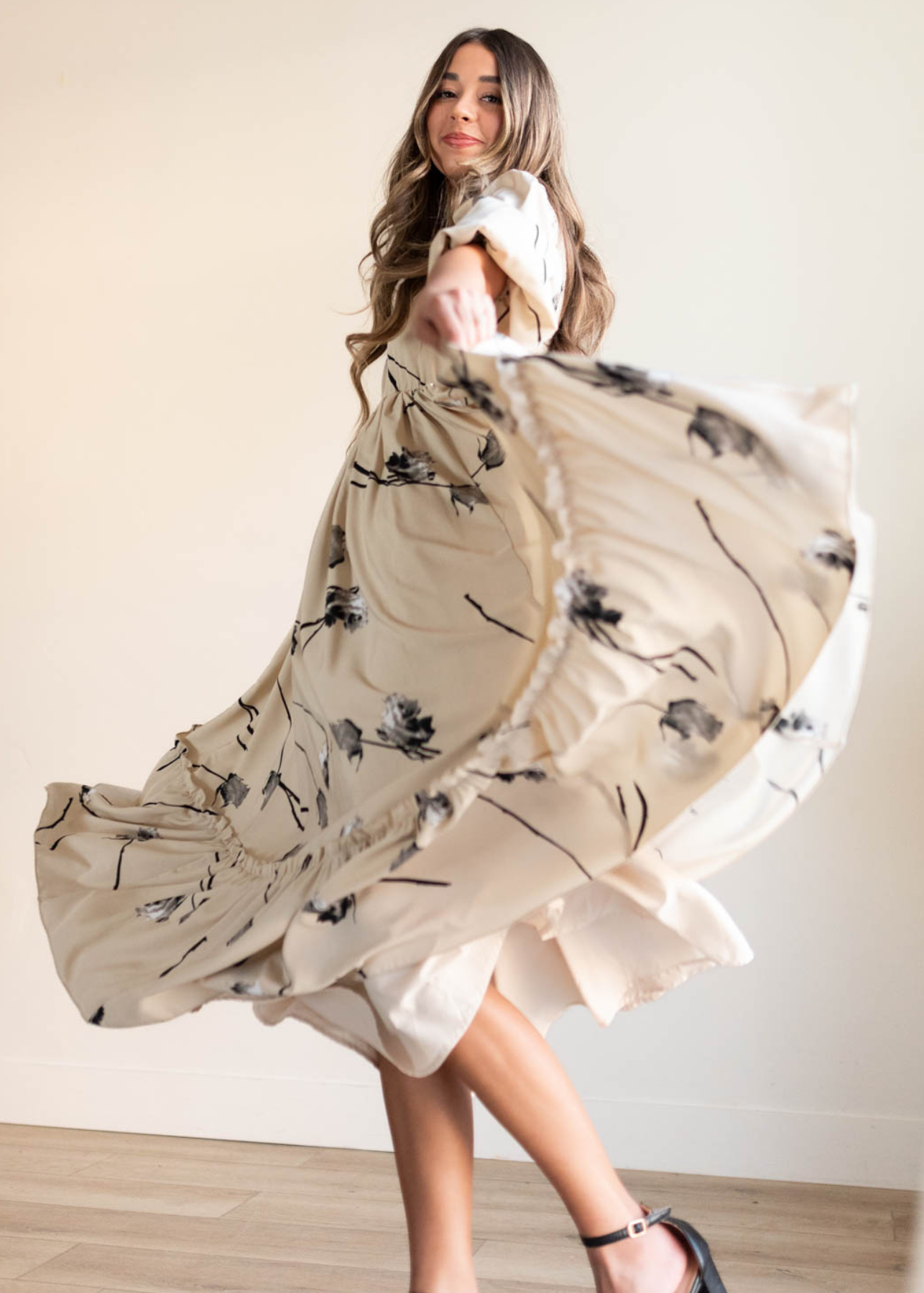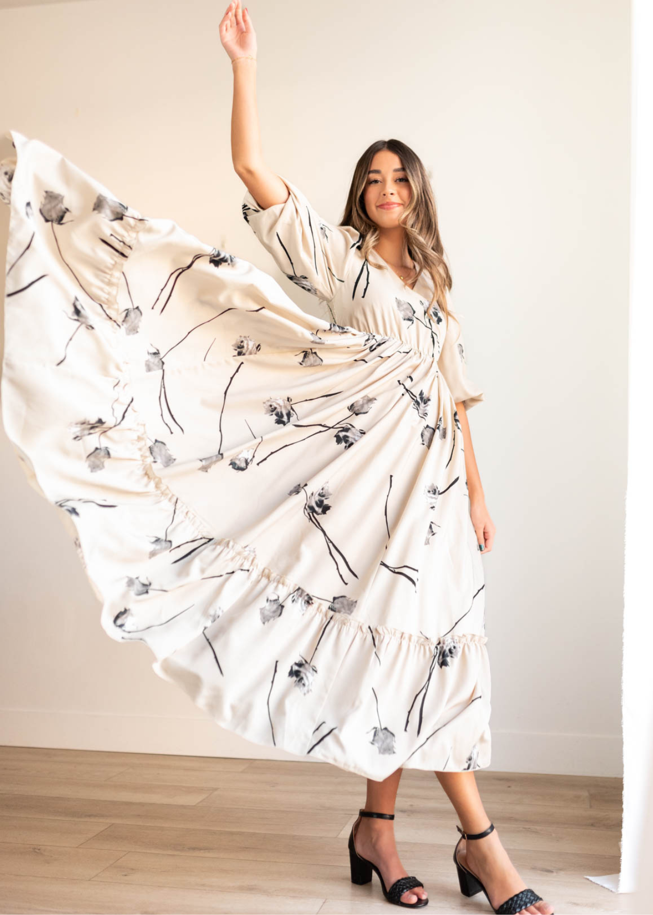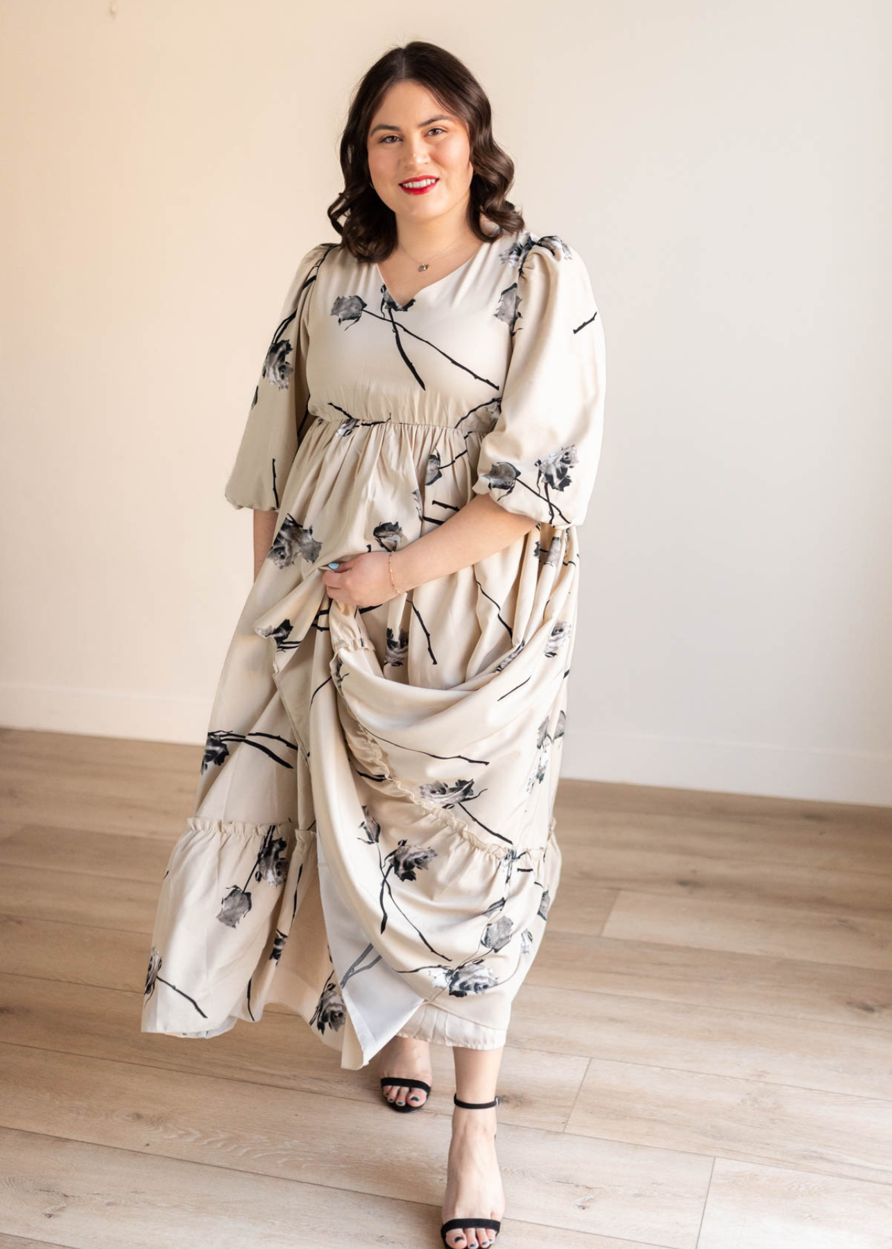 Begie floral dress with wide ruffle on hem and thee quarter sleeves