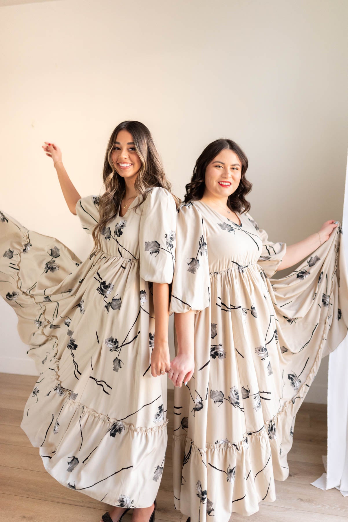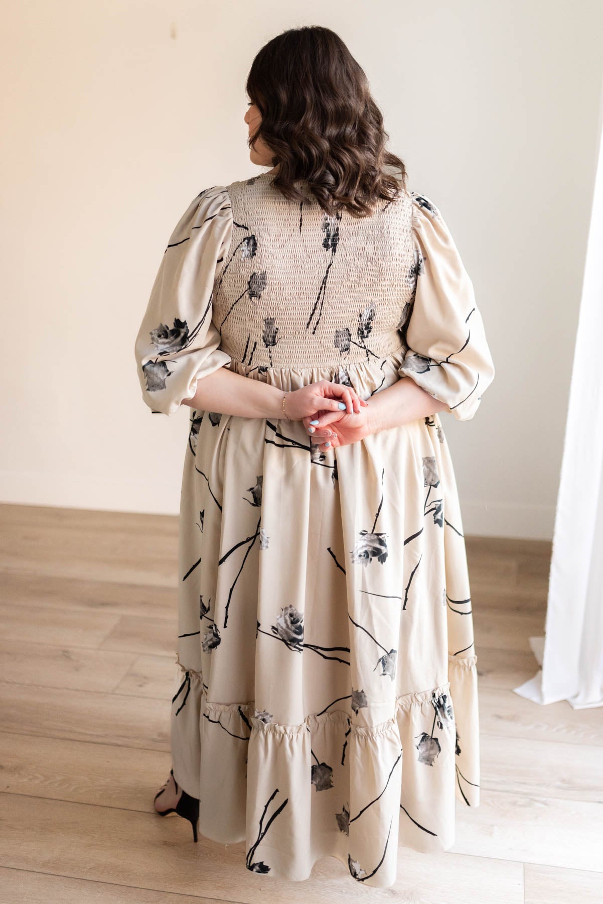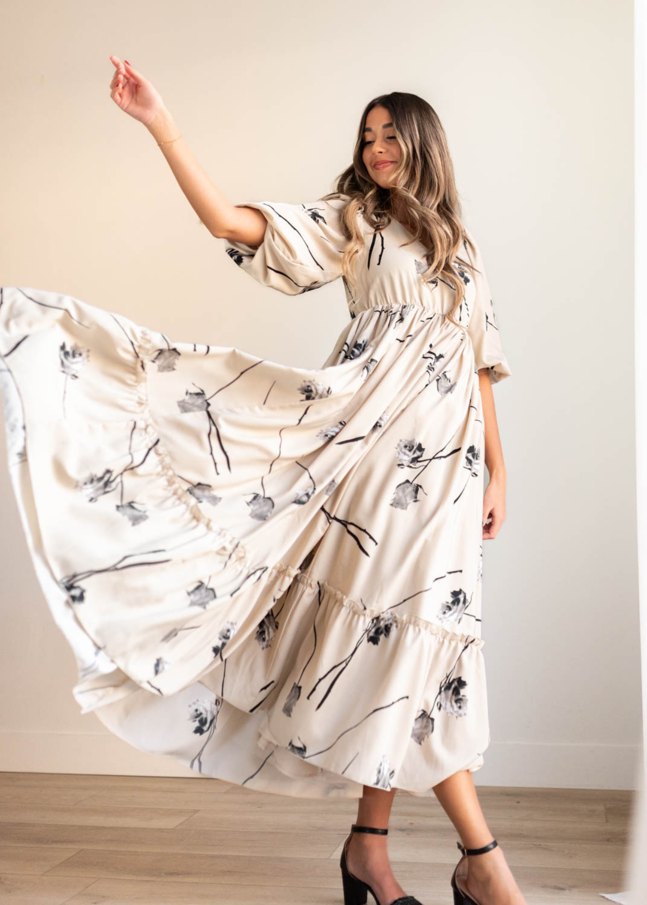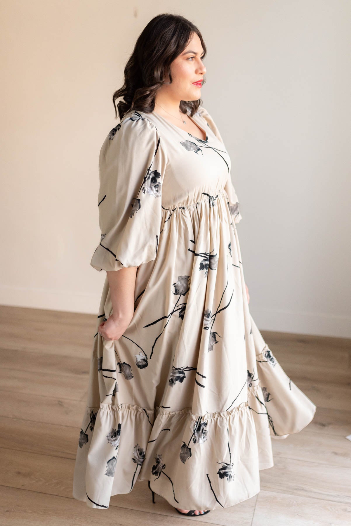 Begie floral dress with wide ruffle on hem and thee quarter sleeves