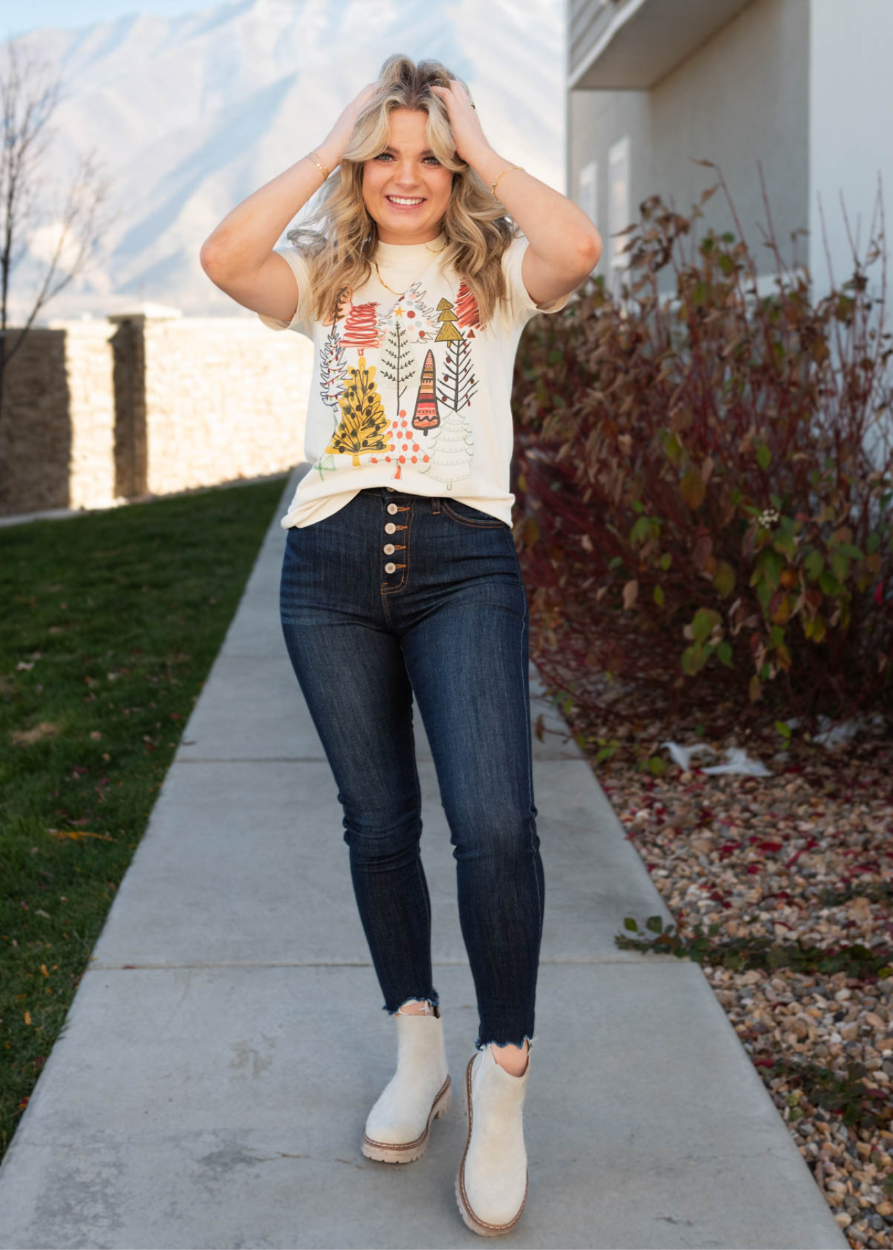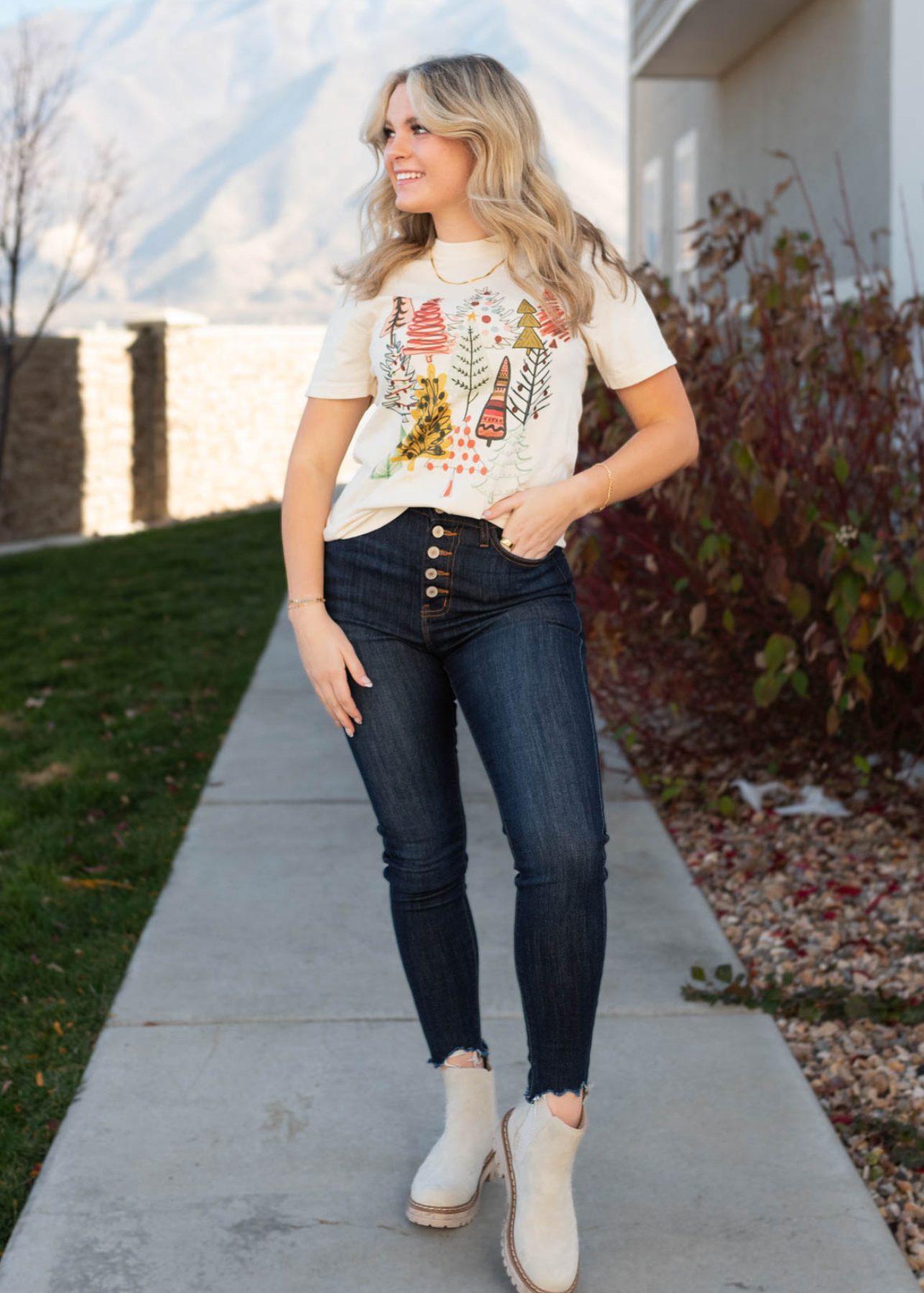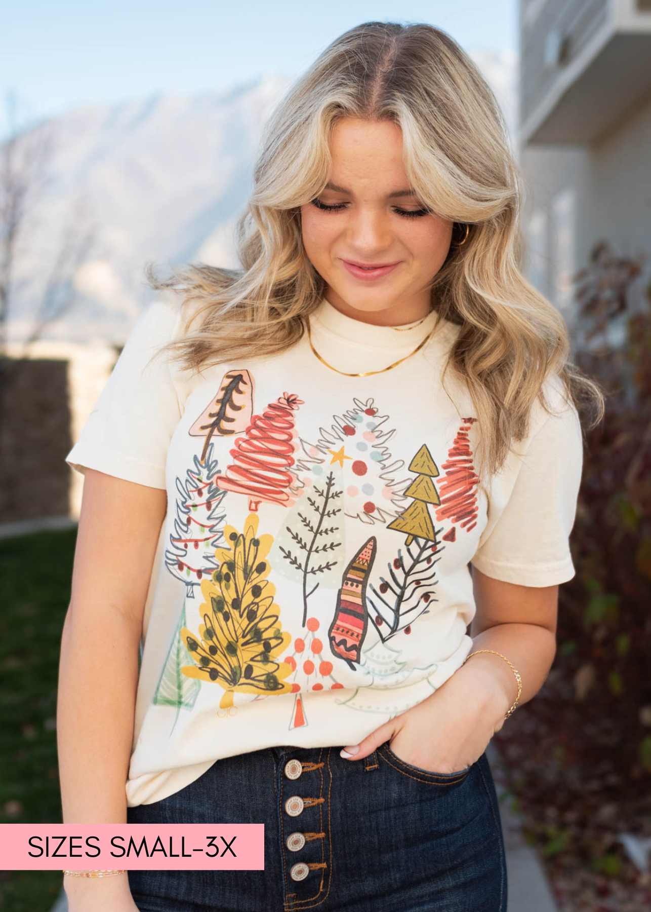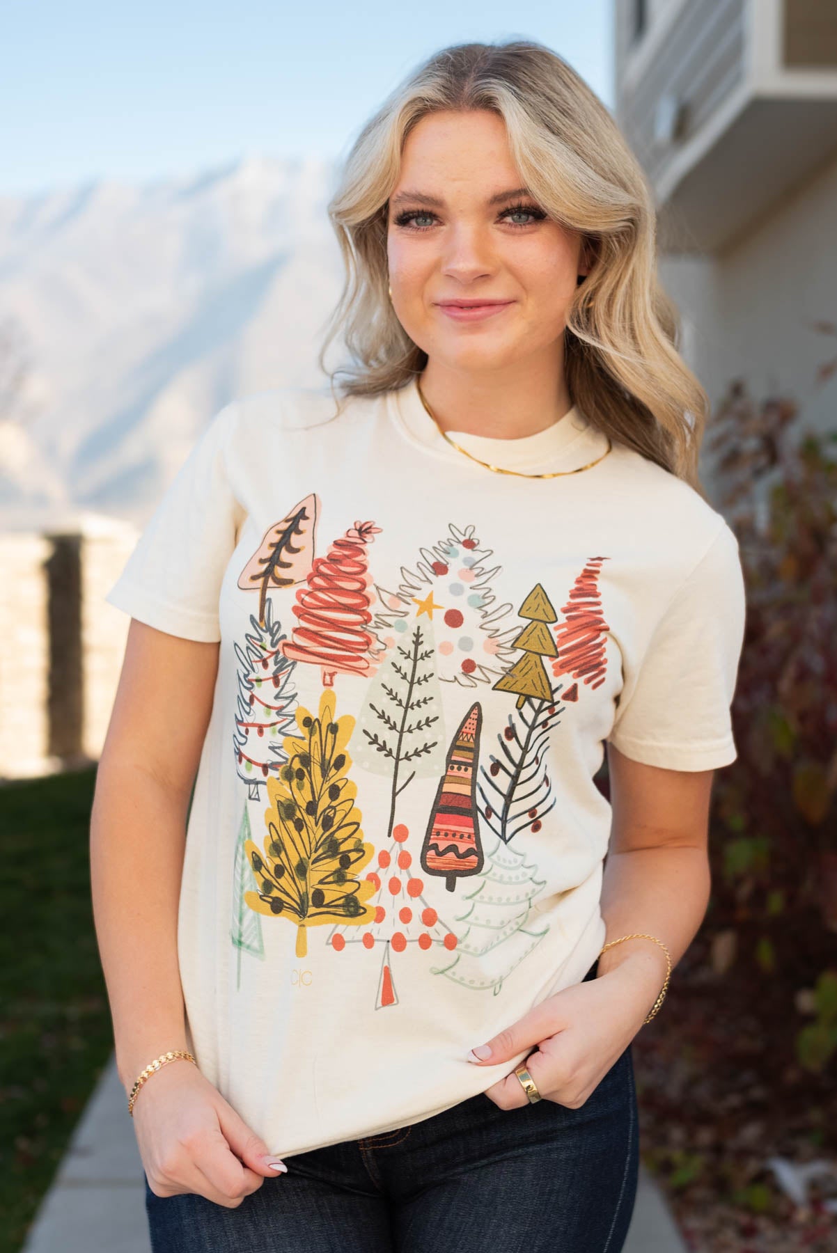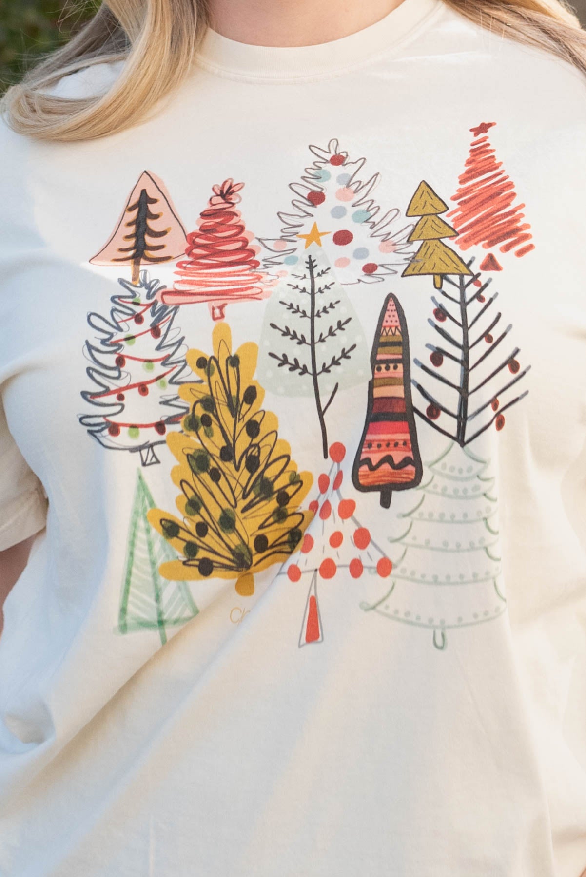 Multi color Christmas trees on a short sleeve Christmas tree shirt