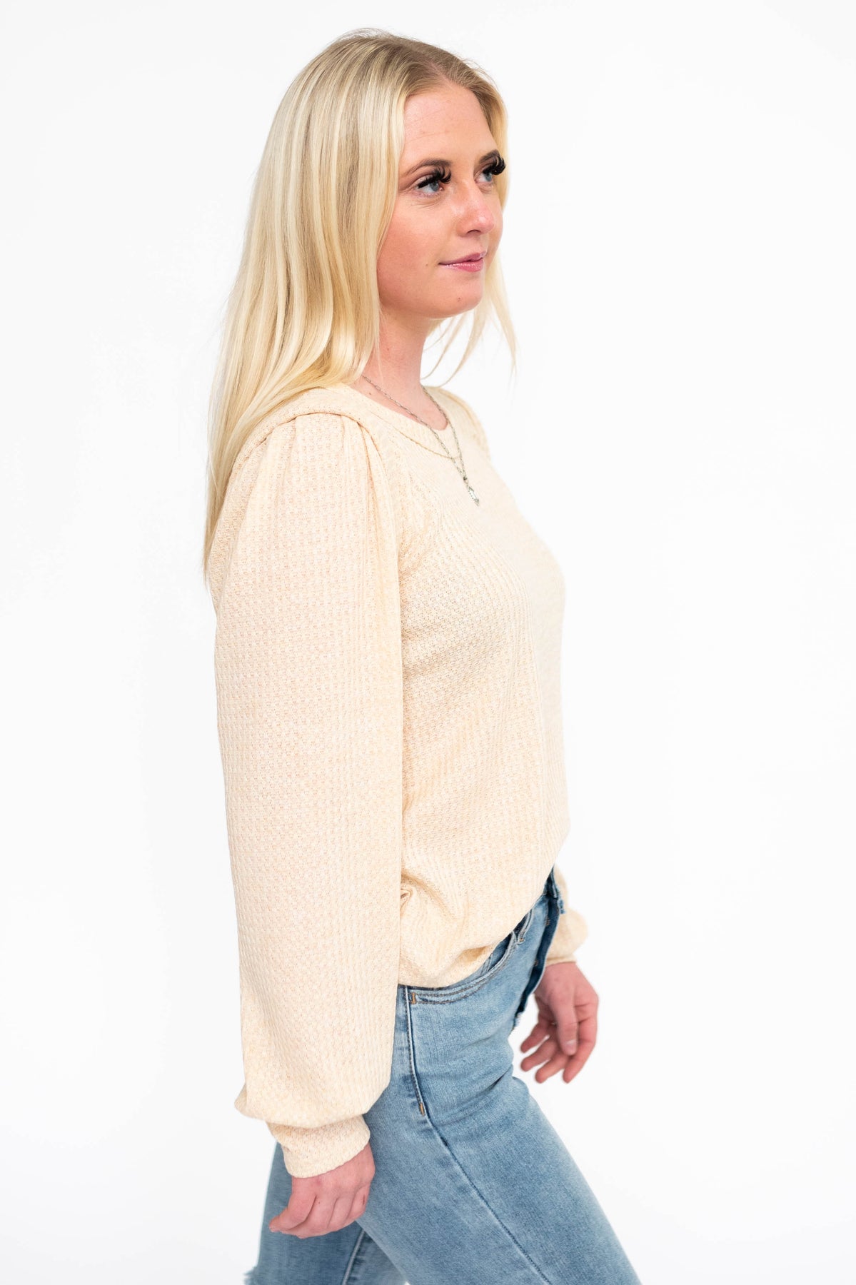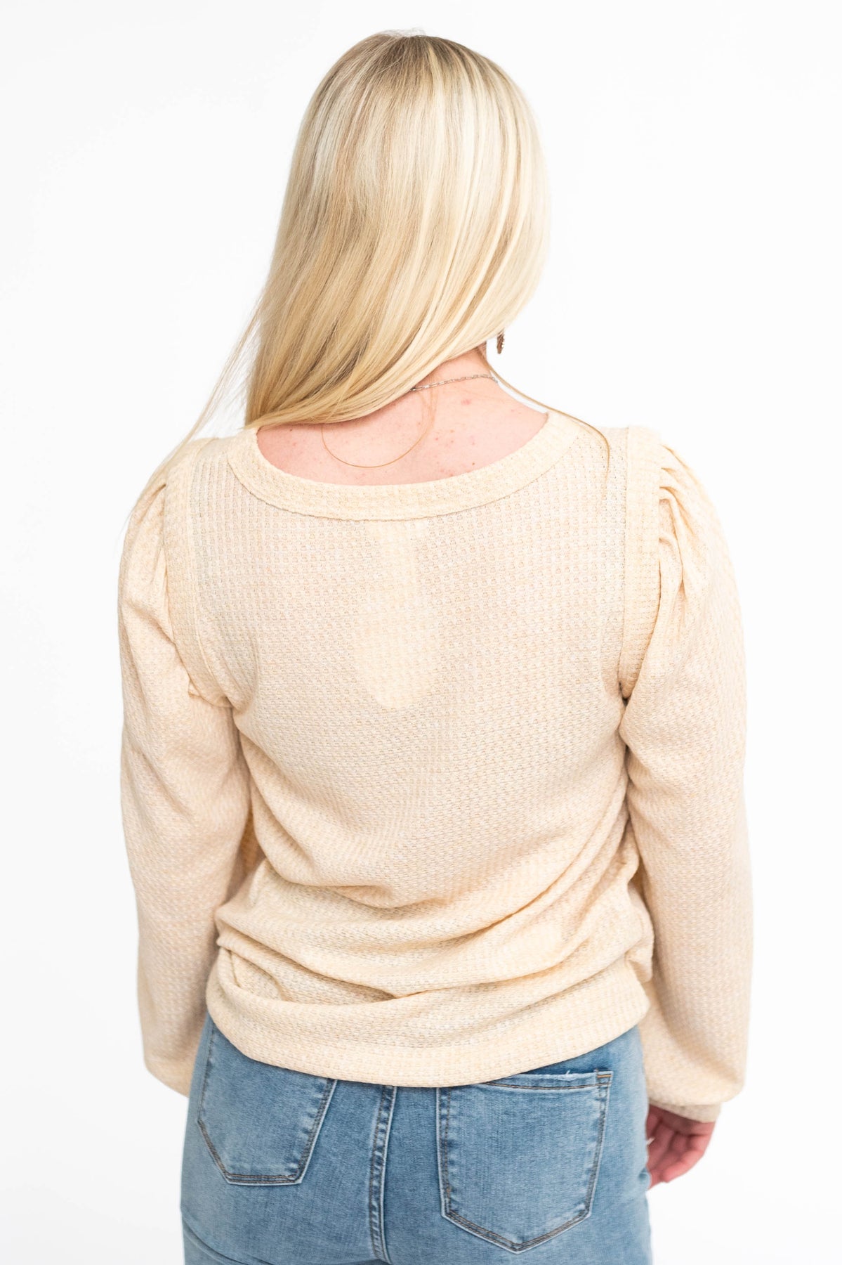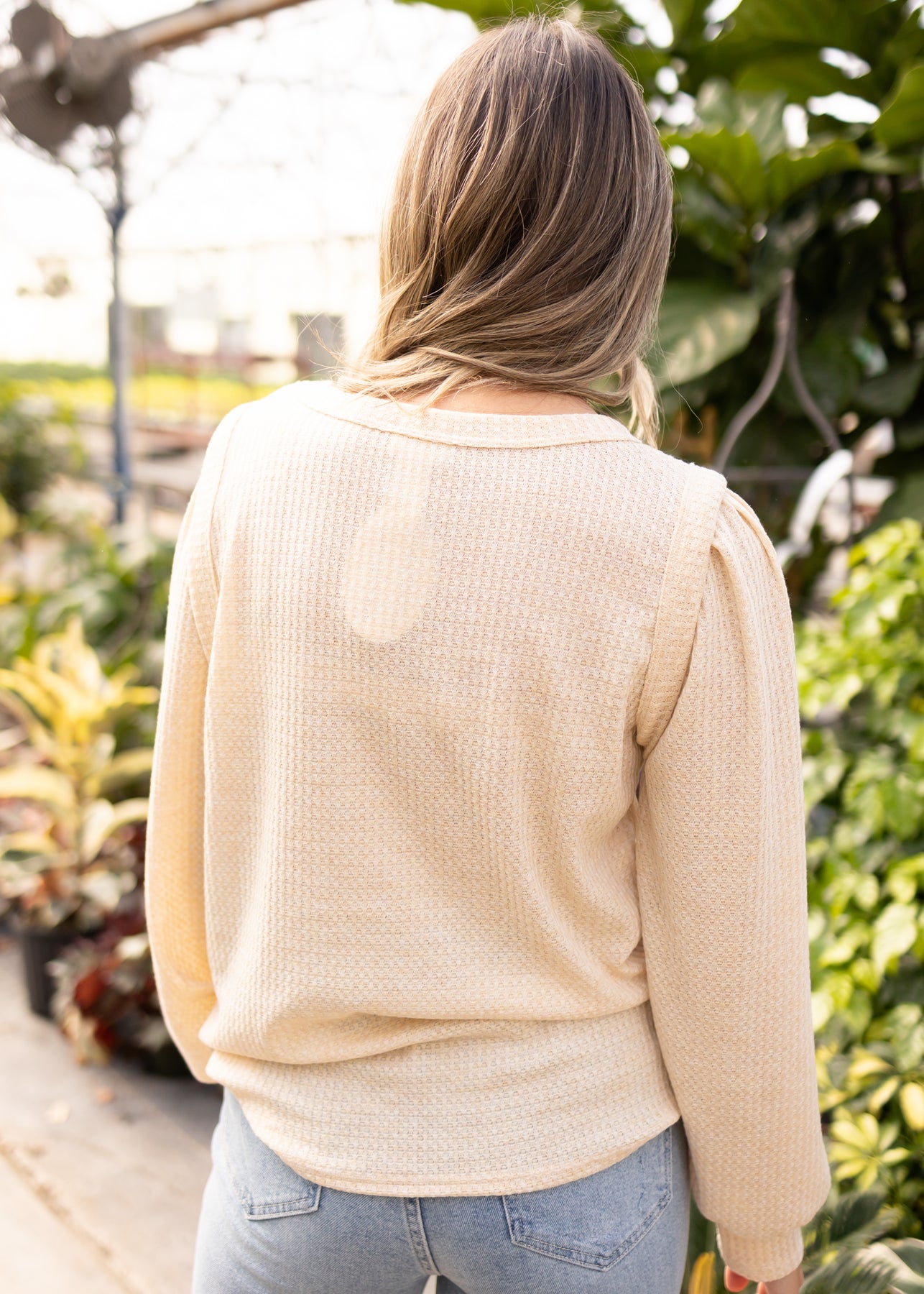 - Neutral oatmeal + soft waffle knit fabric that's lightweight so you won't overheat