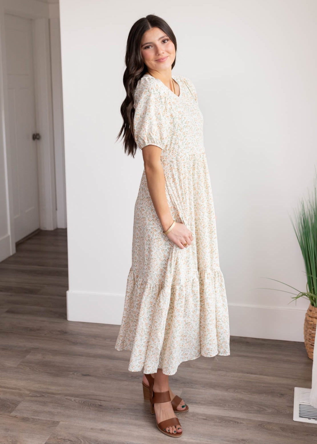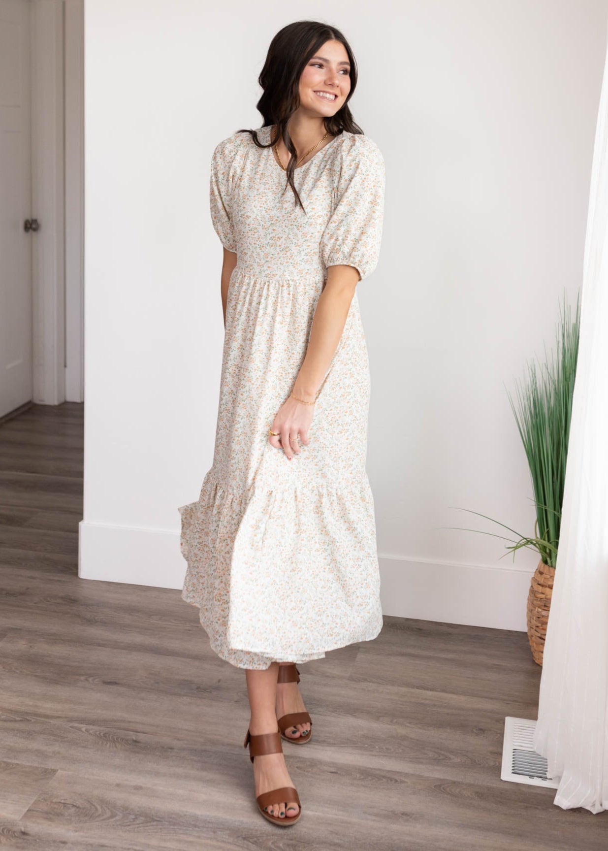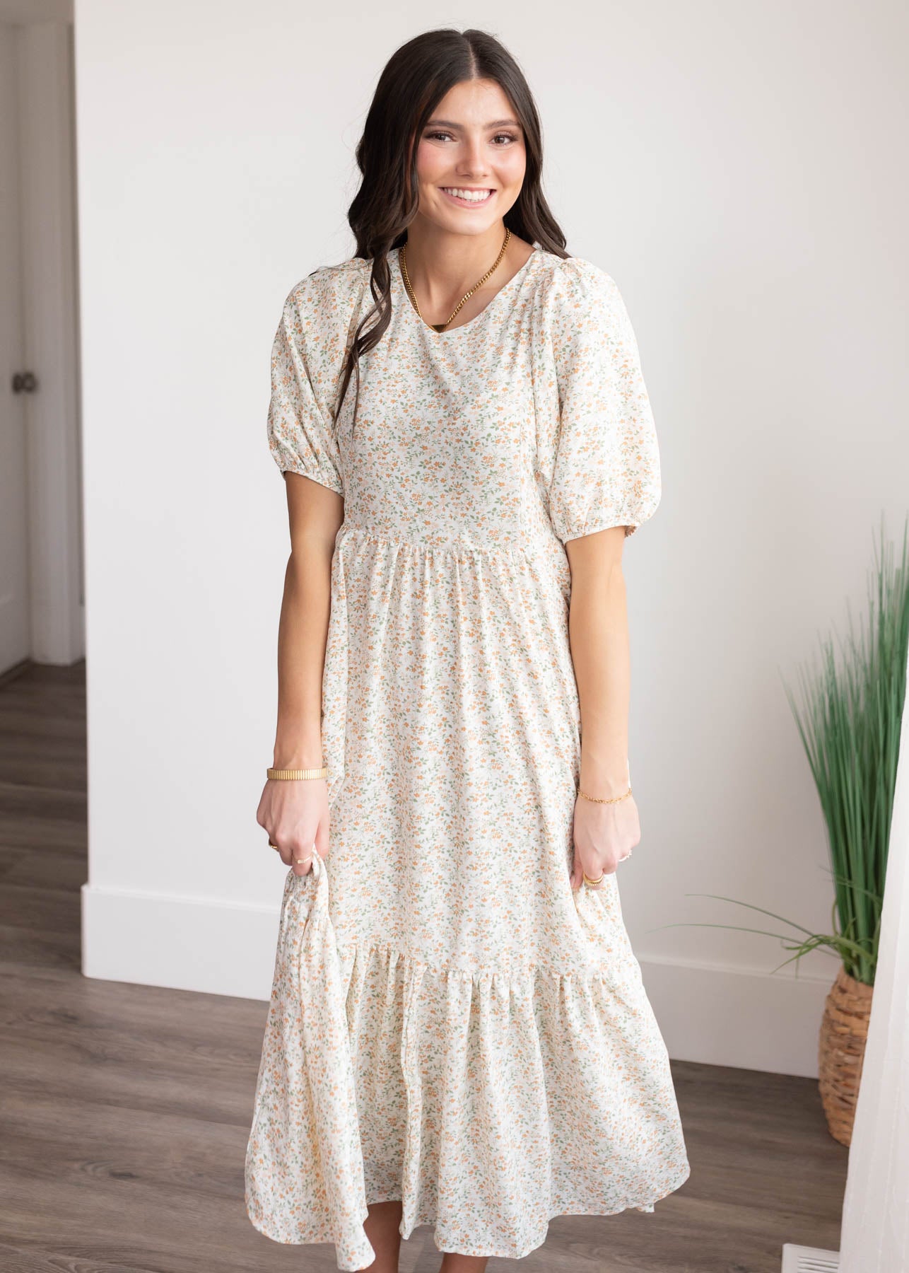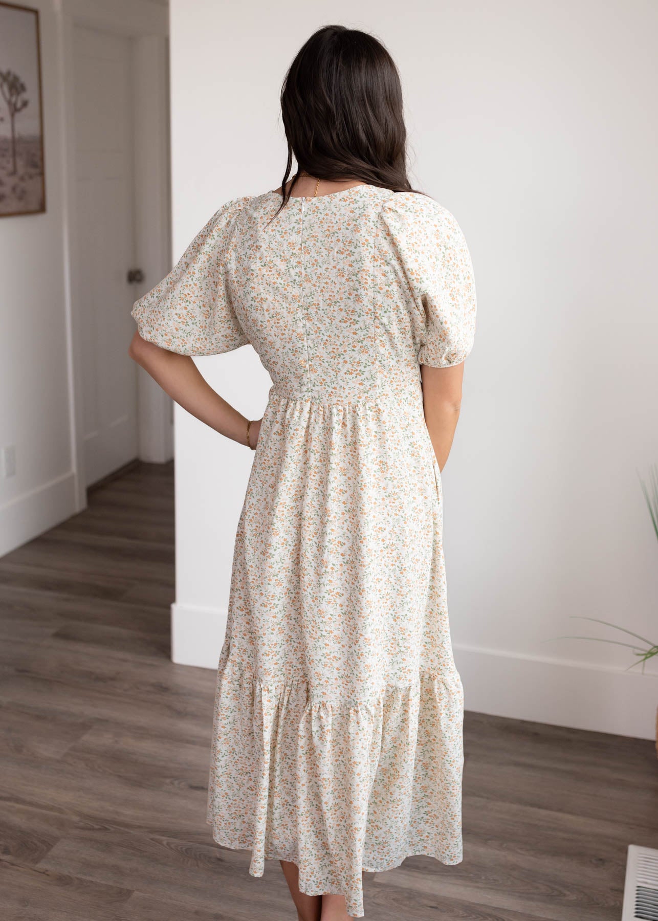 Close up of the fabrc pattern and sleeve on the orange floral dress