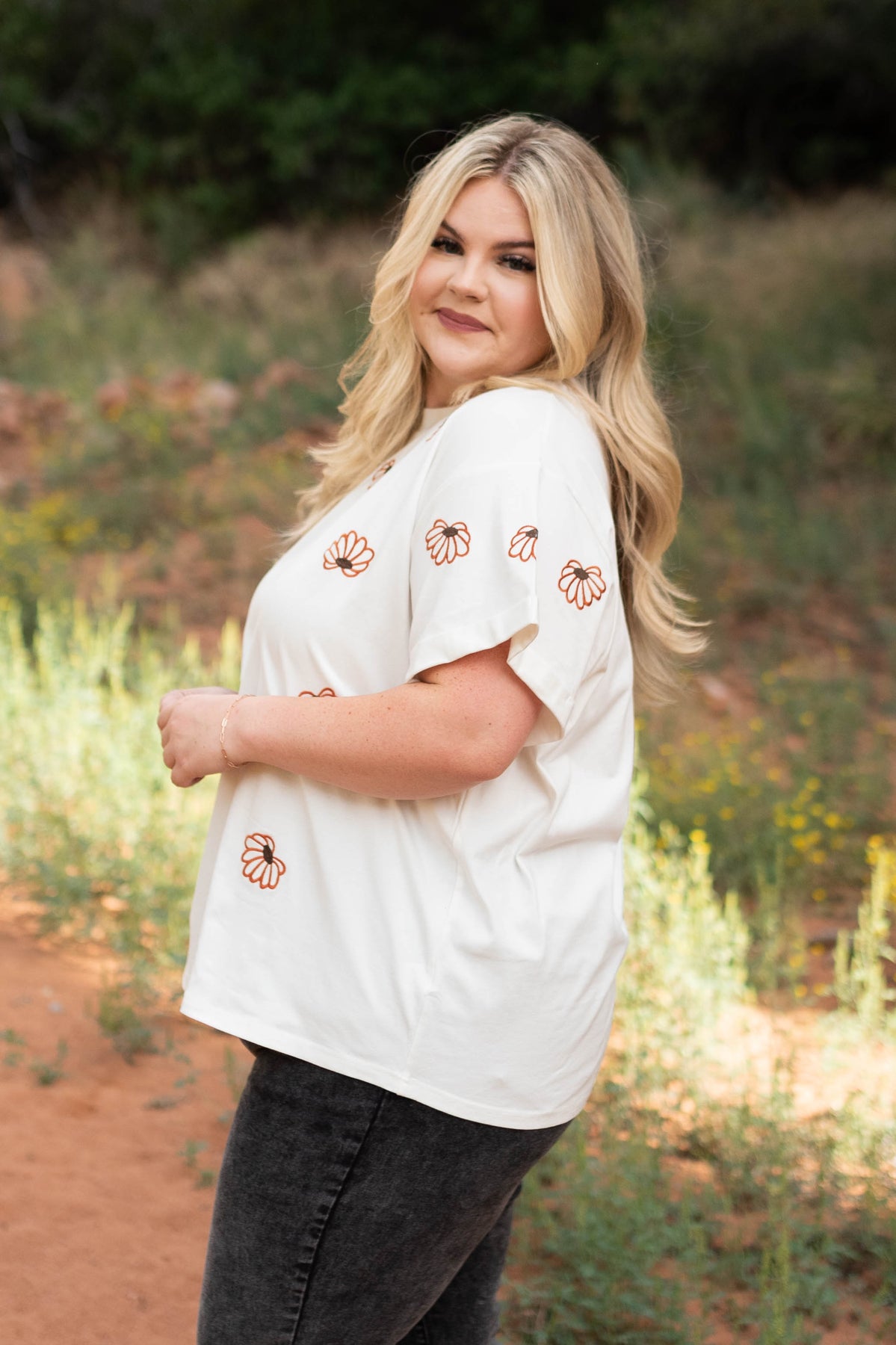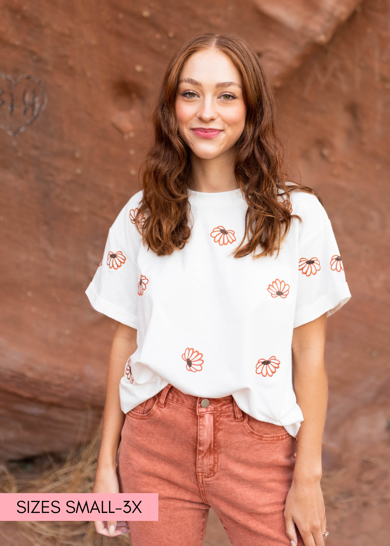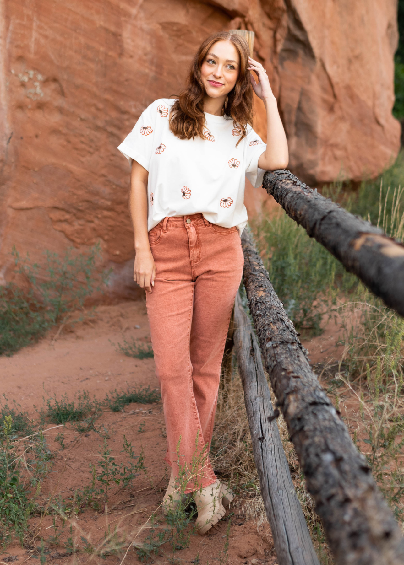 - Ivory with a rust embroidered floral print