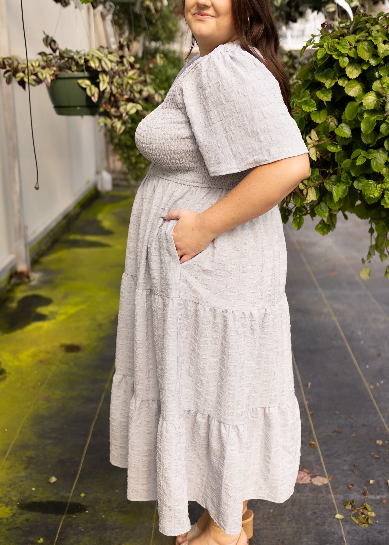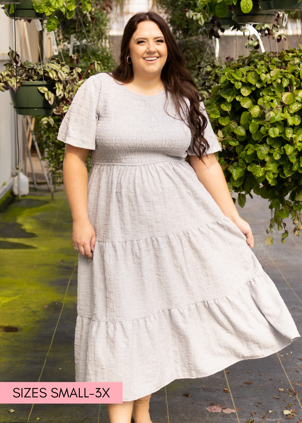 Short sleeve plus size grey dress with smocked bodice and tiered skirt