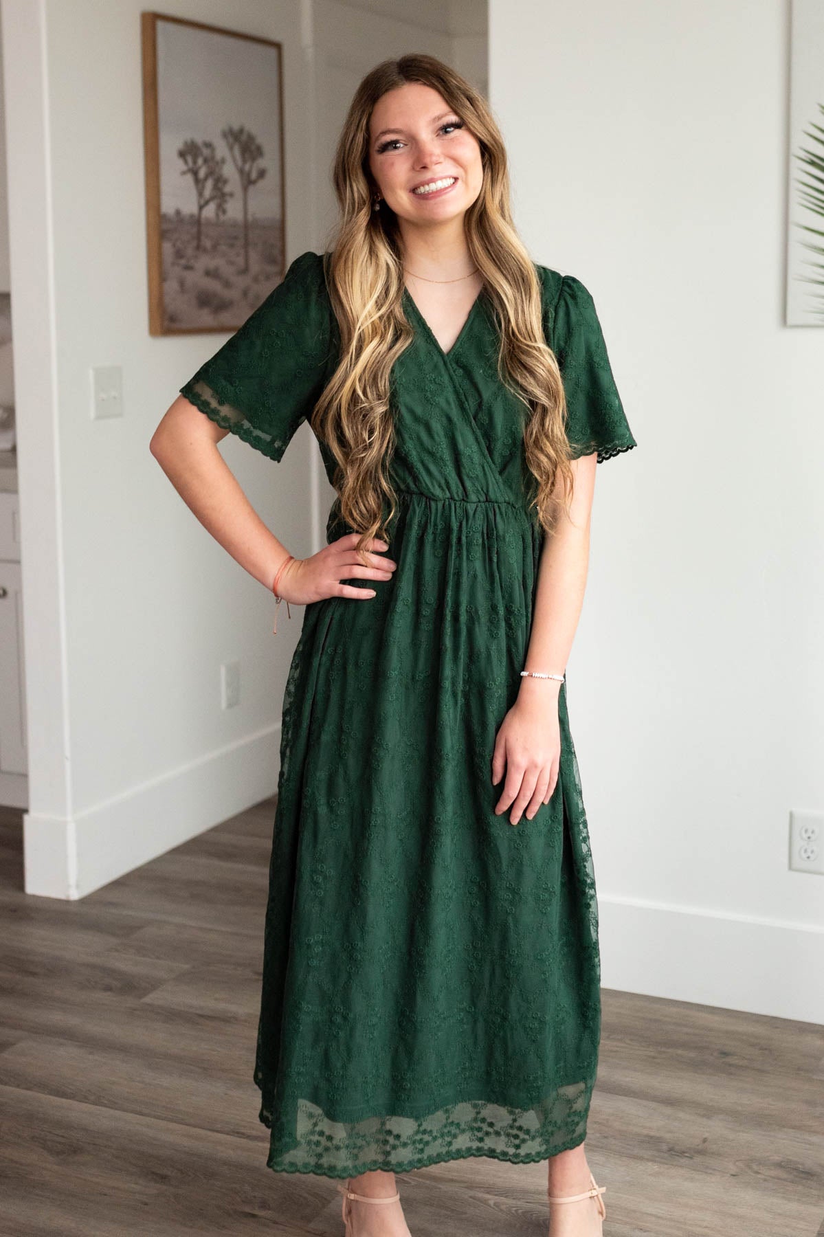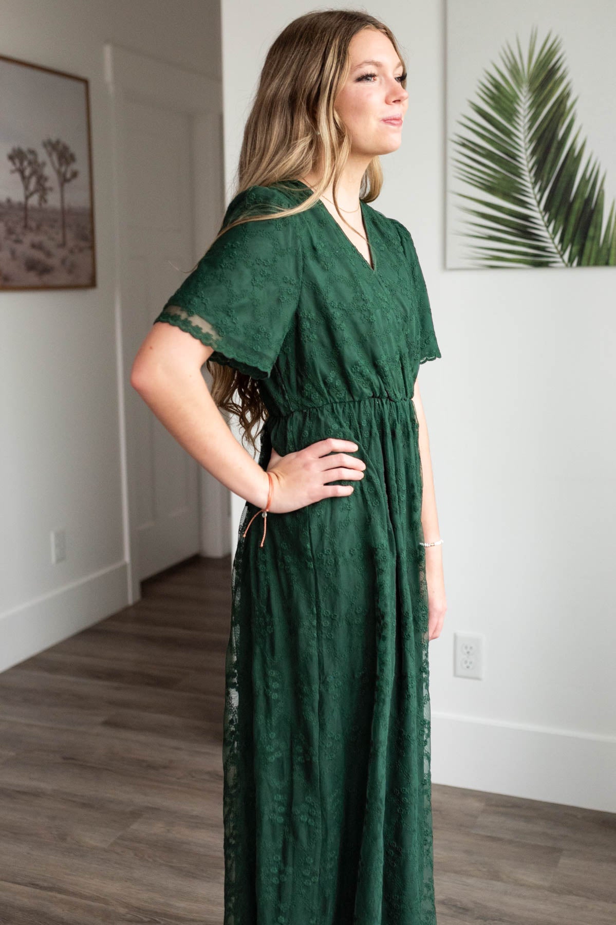 Close up of the sleeve and lace on the hunter green lace floral dress