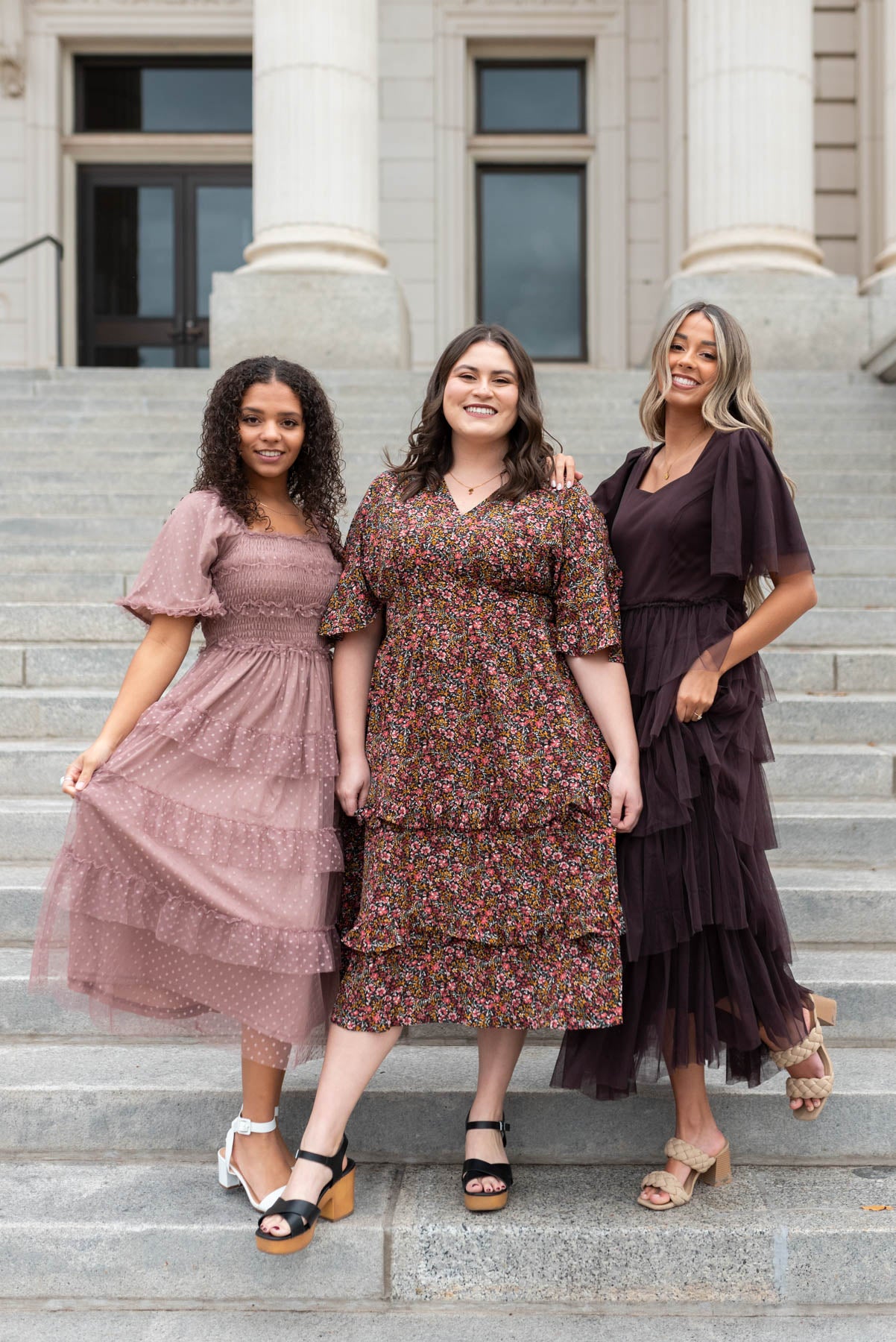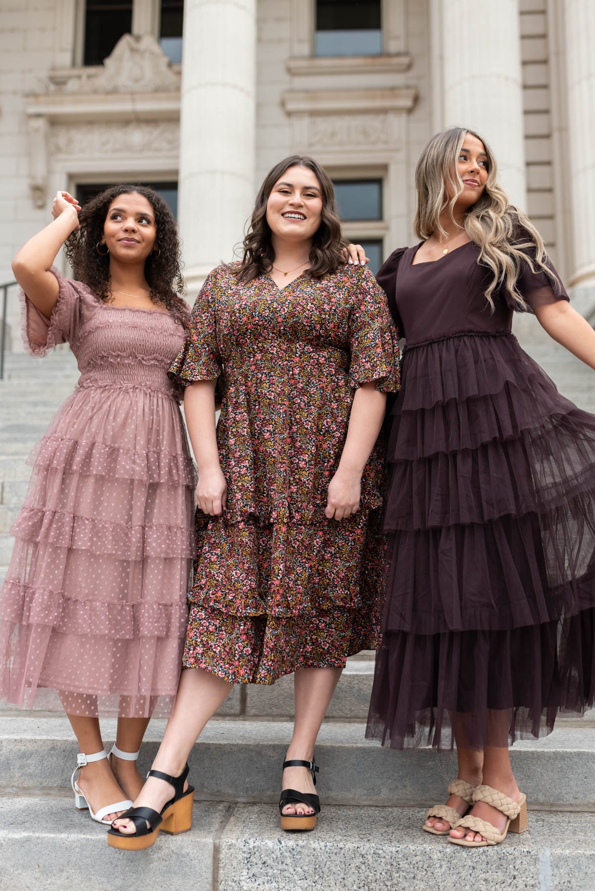 - Such a unique dress! Can't get enough of the dusty rose and flowy tiered fit