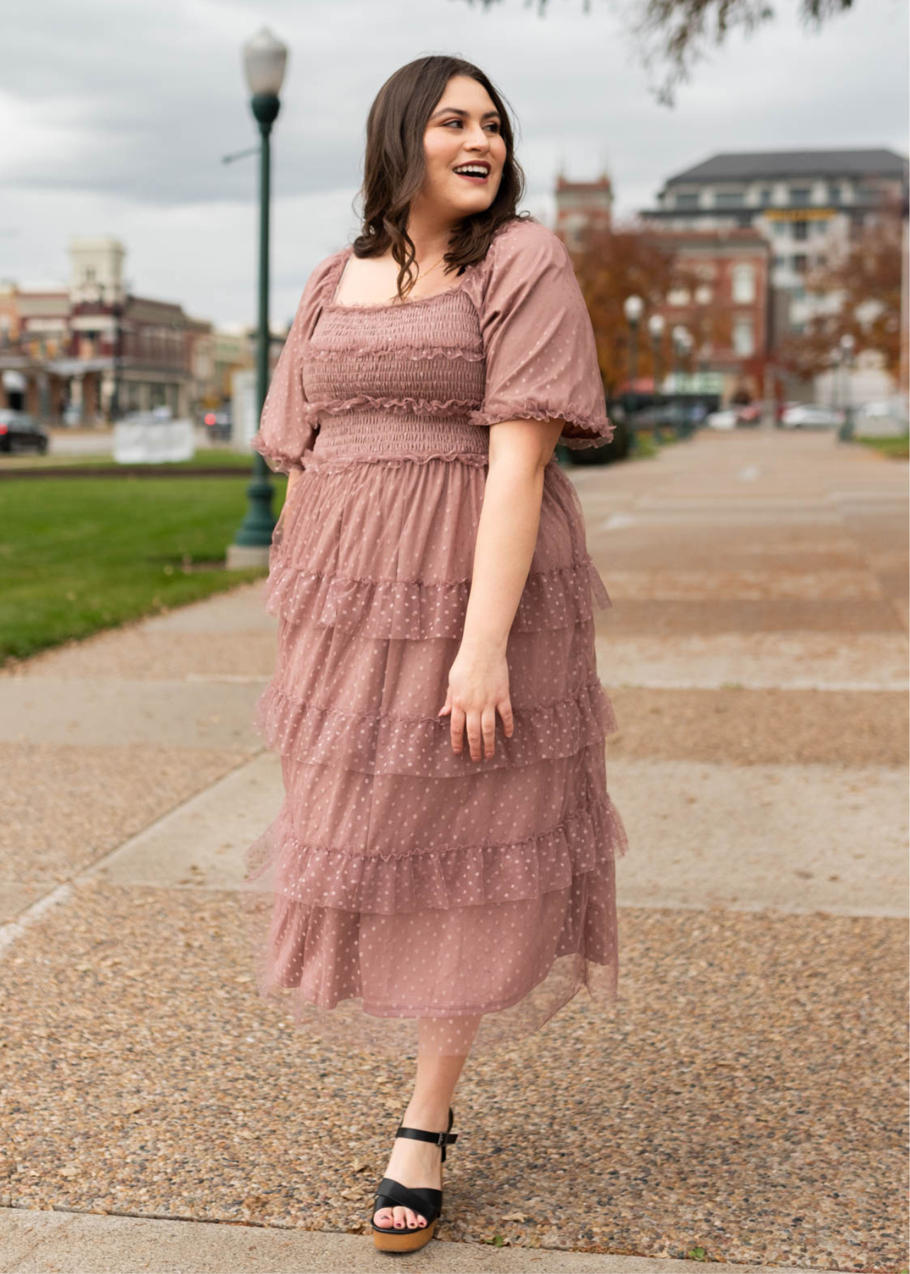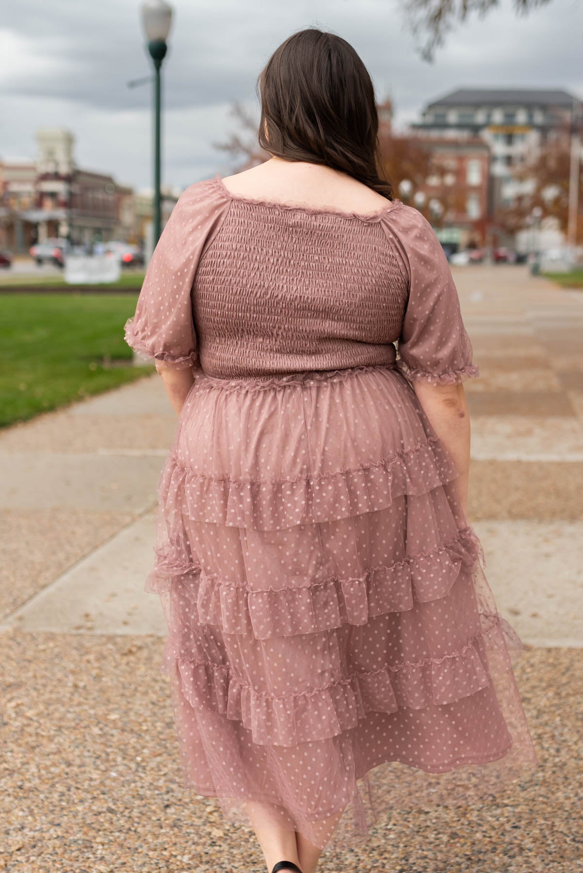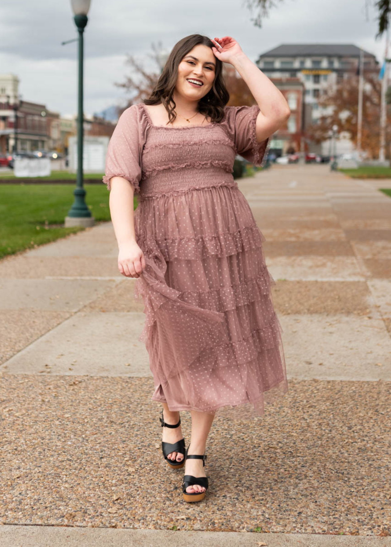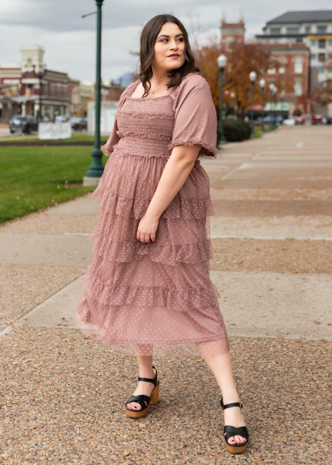 Plus size dusty rose dress with short sleeves and tulle ruffles